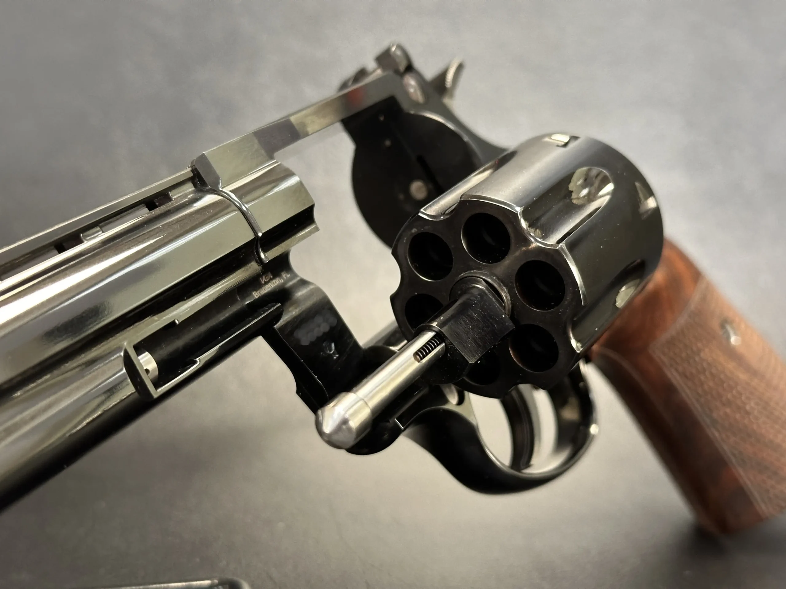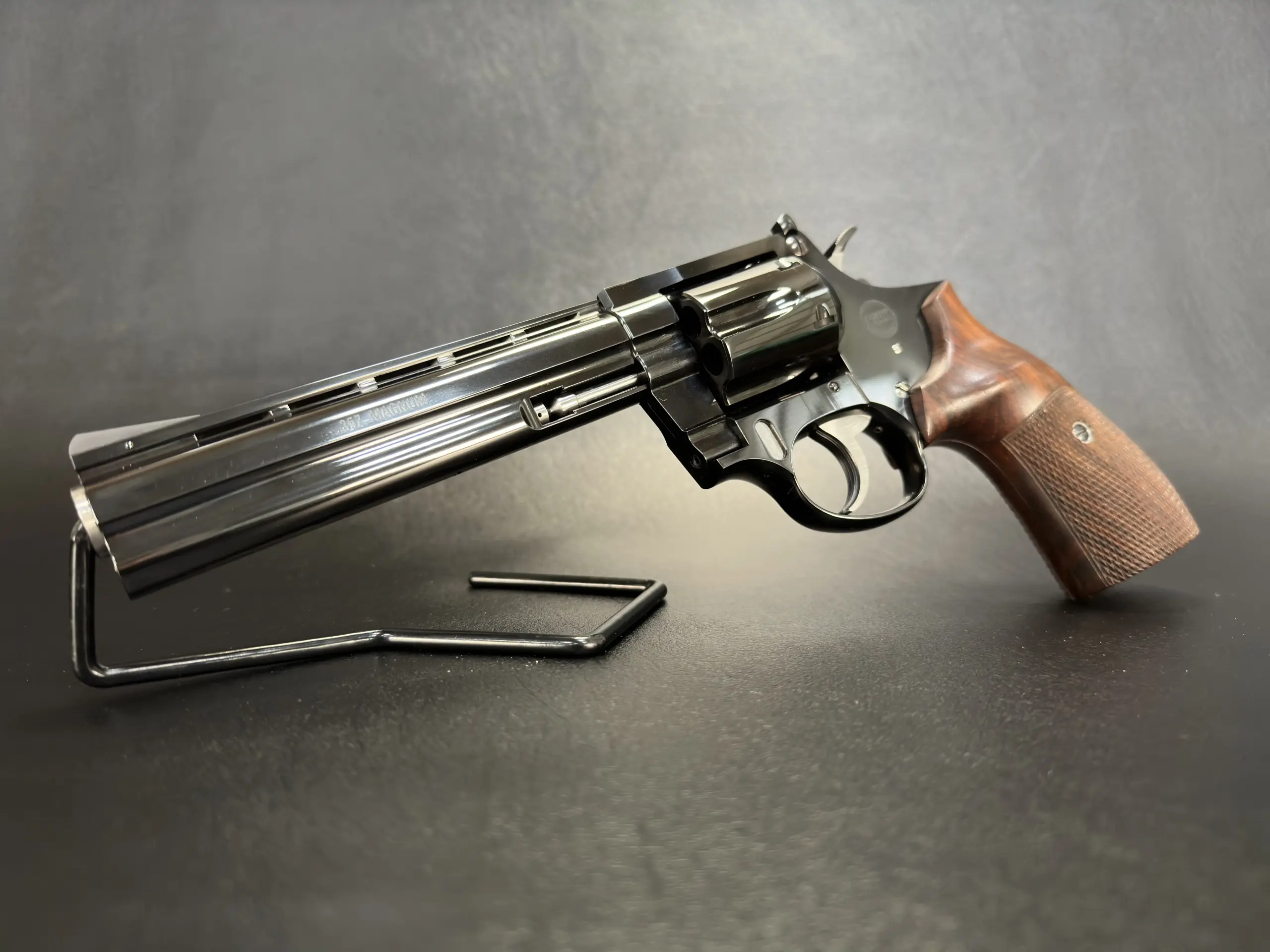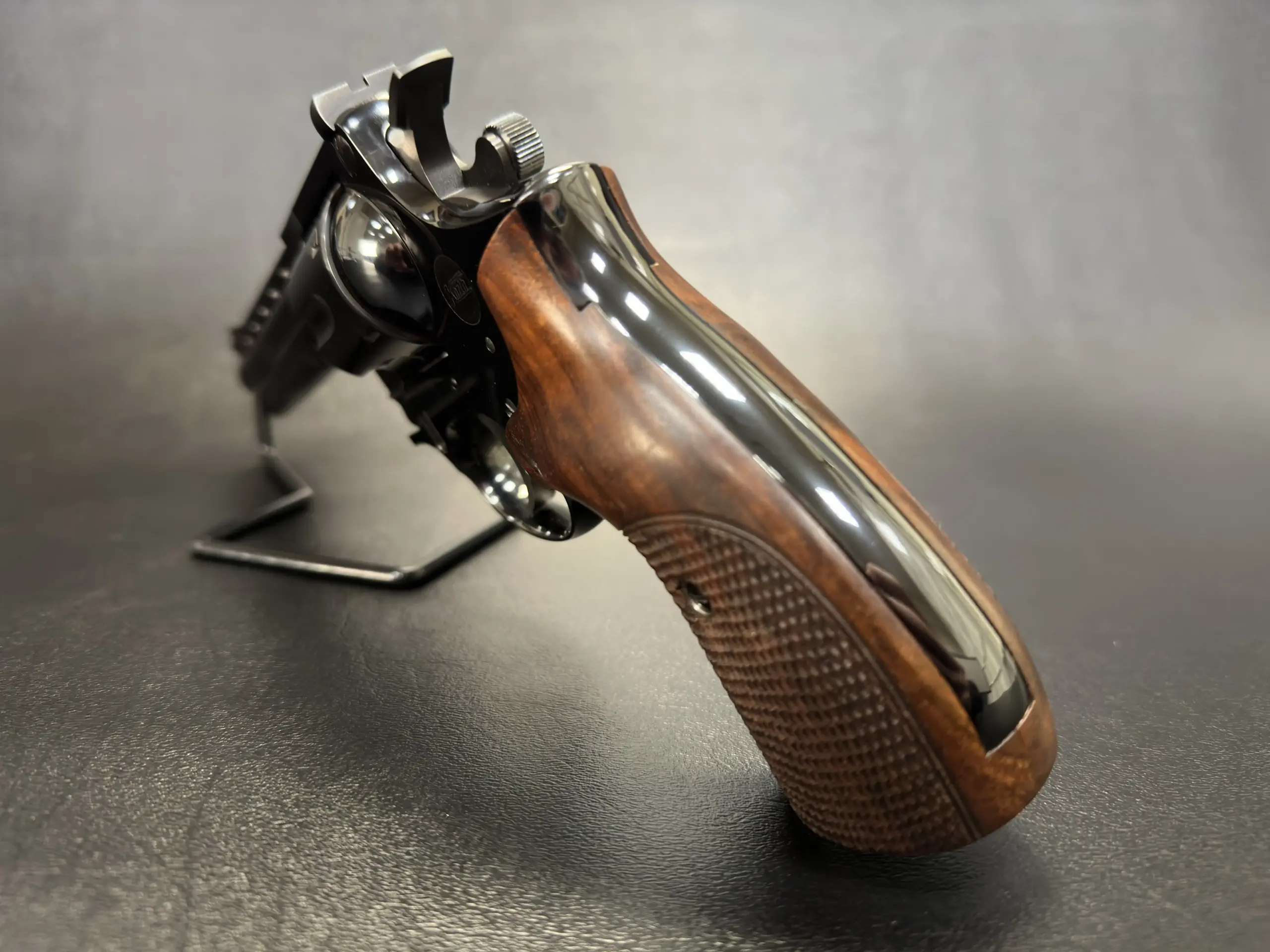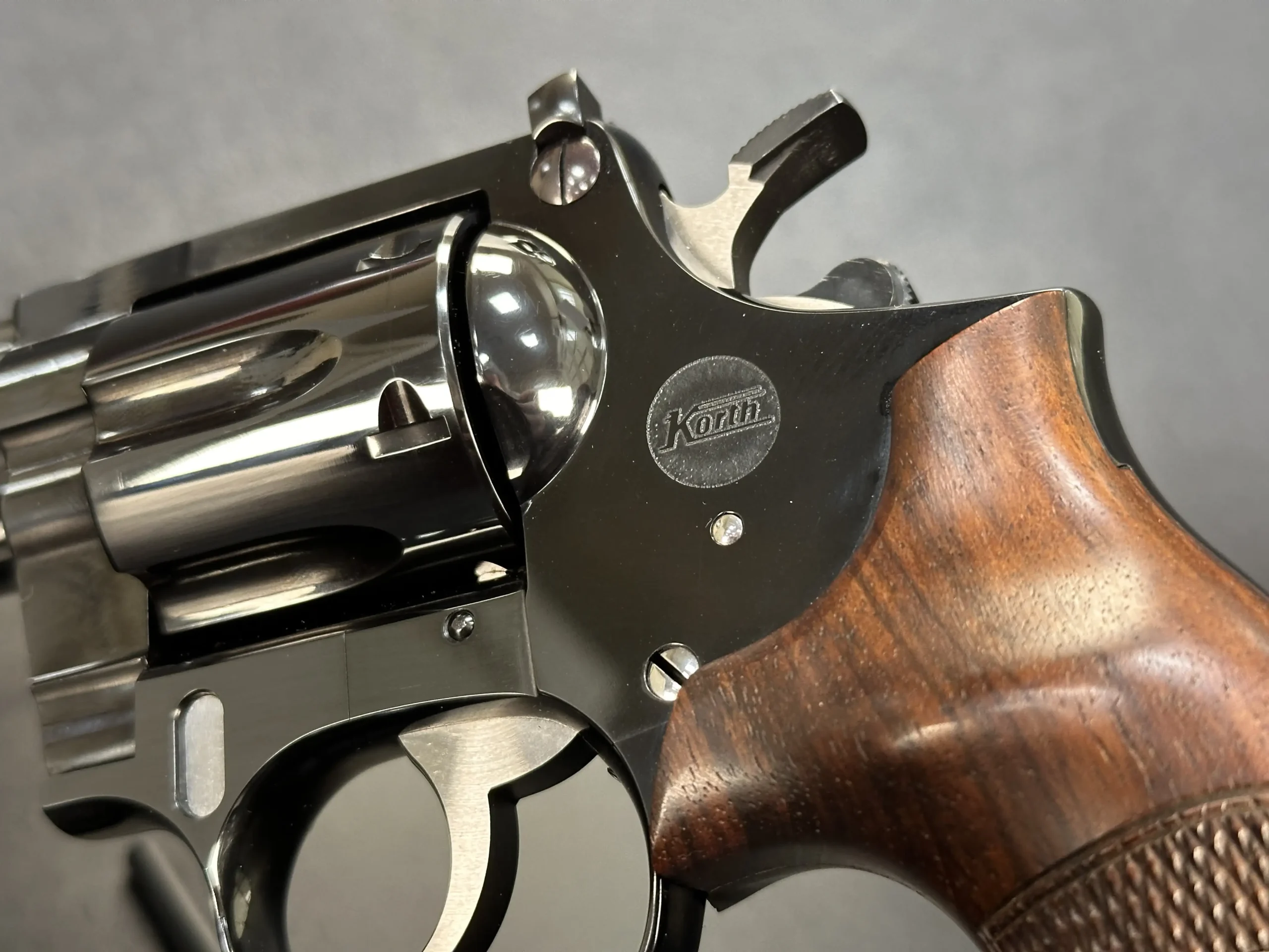 The deep, high-polish blue finish highlights the revolver’s sculpted lines, from the ventilated rib to the precisely machined cylinder flutes. Factory checkered walnut grips add warmth and contrast to the mirror-finished steel, while Korth grip medallions and carefully executed finish transitions reflect the hand-fitted character of the design.