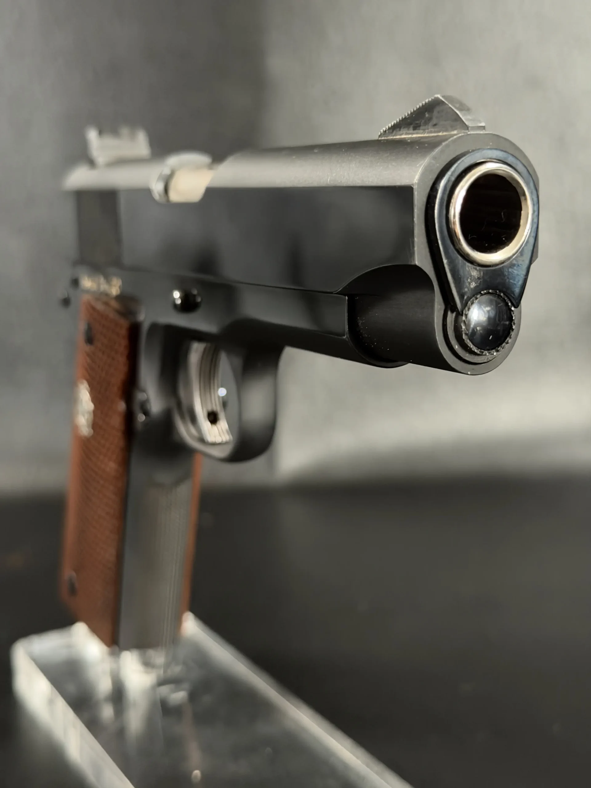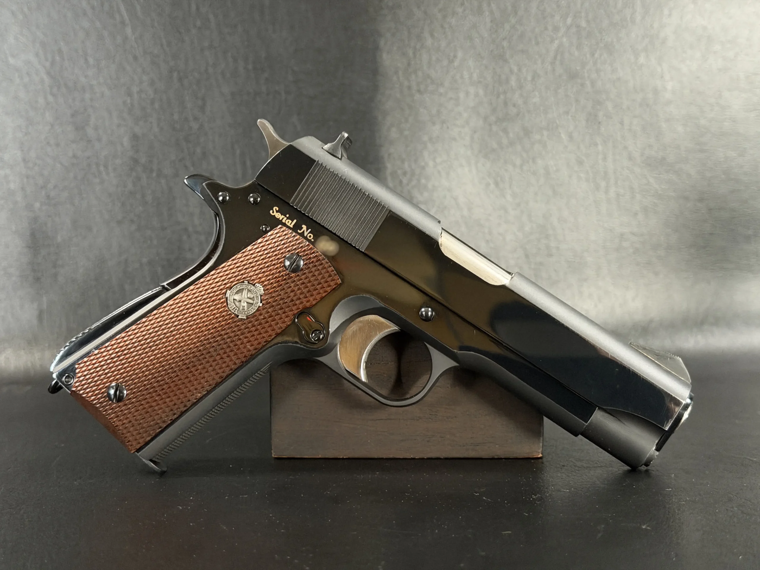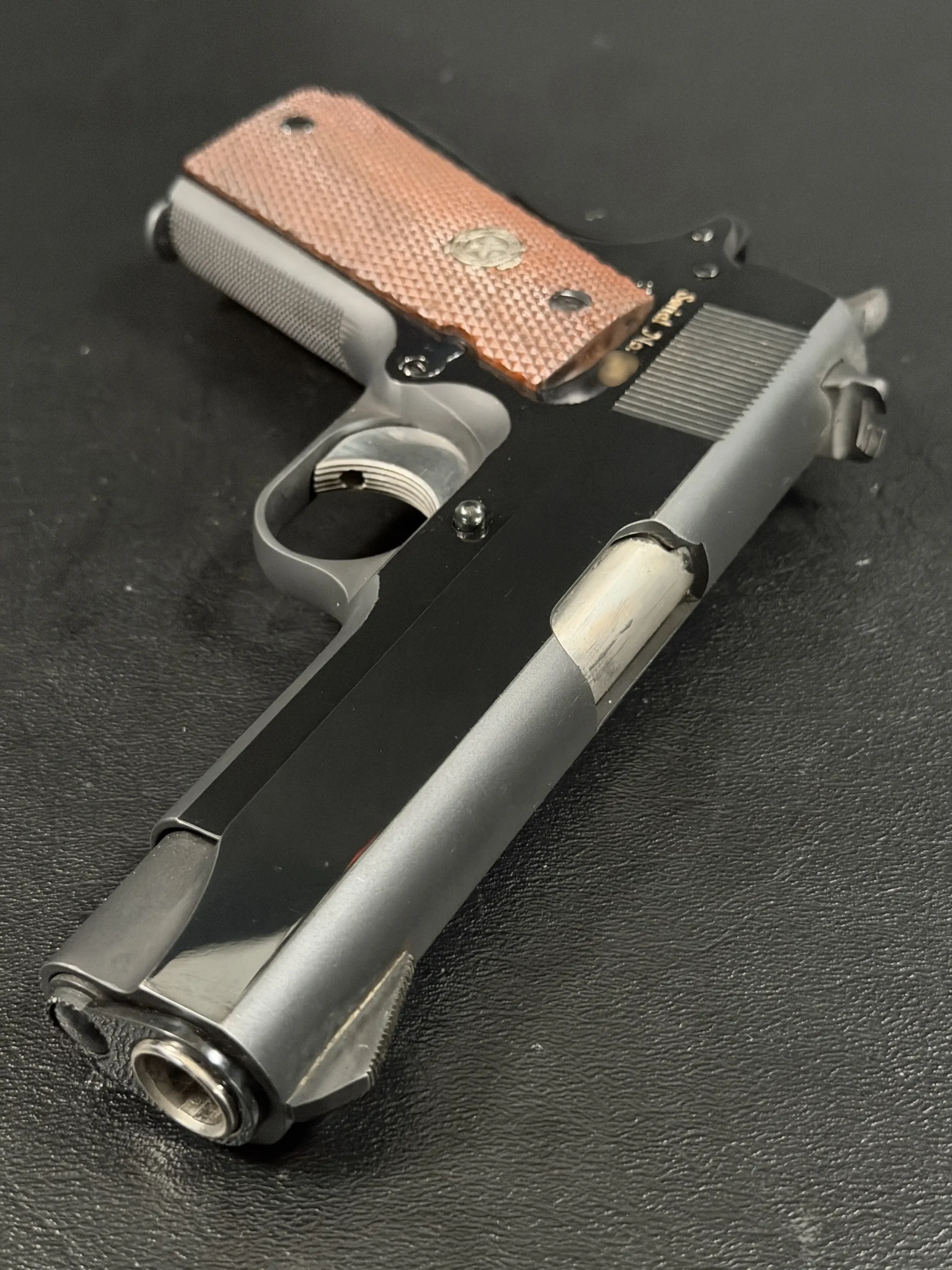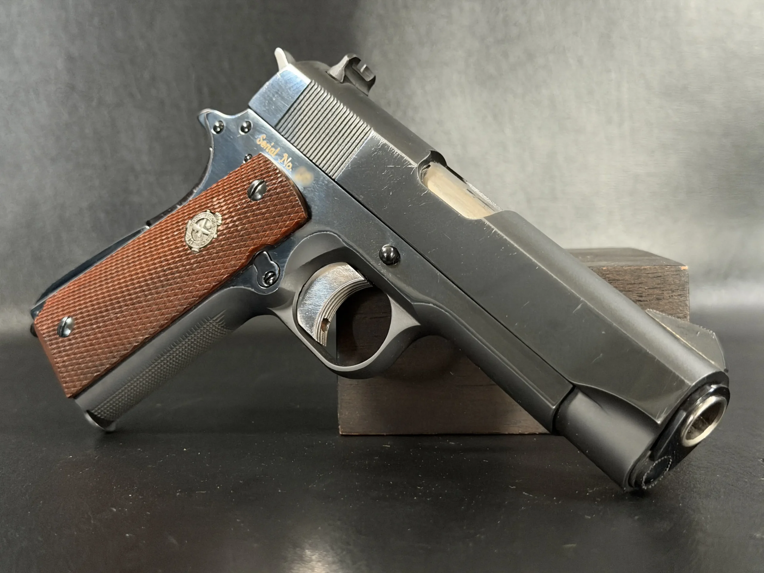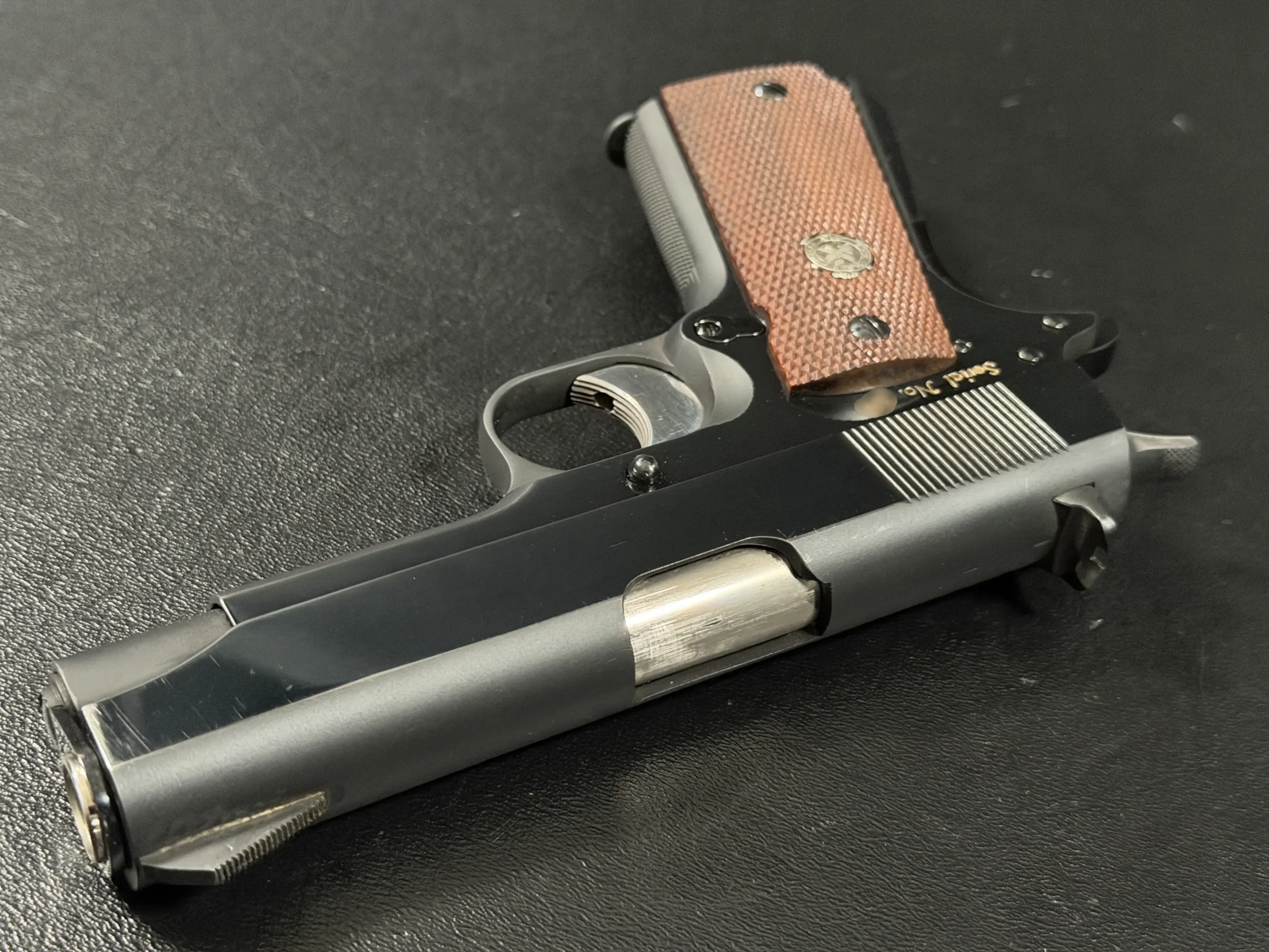 Notable features described on this example include vertical slide serrations, fixed combat-style sights, a solid recoil spring guide configuration, and grip panels fitted with medallions. Together, these details reflect the practical, presentation-grade character associated with the model’s intended role.