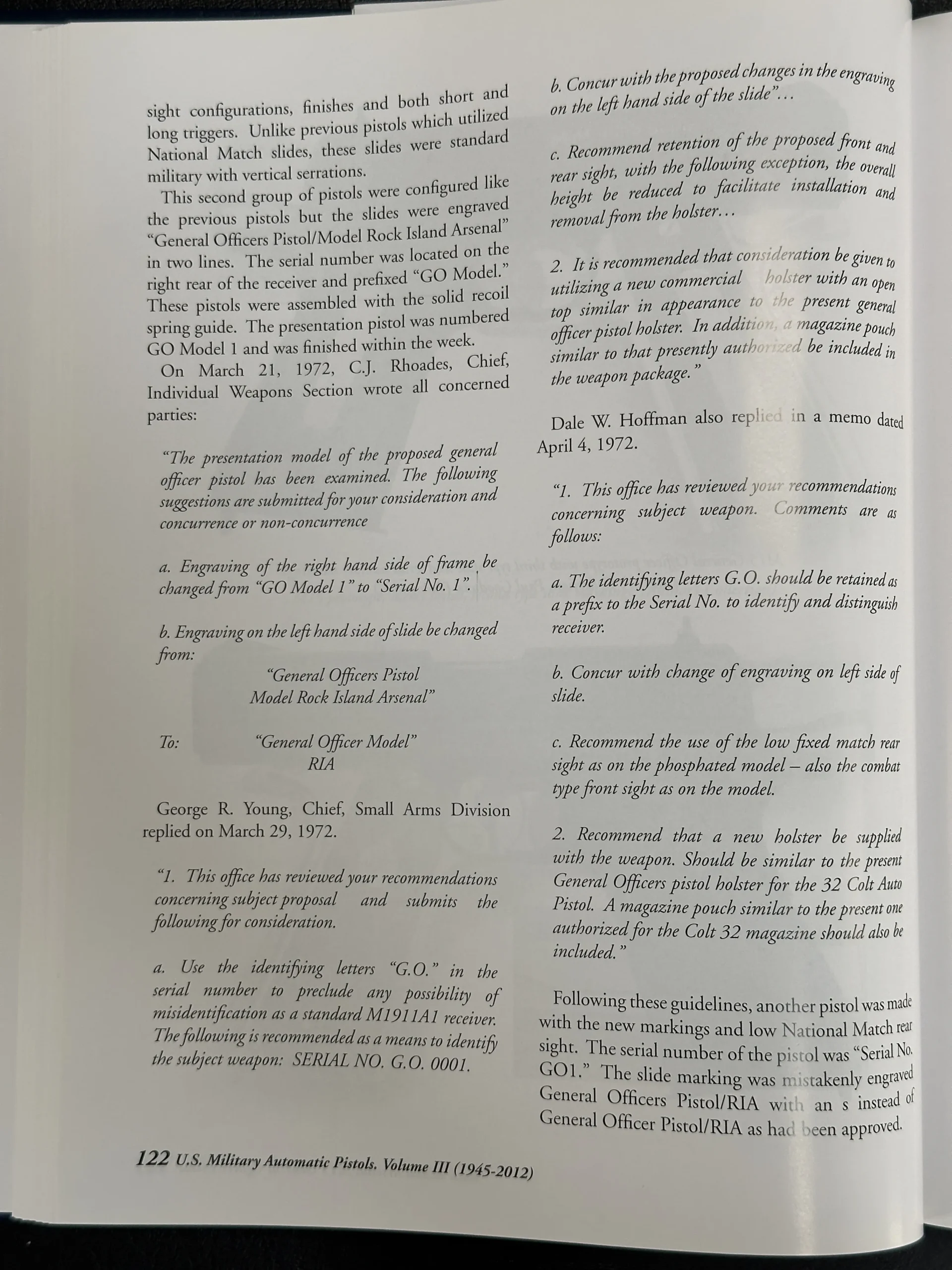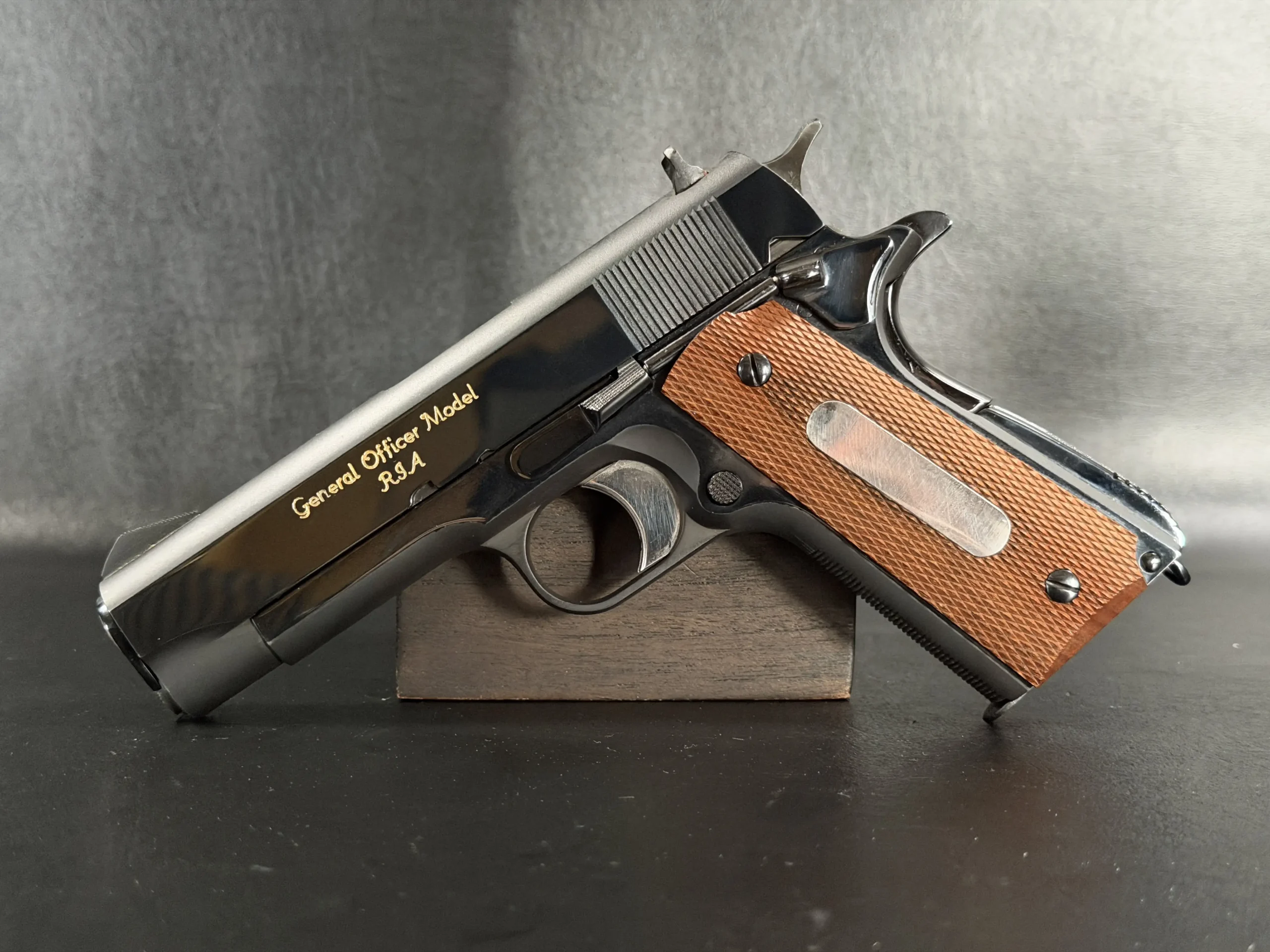 Chambered in .45 ACP, this pistol follows the familiar 1911 pattern while incorporating details associated with early General Officer Model development. The slide markings, configuration, and finish correspond to the evolving specifications discussed during the program in the early 1970s. Prototype variations of this type are referenced in U.S. Military Automatic Pistols 1945–2012 by Edward Scott Meadows.