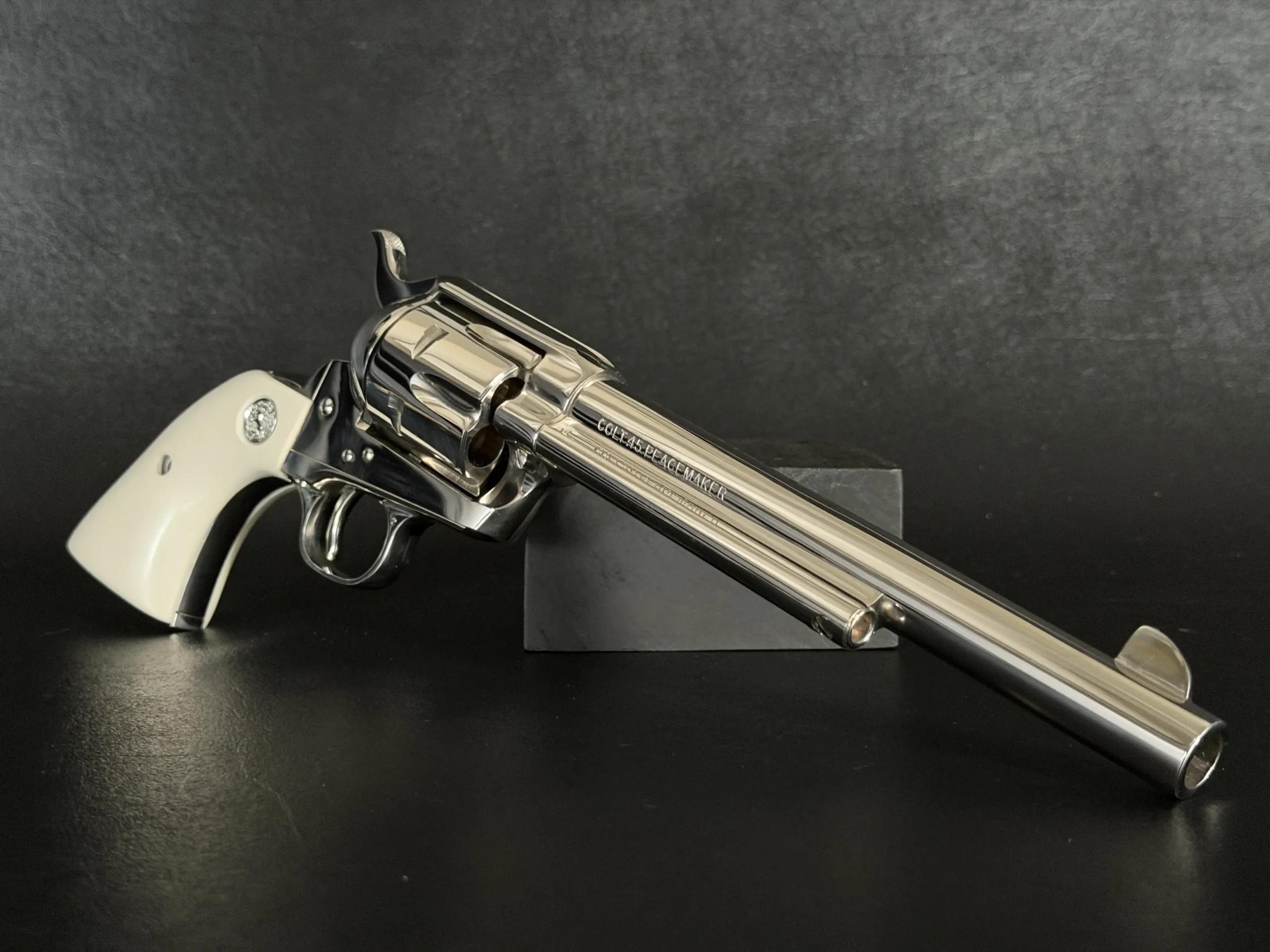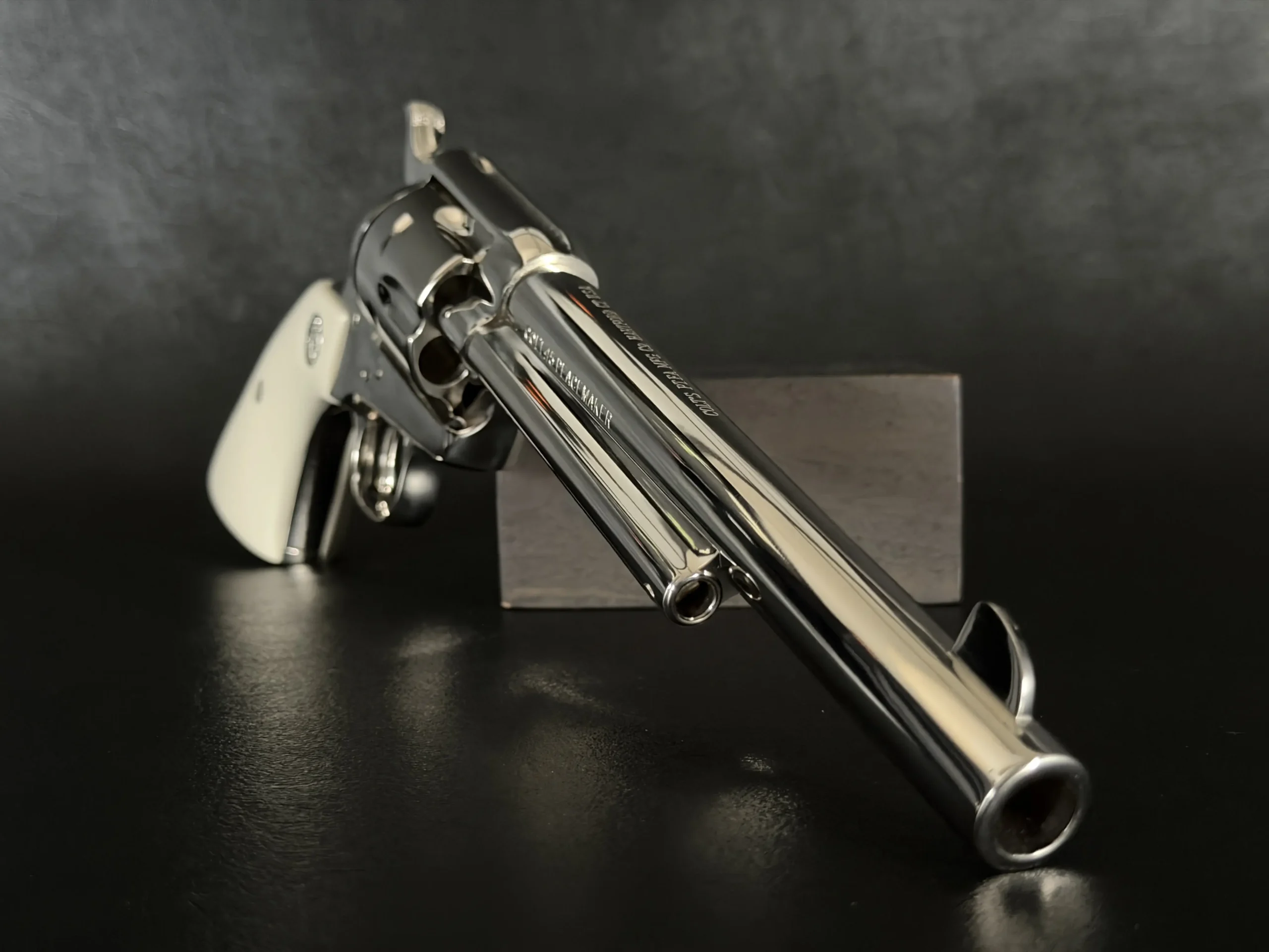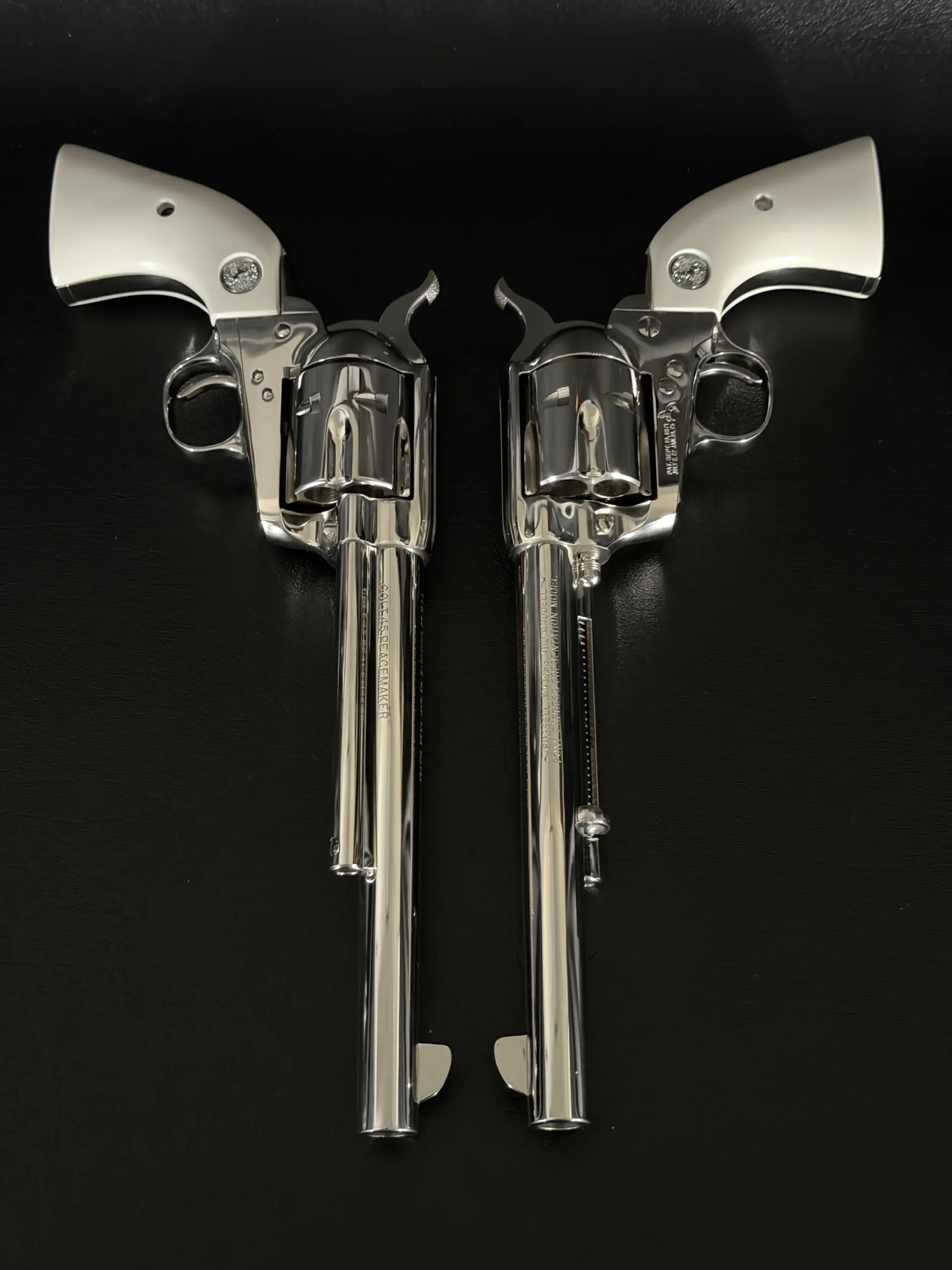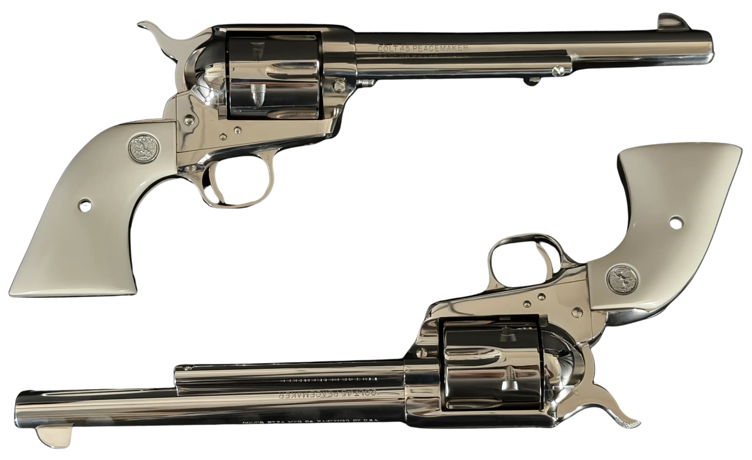 This matched pair of Colt Single Action Army revolvers is presented as a tribute to Russell, Majors & Waddell and the legacy of the Pony Express. Finished in high-polish nickel with classic SAA lines, the set pairs strong visual presence with period-inspired styling.