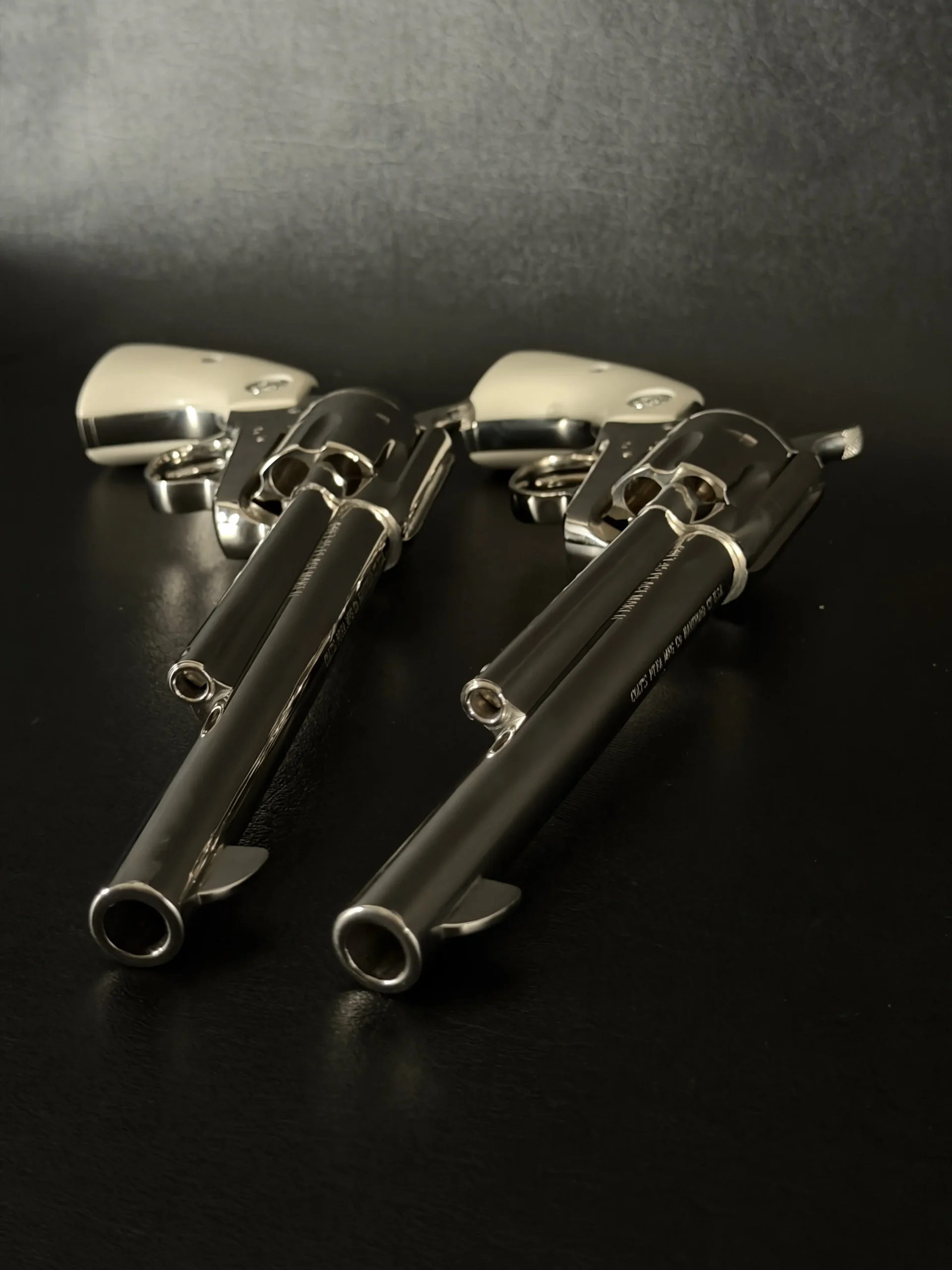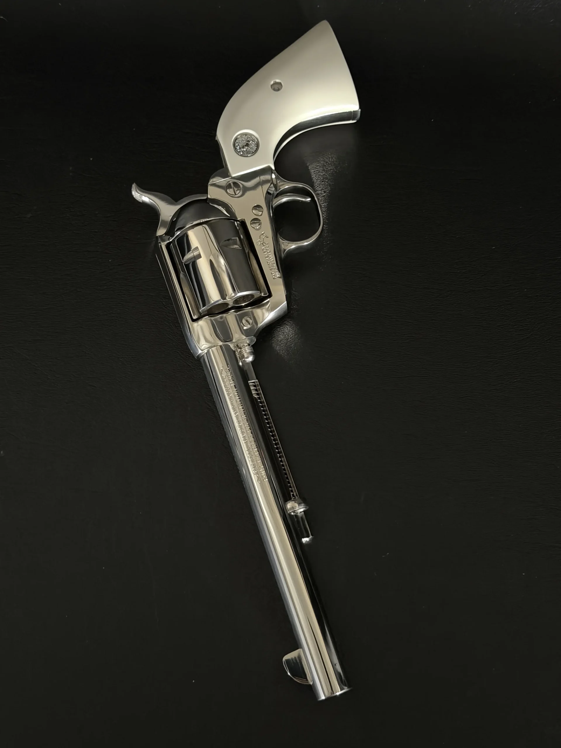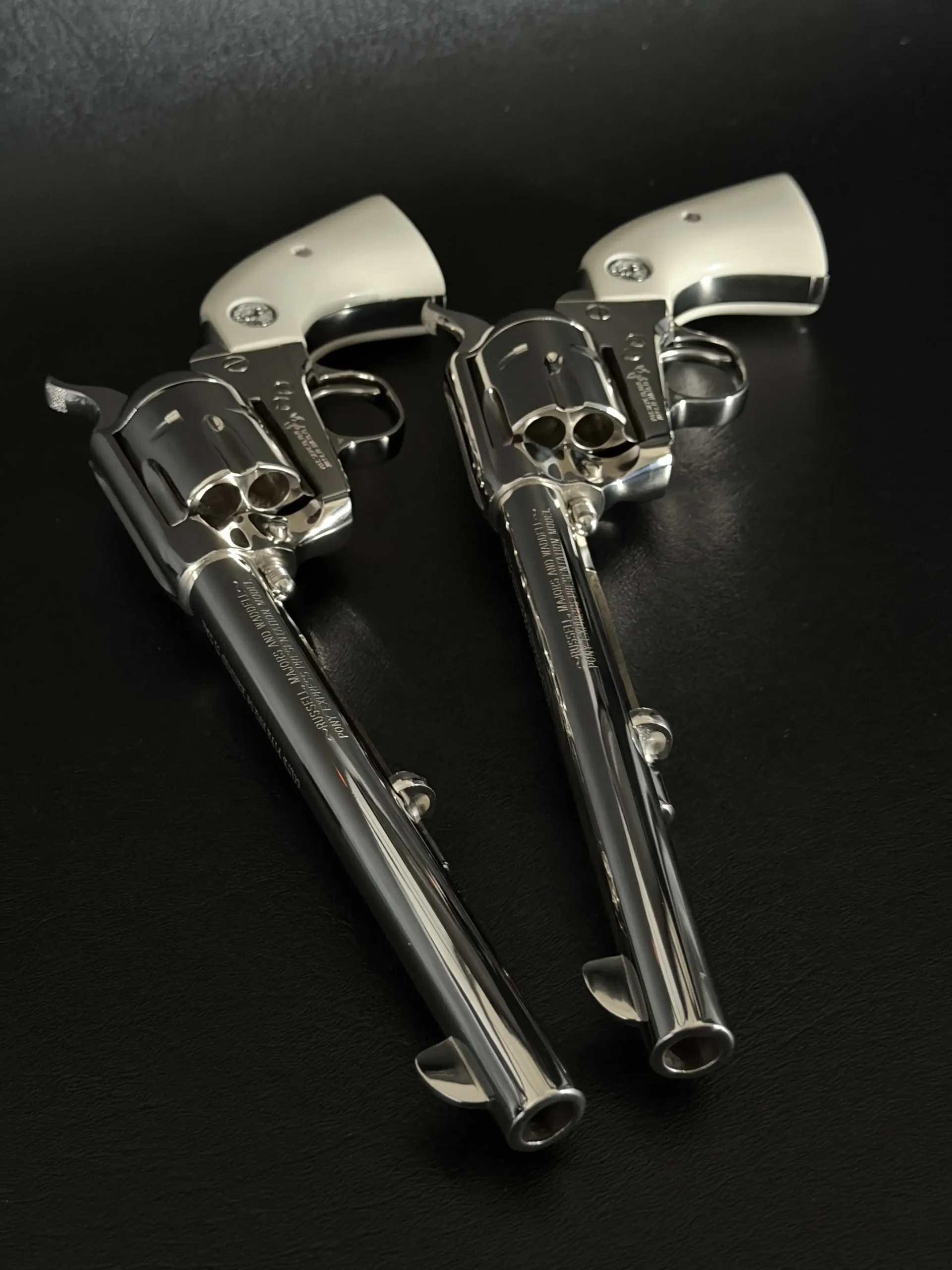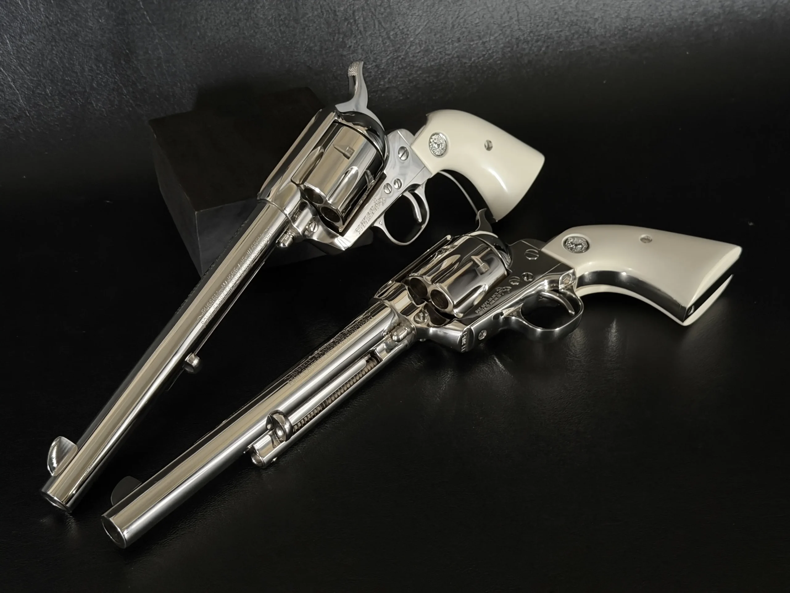 This matched pair of Colt Single Action Army revolvers is presented as a tribute to Russell, Majors & Waddell and the legacy of the Pony Express. Finished in high-polish nickel with classic SAA lines, the set pairs strong visual presence with period-inspired styling.