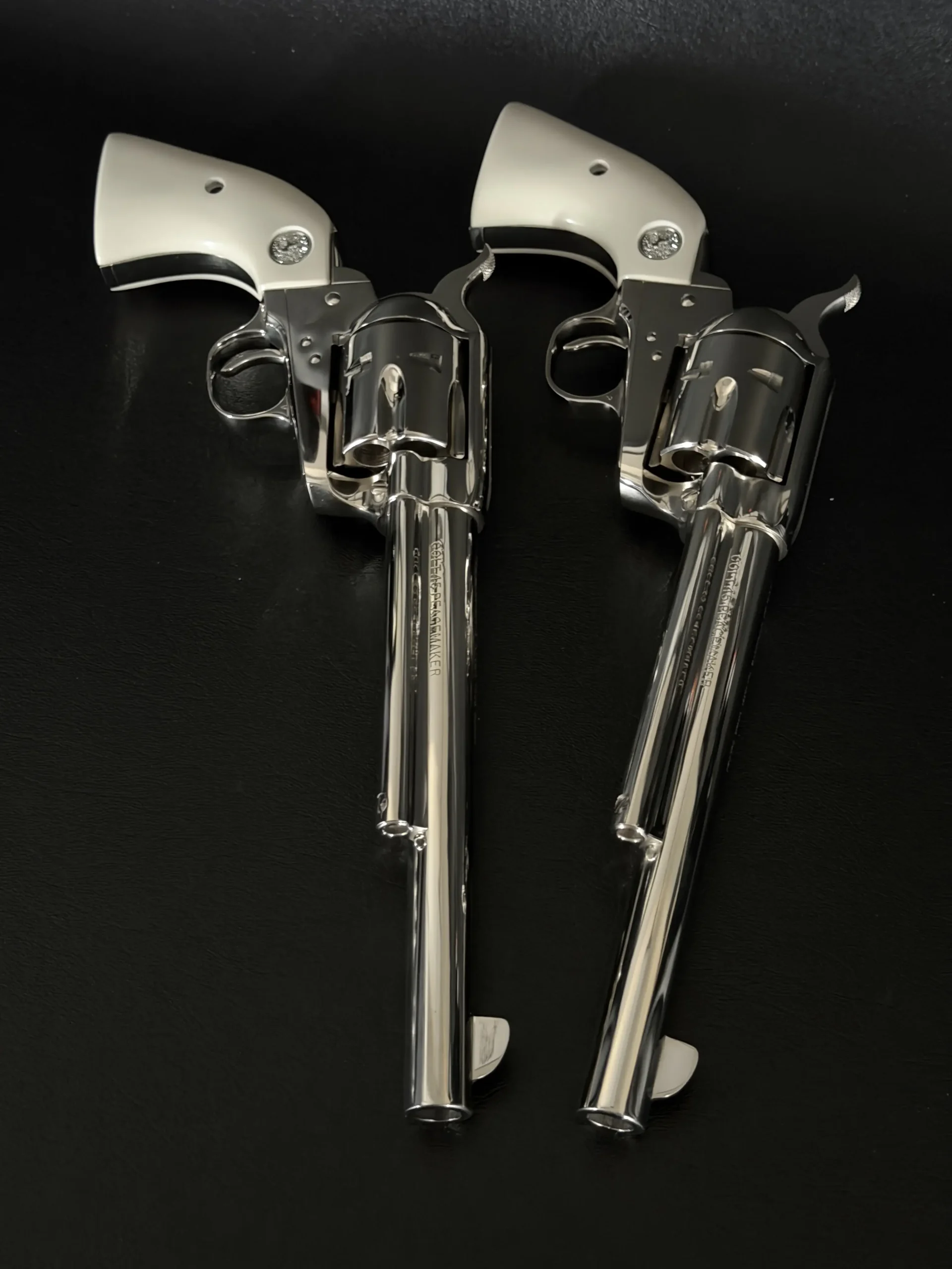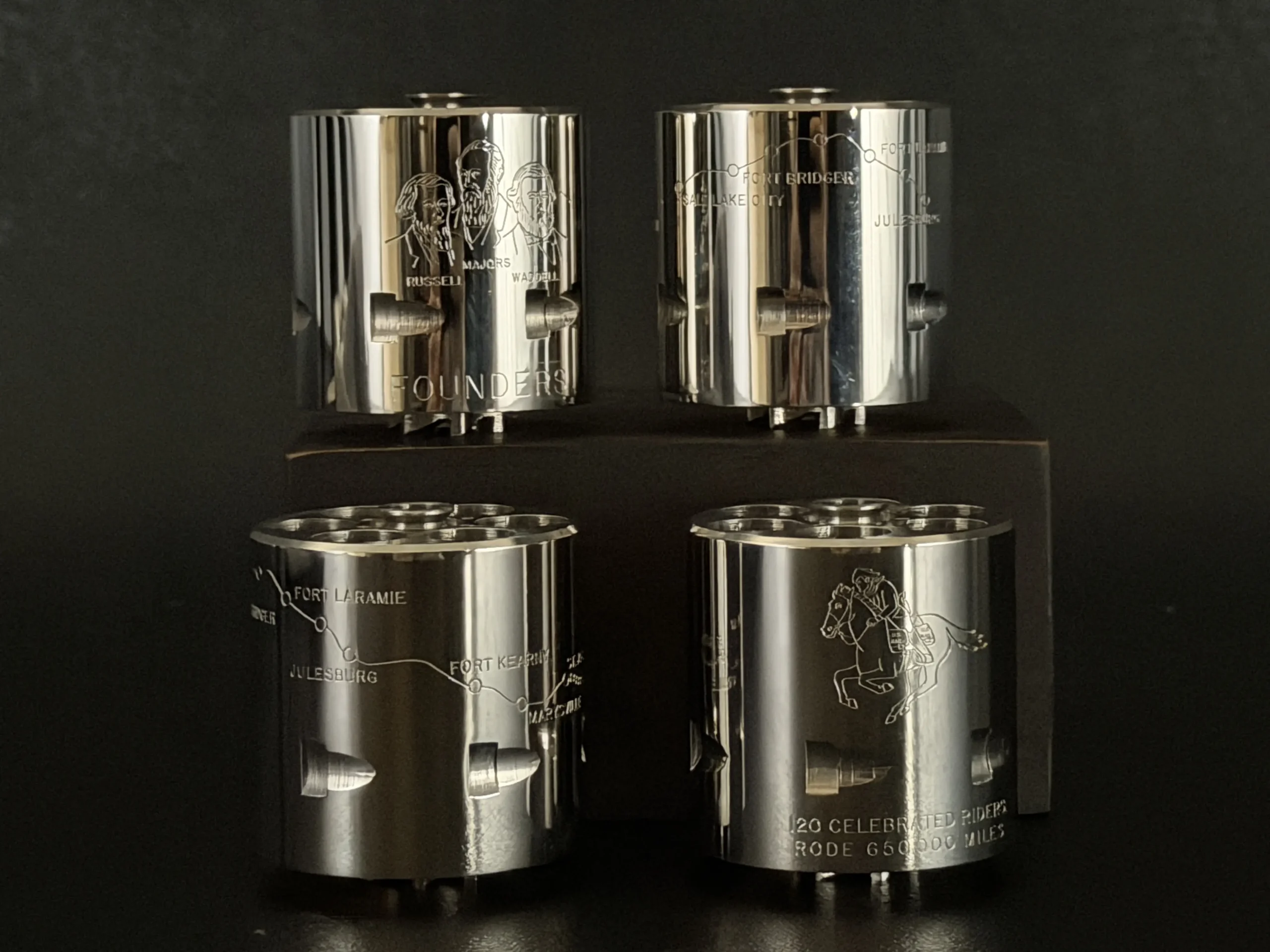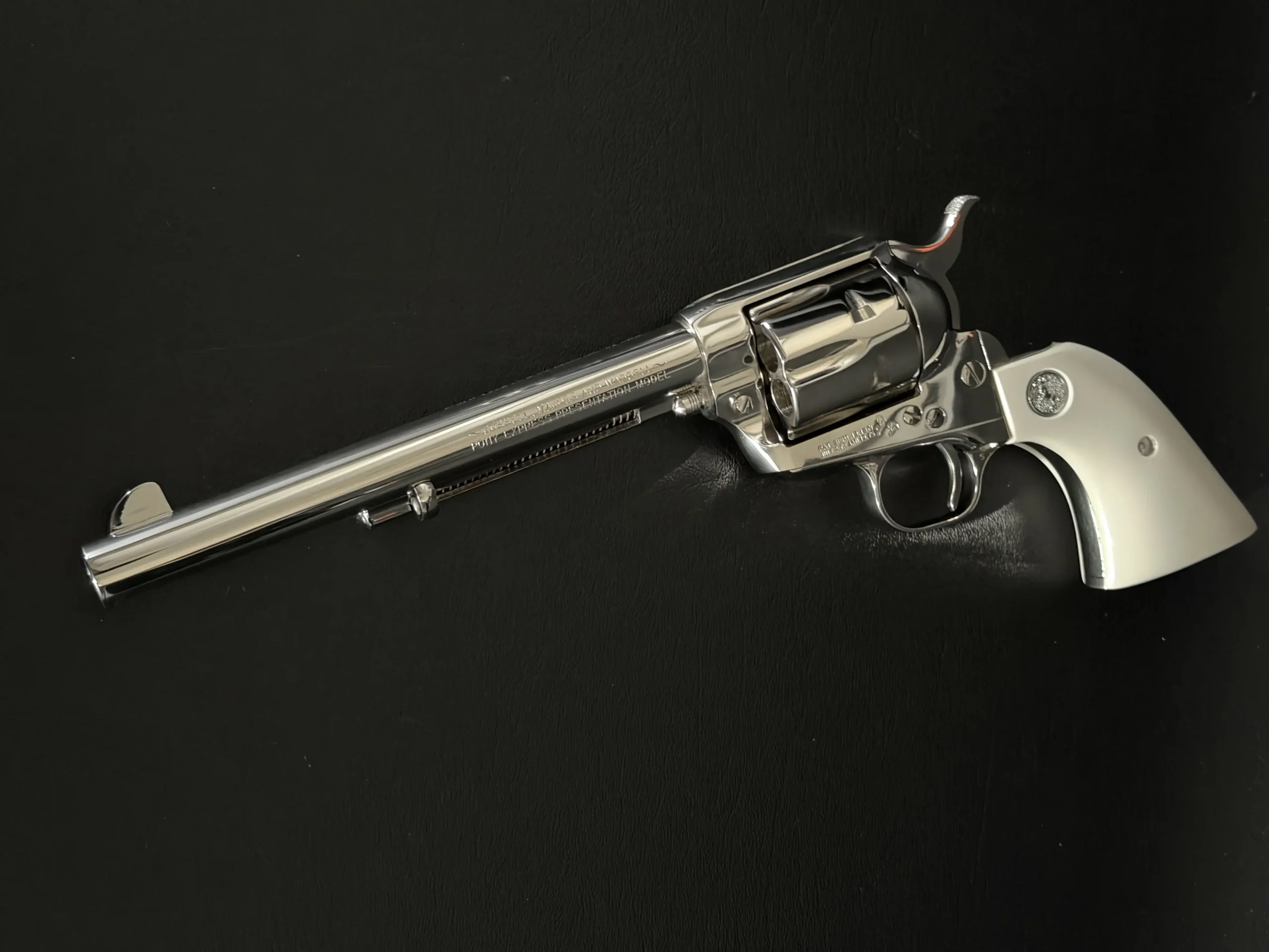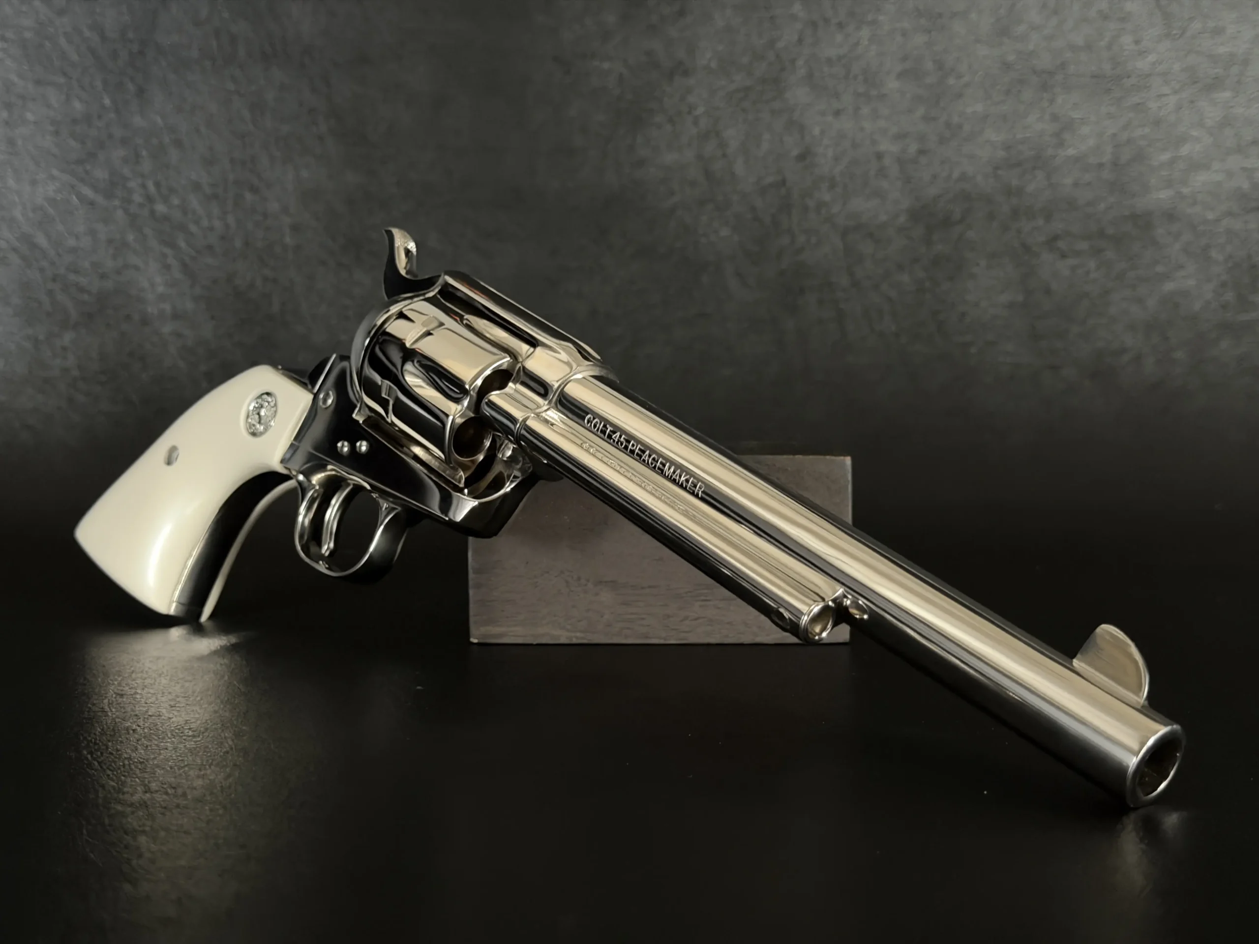 This matched pair of Colt Single Action Army revolvers is presented as a tribute to Russell, Majors & Waddell and the legacy of the Pony Express. Finished in high-polish nickel with classic SAA lines, the set pairs strong visual presence with period-inspired styling.