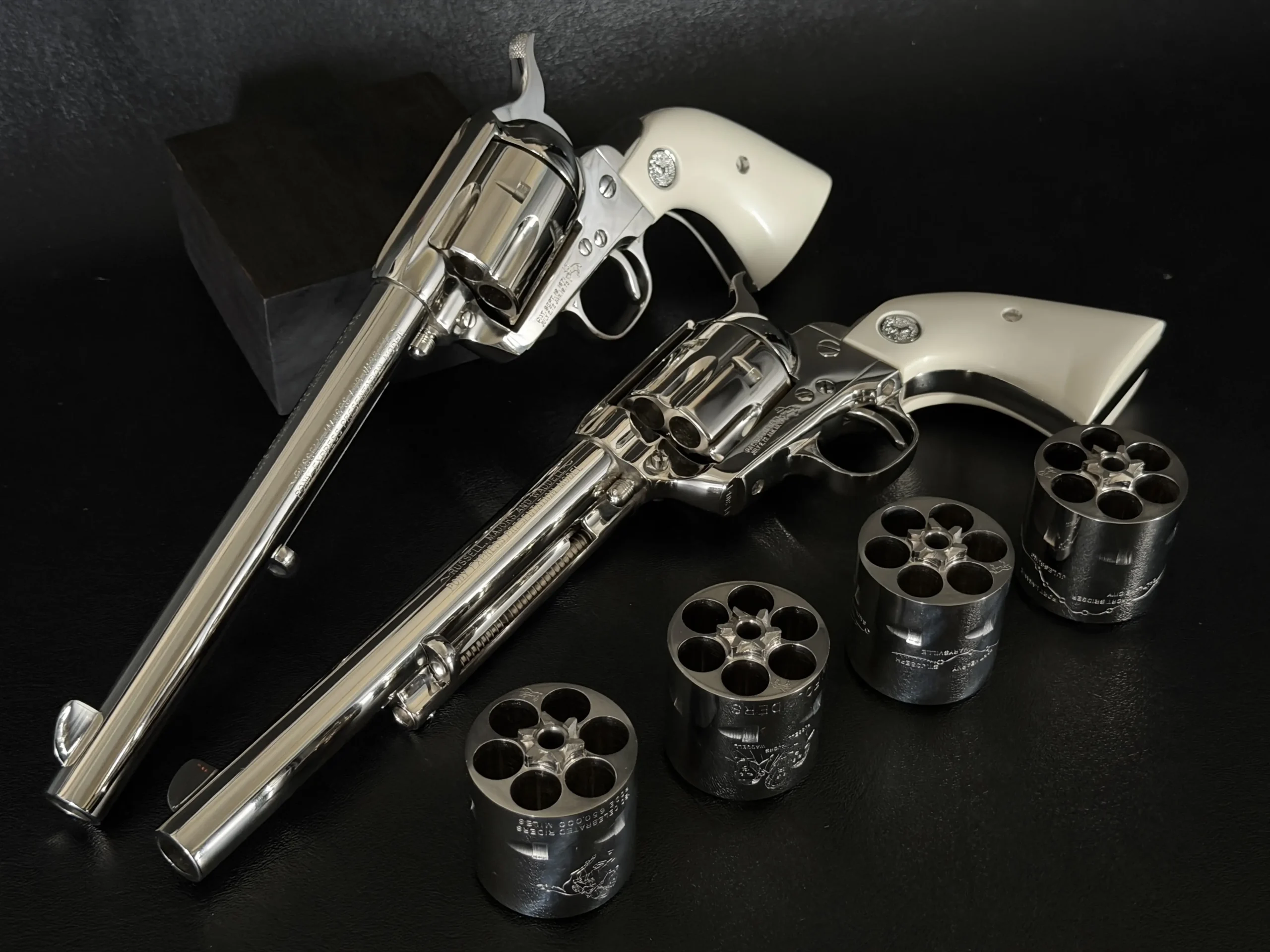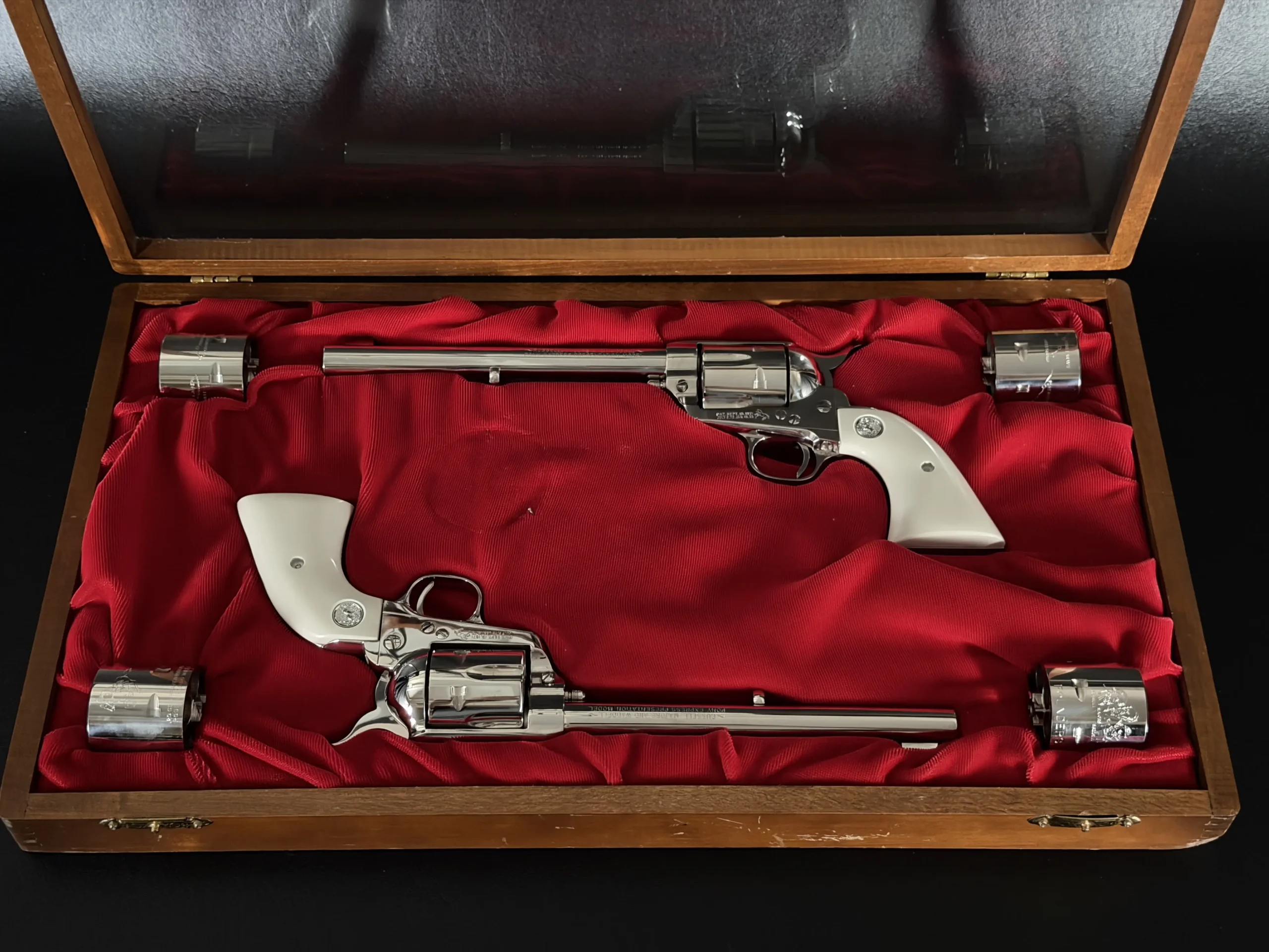 The set is housed in a fitted presentation case and includes accompanying cylinders. Offered as a complete group, it makes a striking display for a Colt-focused collection, Western-themed presentation, or decorative firearms display.