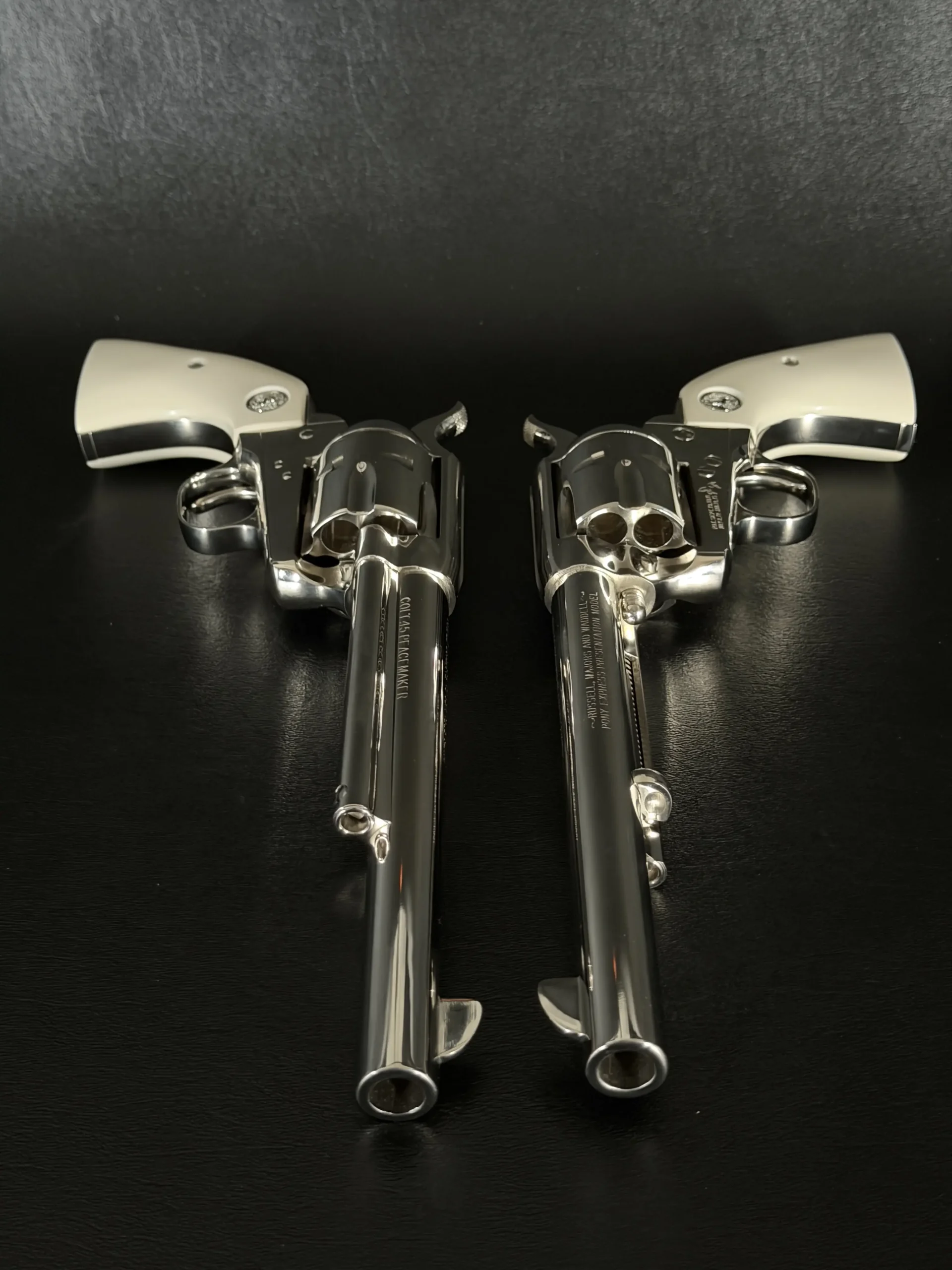 Both revolvers are chambered in .45 Colt and share matching configuration and finish. Details noted in the original presentation include long barrels, crisp Colt markings, and grips fitted with Colt medallions, giving the pair a cohesive and refined appearance.