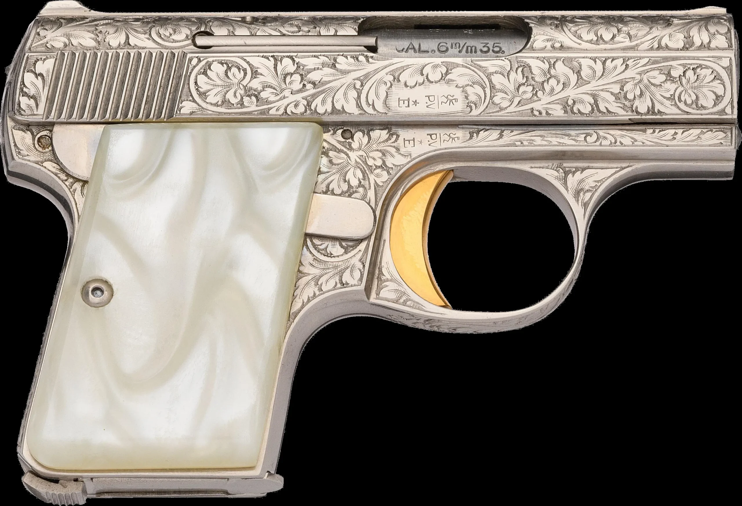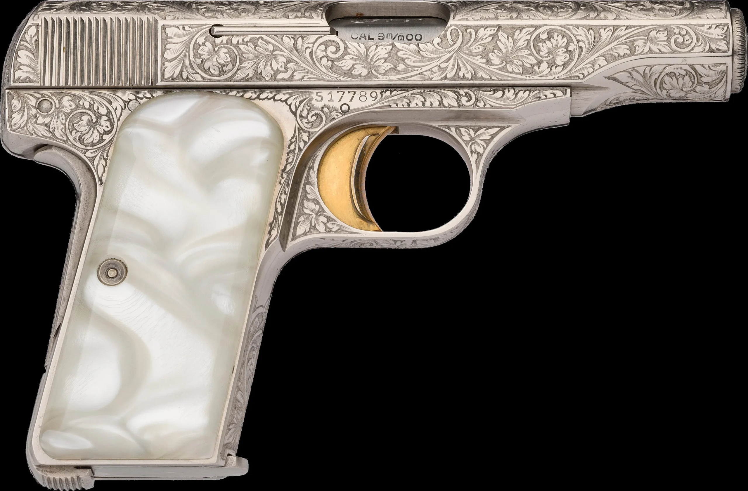 The Model 1955 continues the same engraved Renaissance presentation in a scaled format. It is chambered in 9mm Short and fitted with a 3 5/8-inch barrel, with matching floral engraving and coin finish.