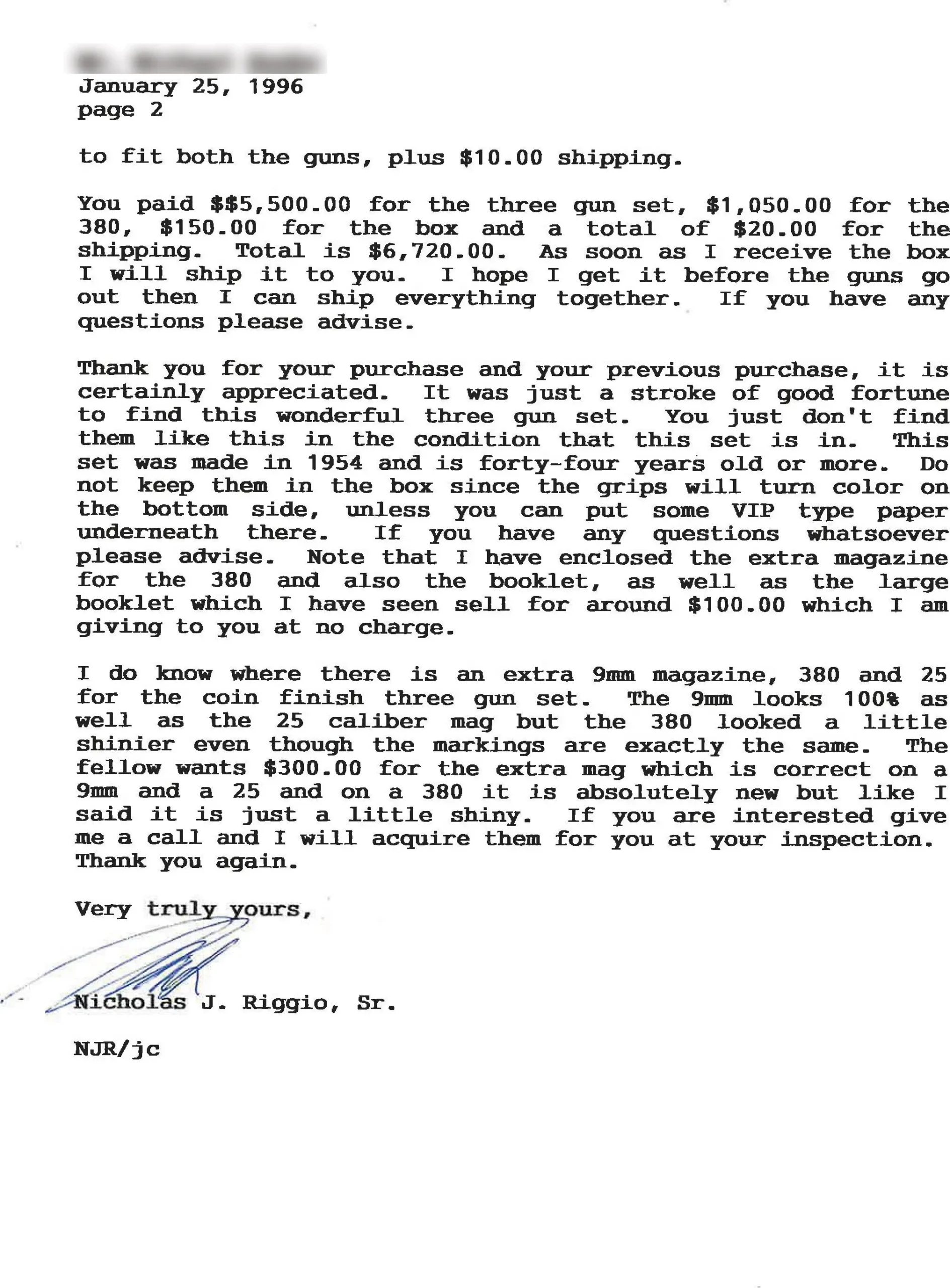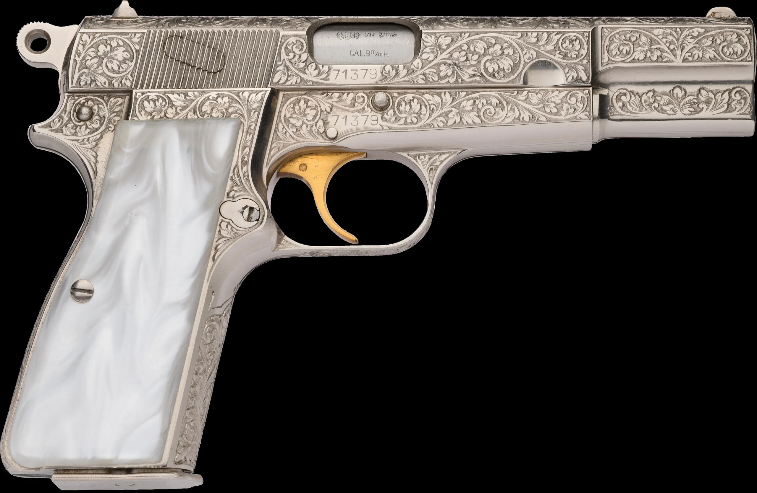 The High Power anchors the group with a 4 3/4-inch barrel chambered in 9mm Luger. It features full floral engraving, a coin finish, and pearlite grips. Included with this pistol is a letter from Commemorative Arms of St. Louis noting its history, including 1954 inventory with A.L. Paulson Sporting Goods. A custom walnut display case is also included.