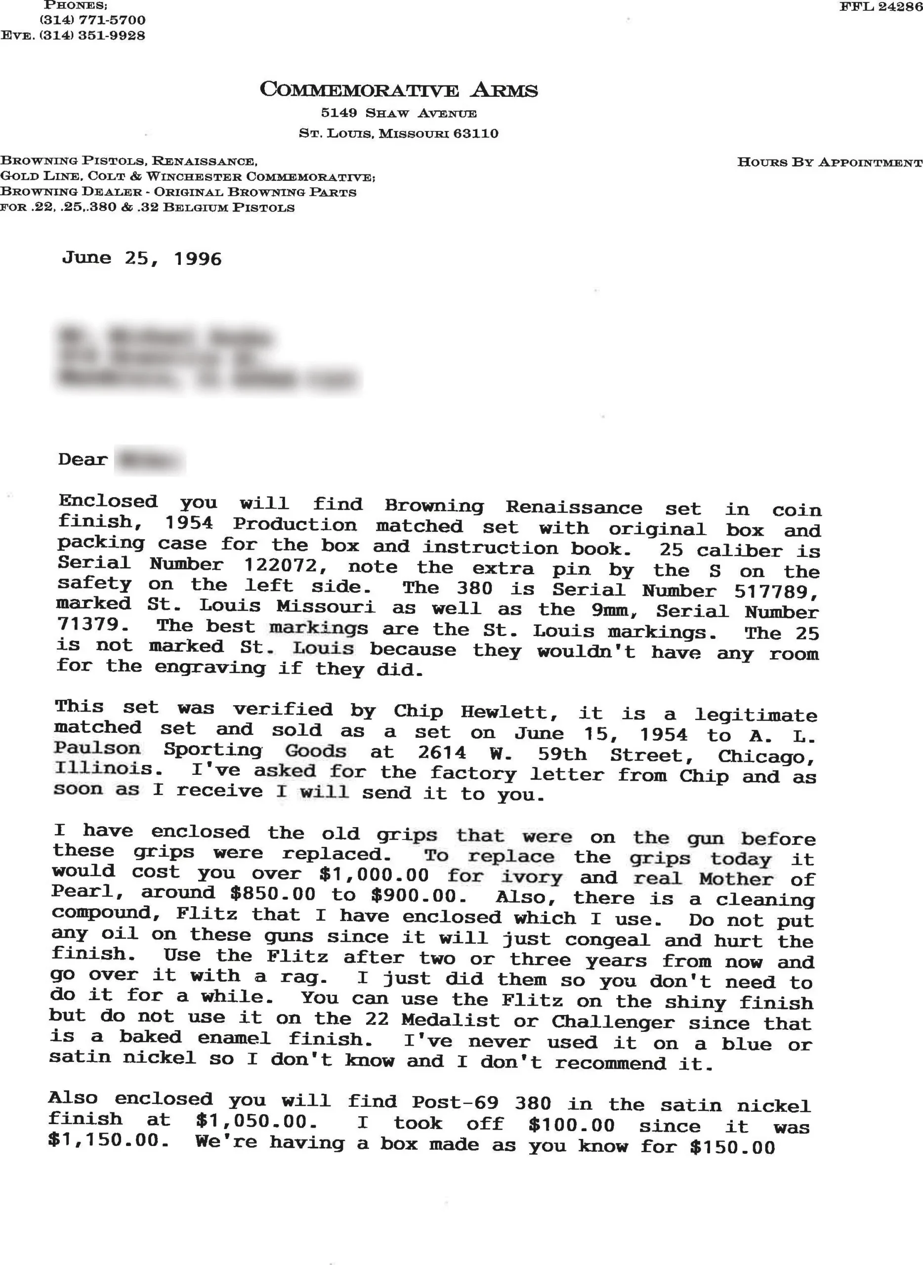 Across the set, the shared engraving style and finish create a cohesive presentation rooted in Belgian Browning design. The group includes letters of authenticity.
