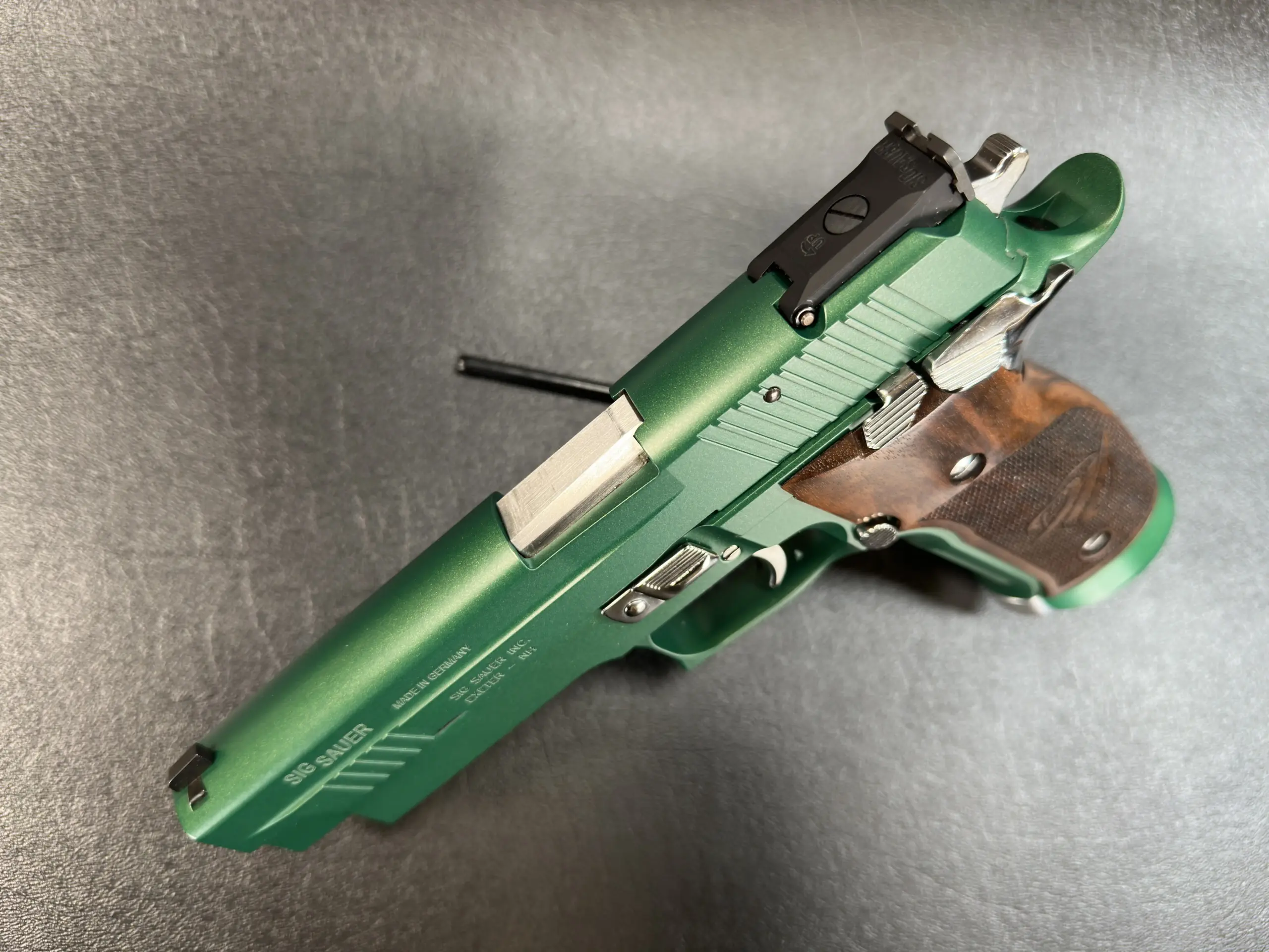 Included with the pistol are the original factory box, manual, and factory test target, rounding out a complete package for buyers who value original accompanying items. The Emerald finish and Mastershop pedigree give this P226 X-Five a distinctive presence in any modern SIG collection.