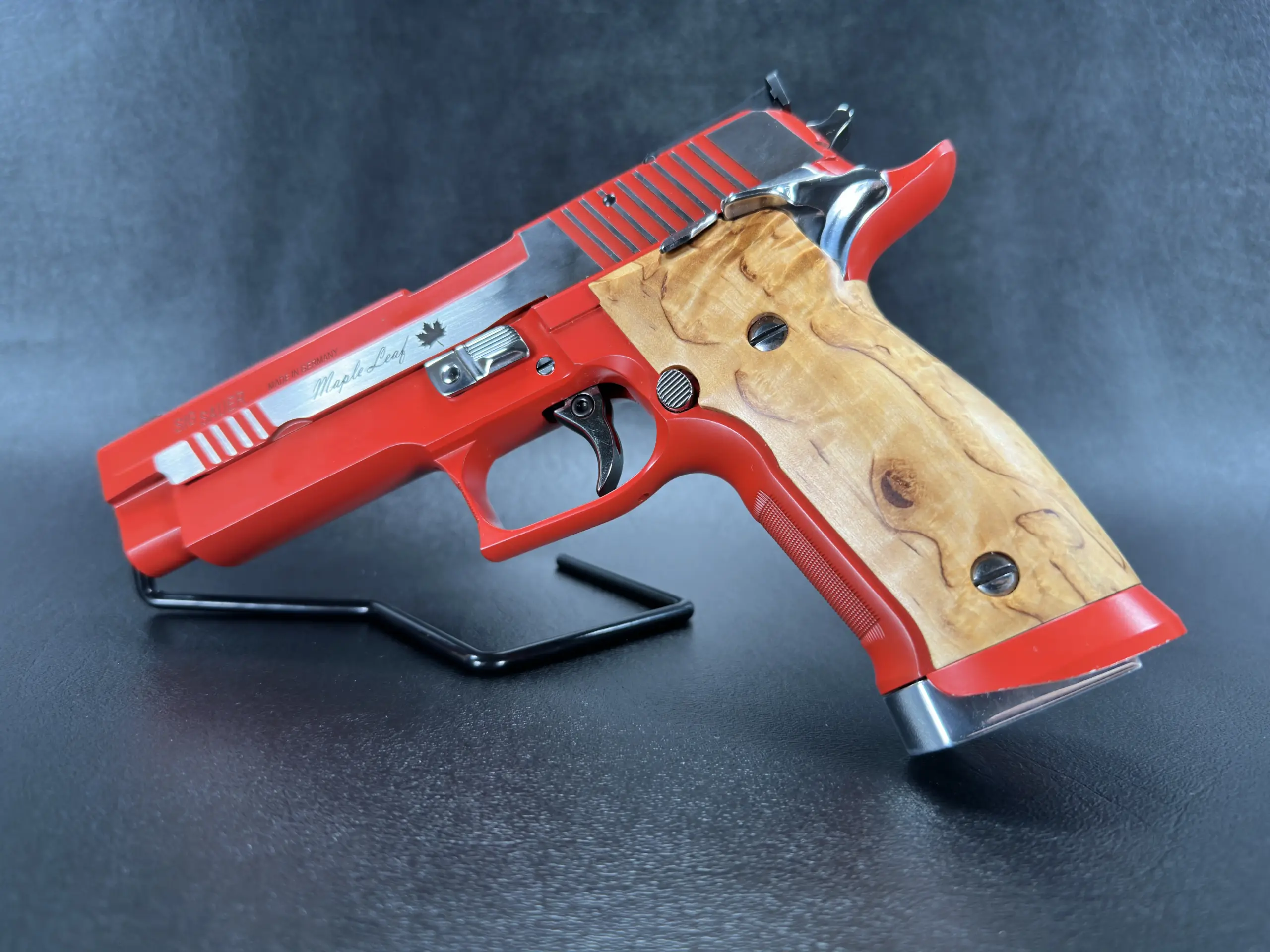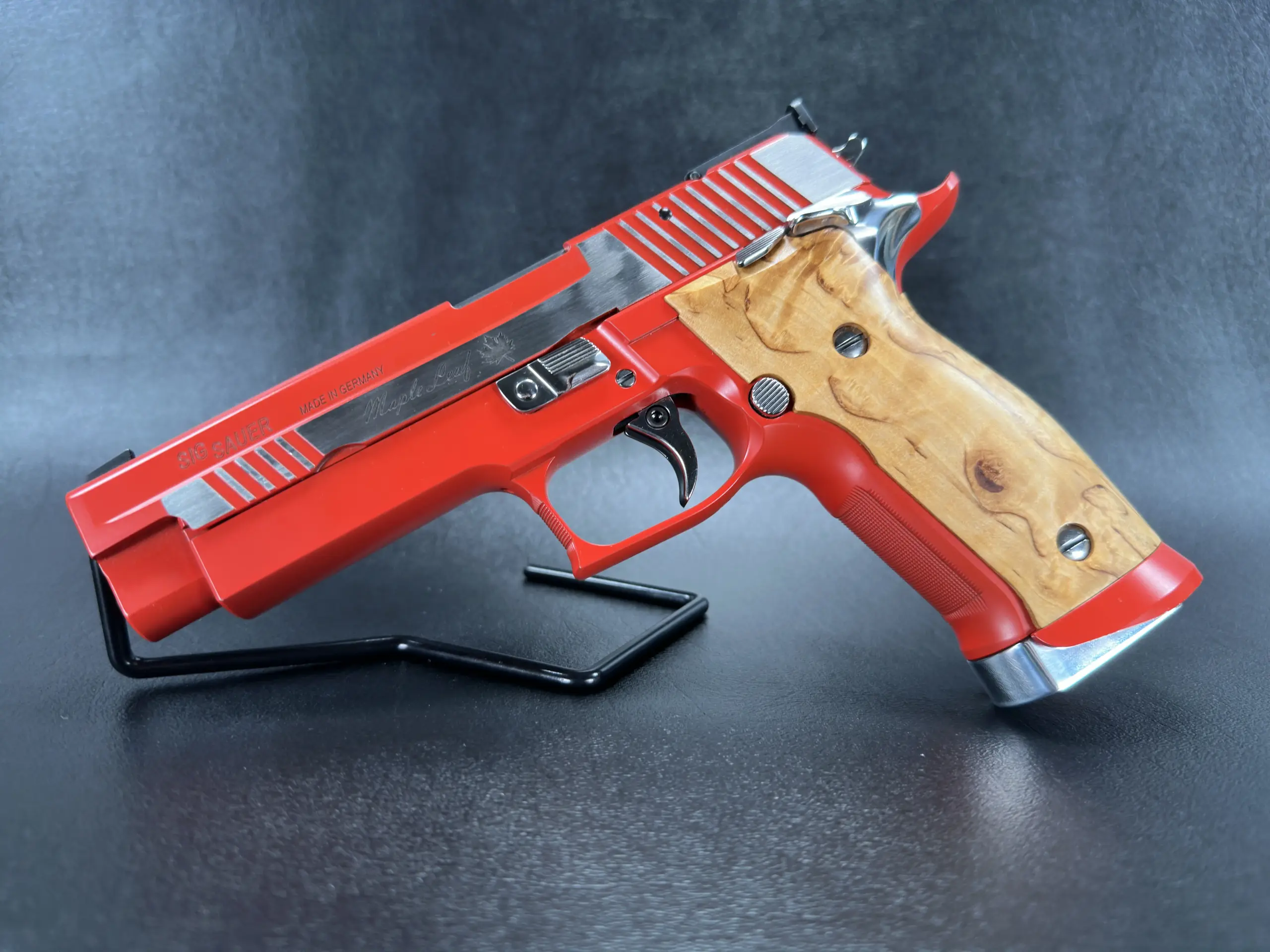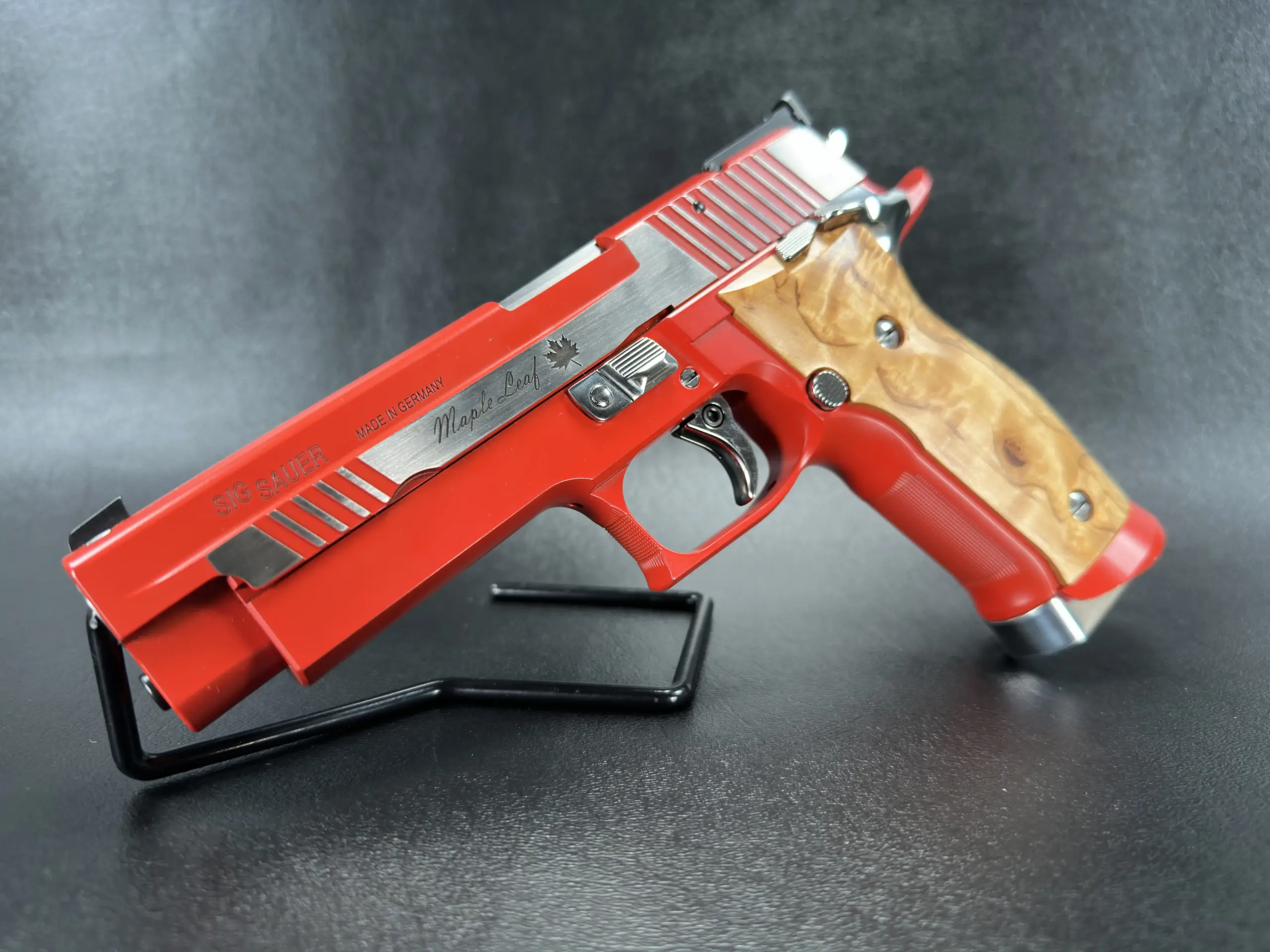 The SIG Sauer P226 X-Five Maple Leaf is a Mastershop pistol distinguished by its Maple Leaf design and polished stainless steel finish. Built with the fit and detailing associated with the X-Five line, it offers a refined presentation for collectors and enthusiasts alike.