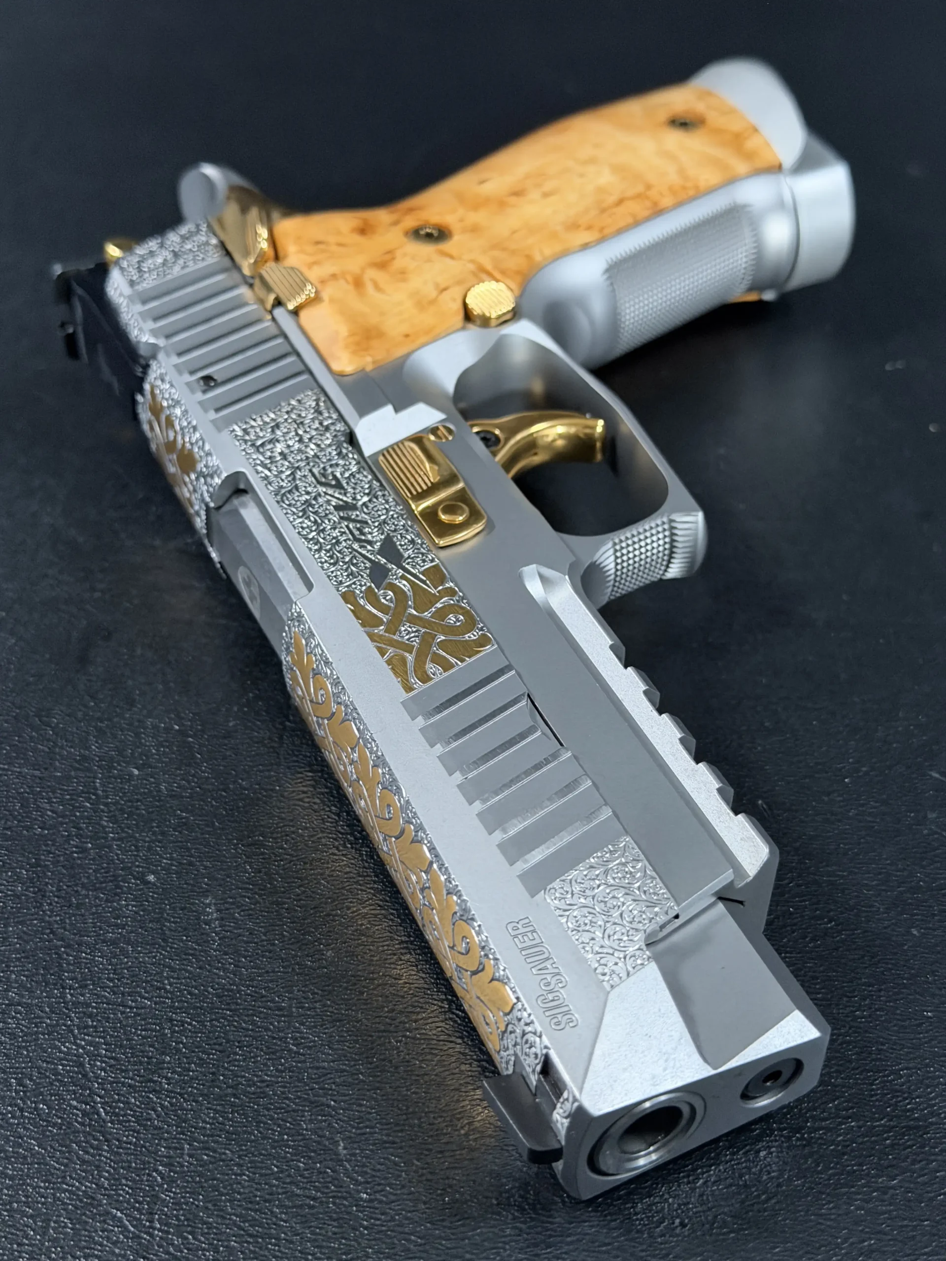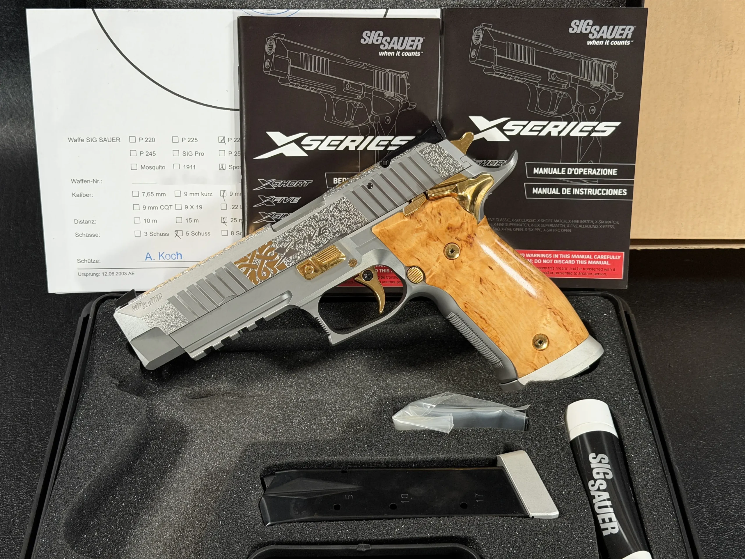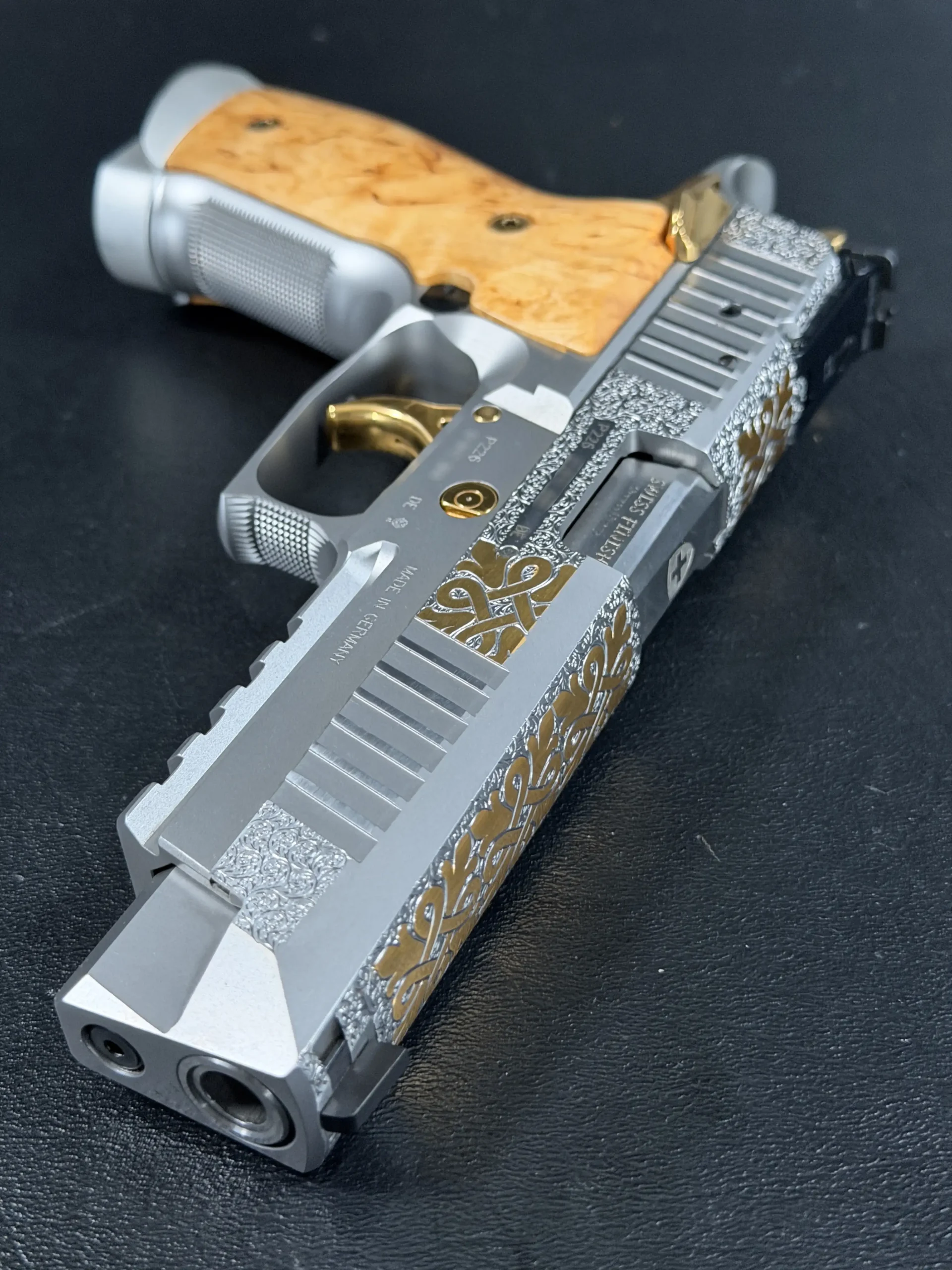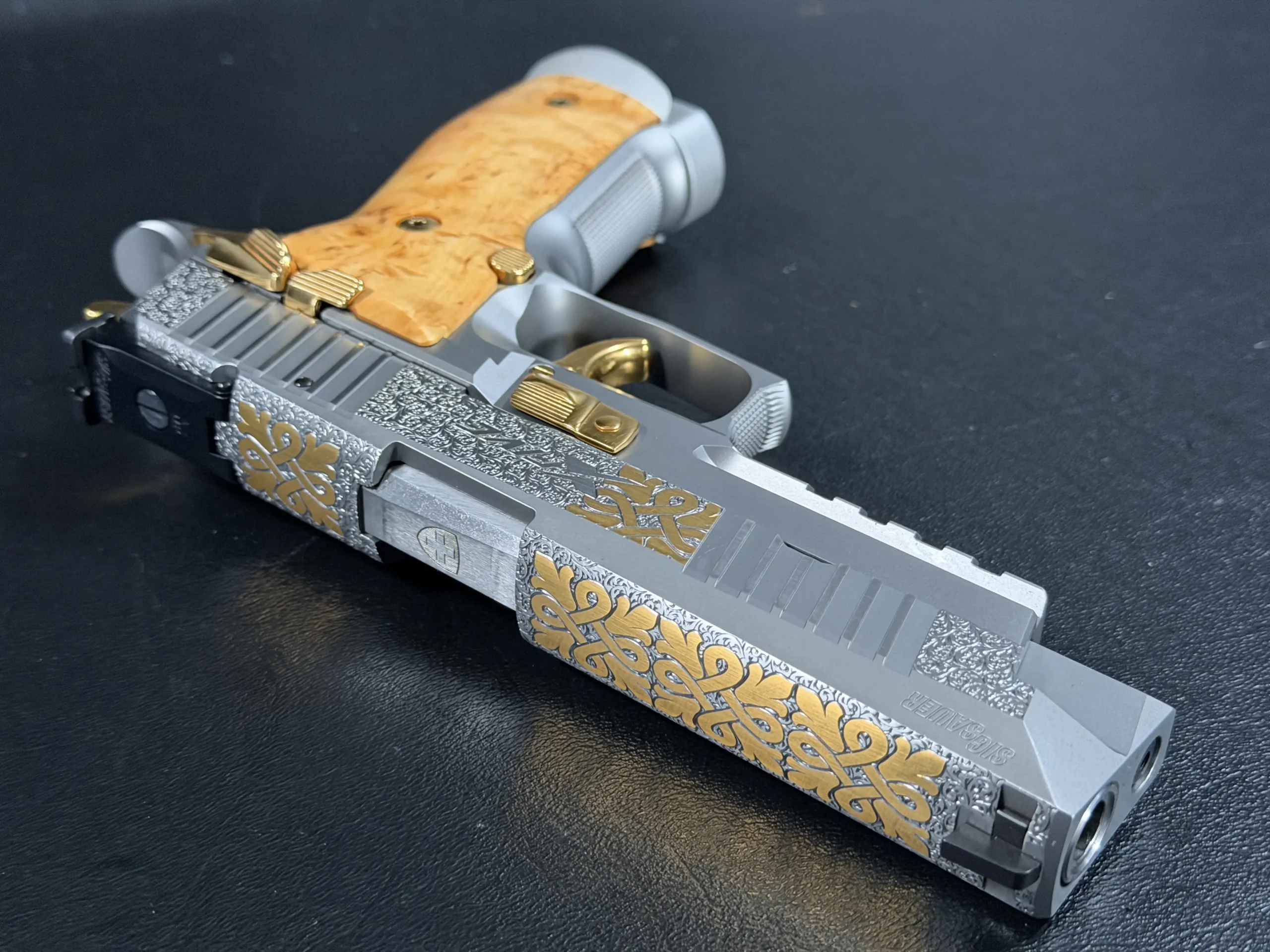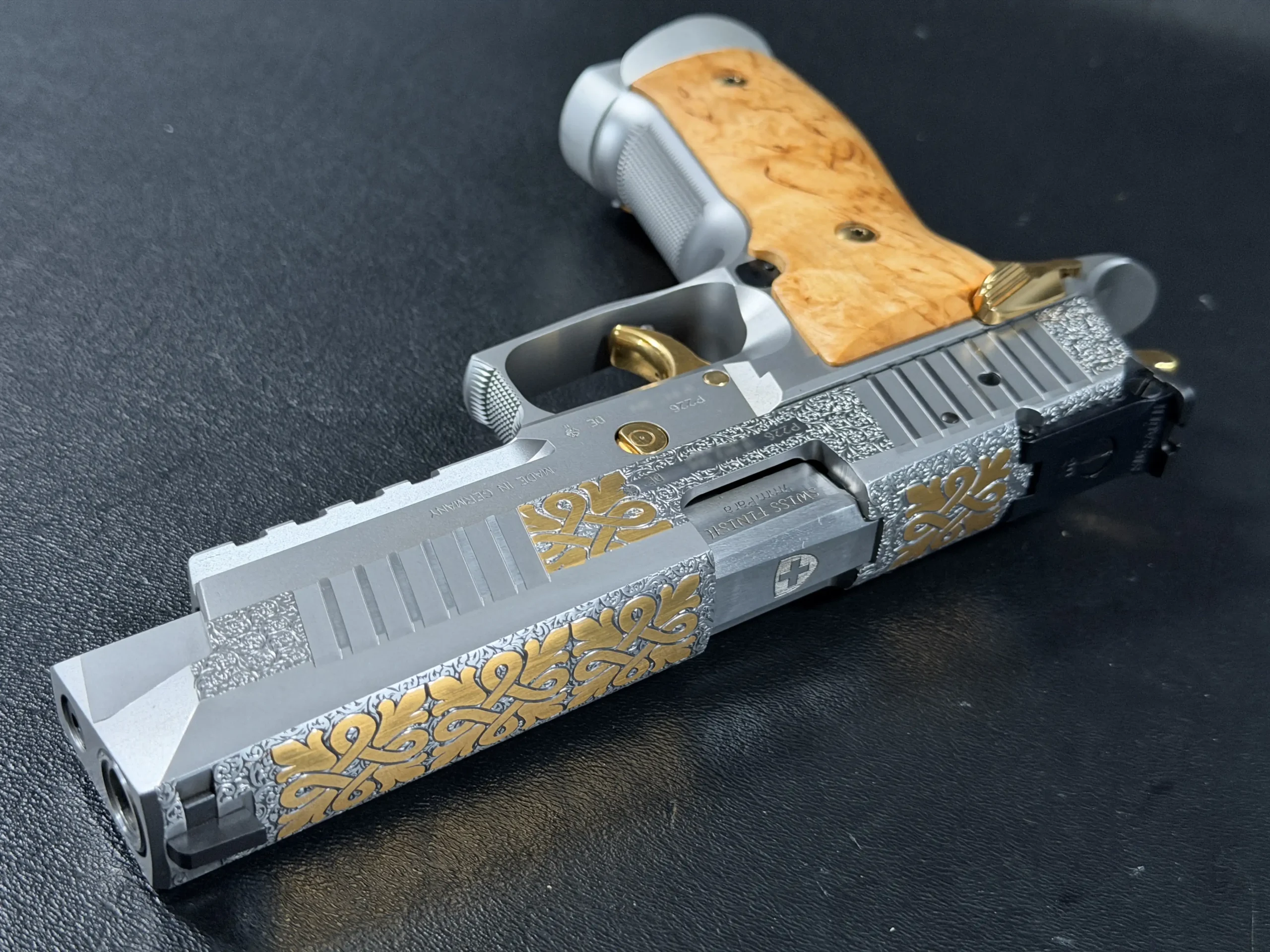 The SIG Sauer P226 X-Five Scandic Engraved, designed by Mueller Murgenthal, brings together the proven X-Series platform with finely executed decorative detail. Chambered in 9mm, this all-steel pistol features the extended slide and barrel configuration associated with the P226 X-Five.