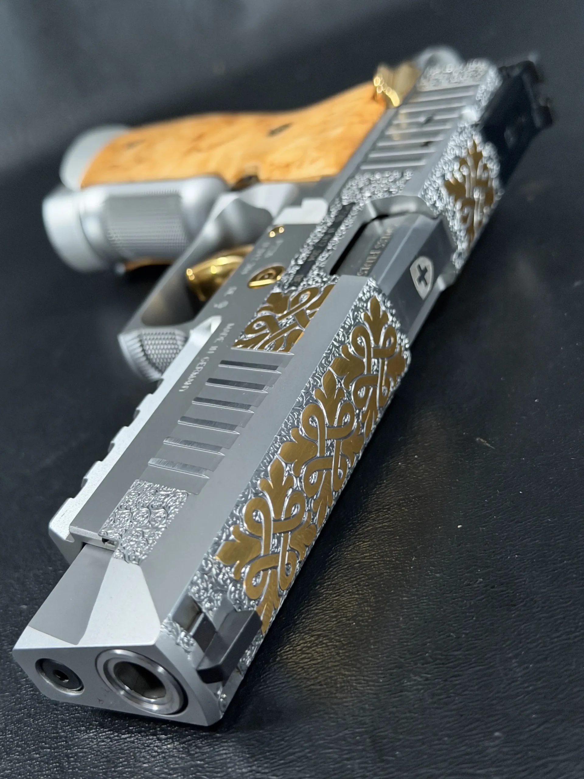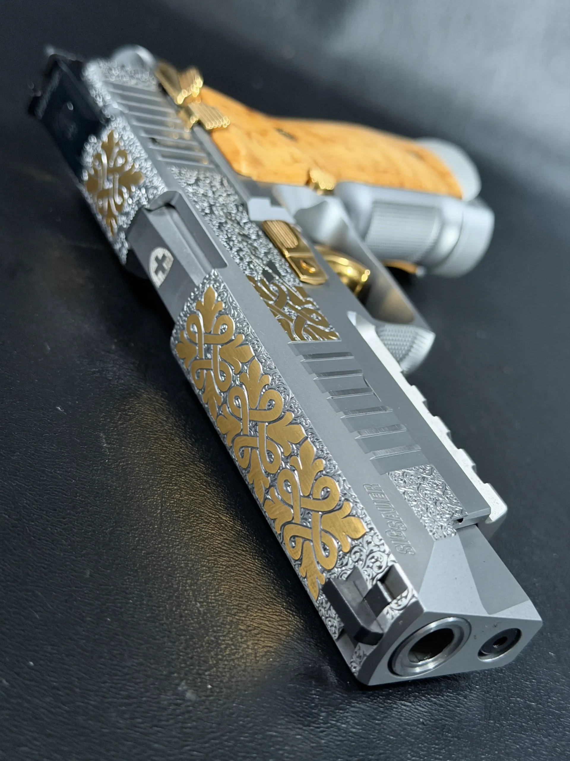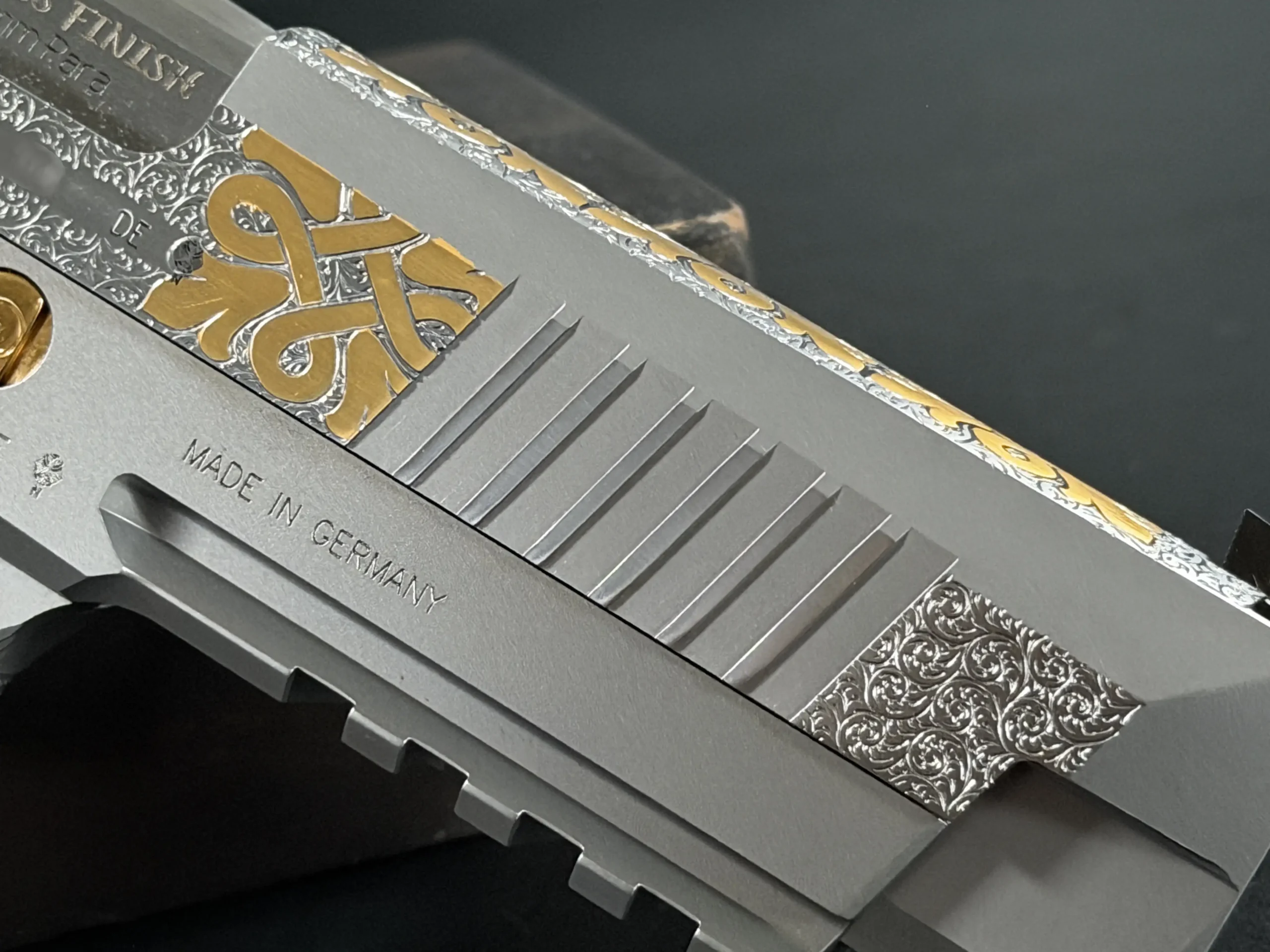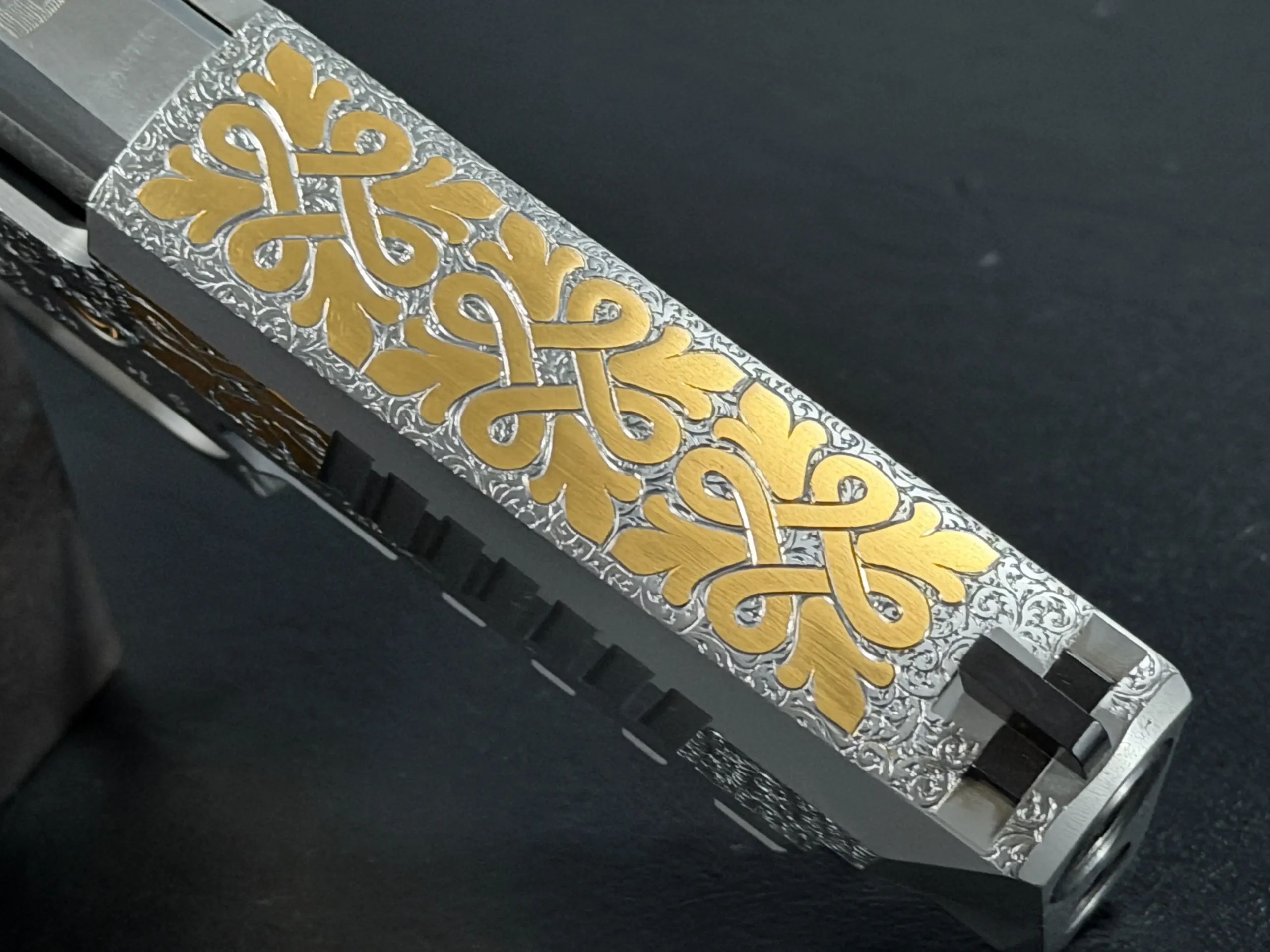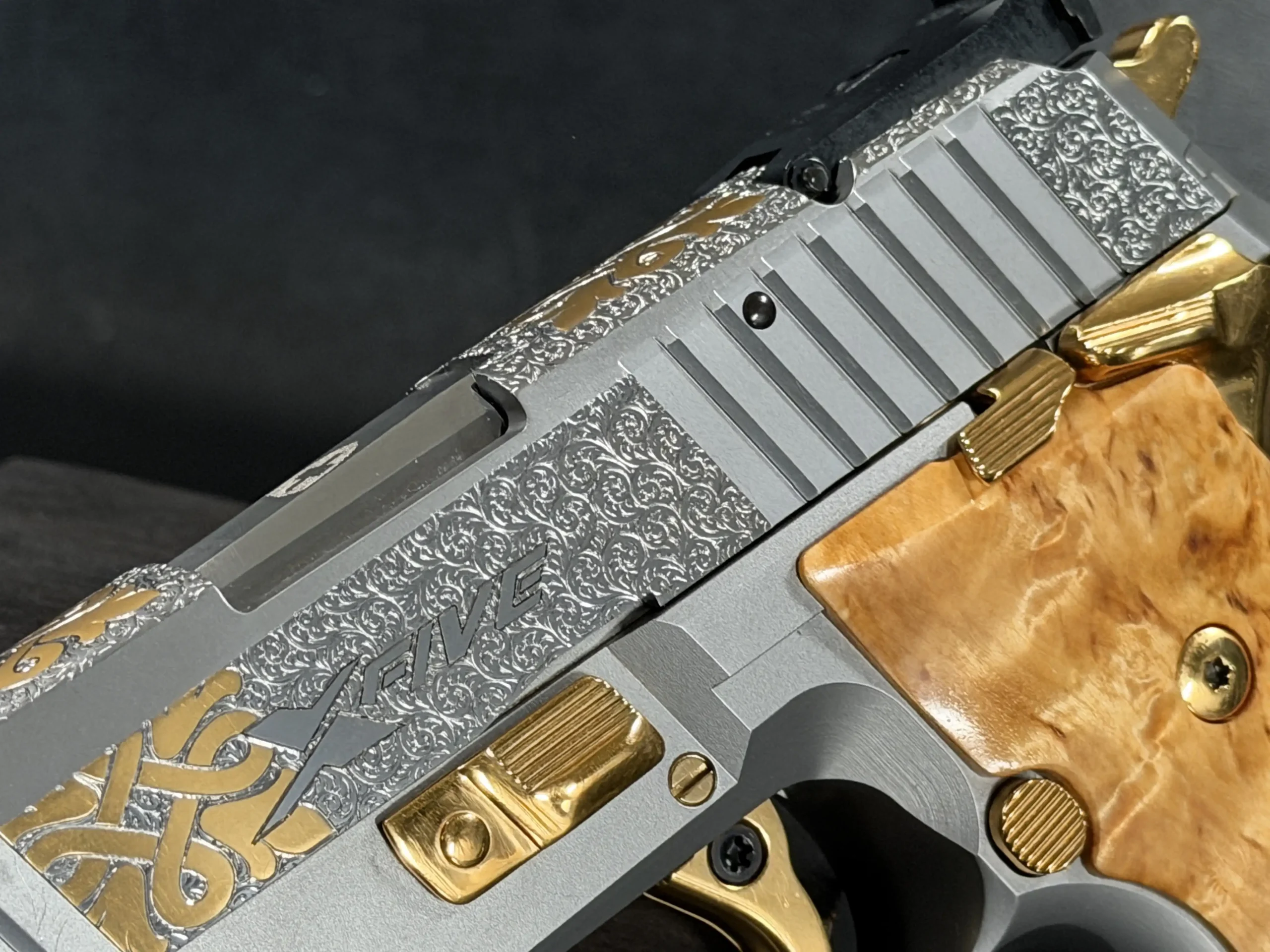 The slide and frame accents are finished with intricate Scandic-style engraving inspired by Nordic ornamental design. Gold-inlaid motifs are integrated throughout the engraved surfaces, while the X-Five insignia is worked into the overall pattern for a cohesive presentation.