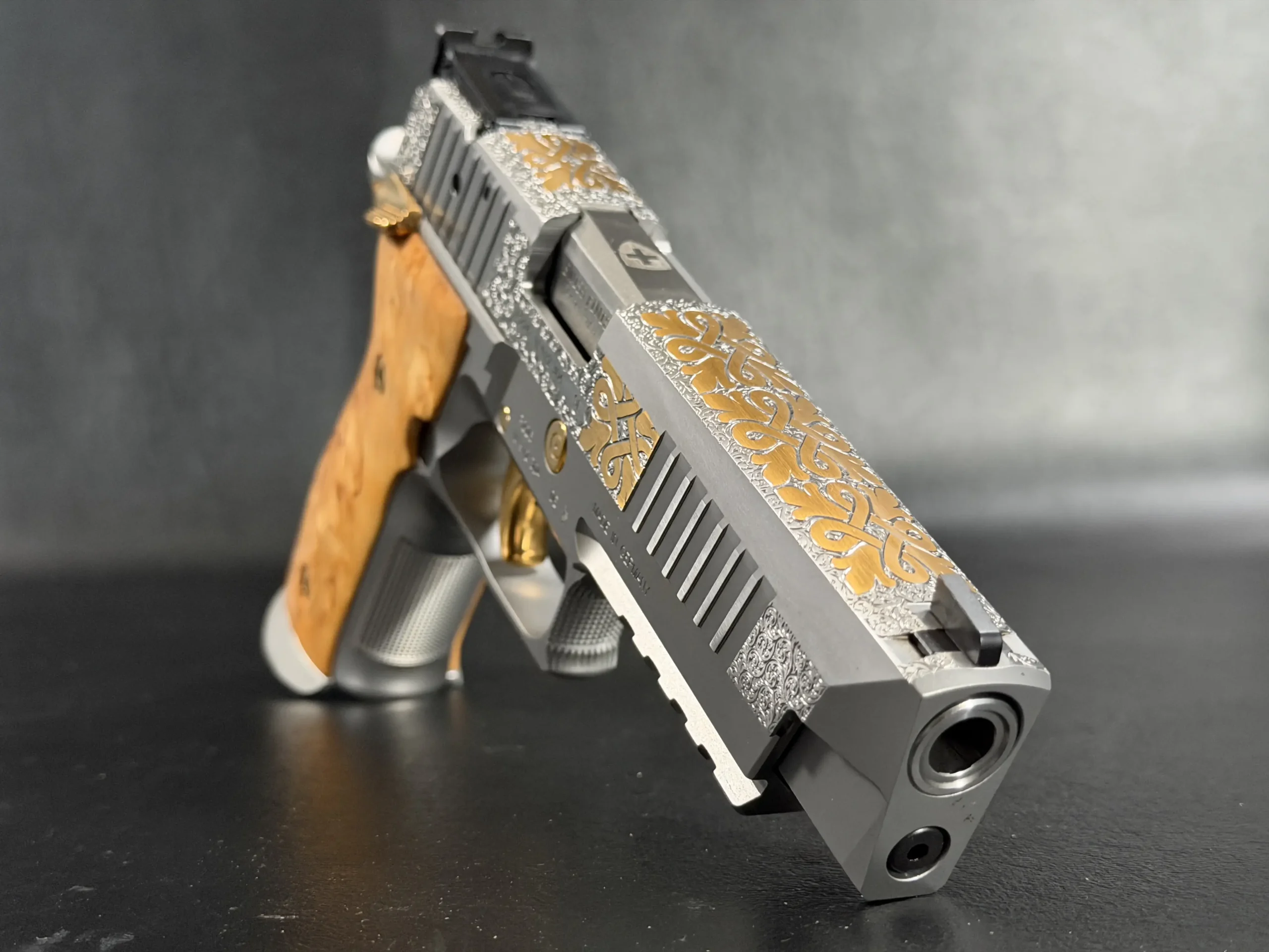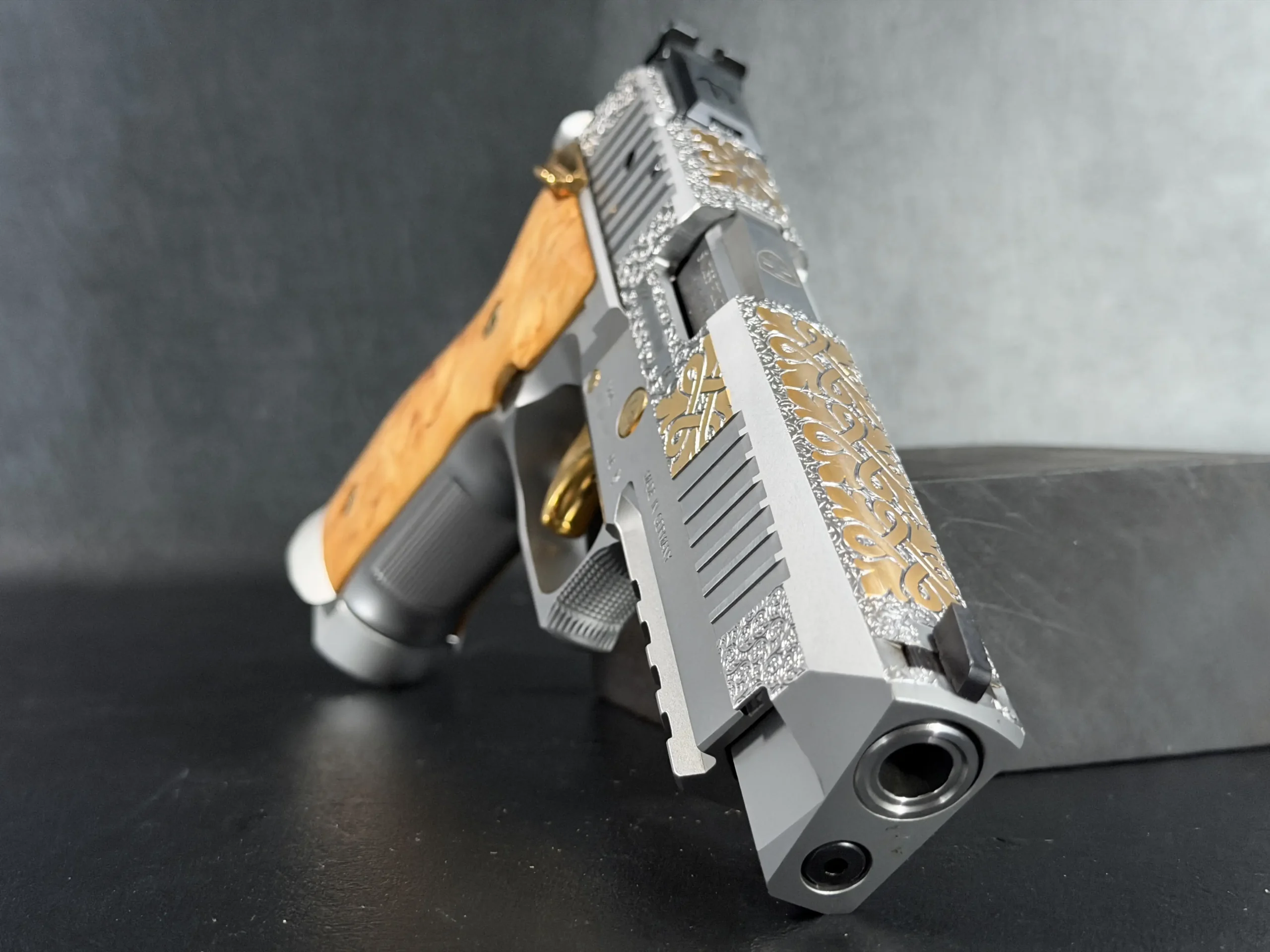 Gold-accented controls, including the trigger, magazine release, slide stop, and hammer, add visual contrast against the satin-finished steel. Figured burl wood grips complete the look, bringing warmth and natural grain variation to the pistol’s bold metalwork.