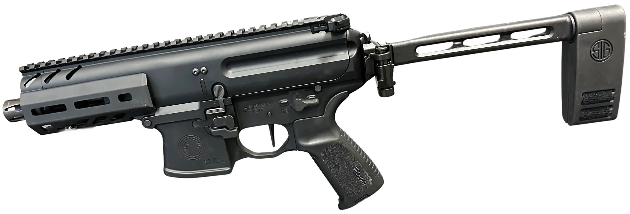 The SIG Sauer MPX 9MM Pistol is a compact 9mm platform featuring SIG Sauer’s short-stroke gas piston operating system, fully ambidextrous controls, and a minimalist folding brace assembly. Its continuous top rail, modular handguard, and factory muzzle device give it a streamlined, modern configuration.