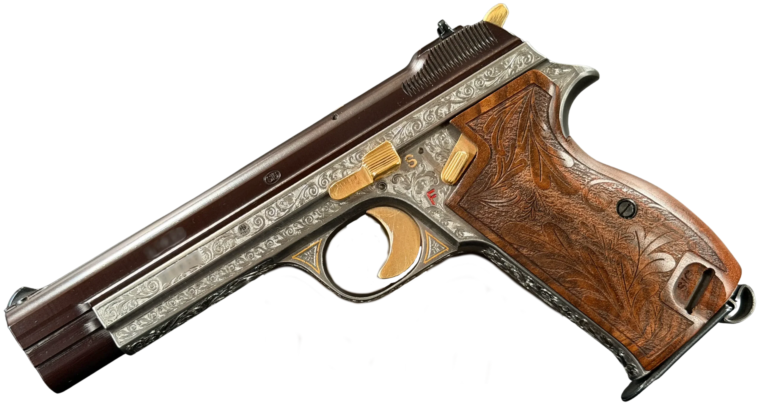 At its core, this remains a SIG Sauer P210-4, combining the model’s fixed barrel layout with highly detailed finishing and decorative workmanship.