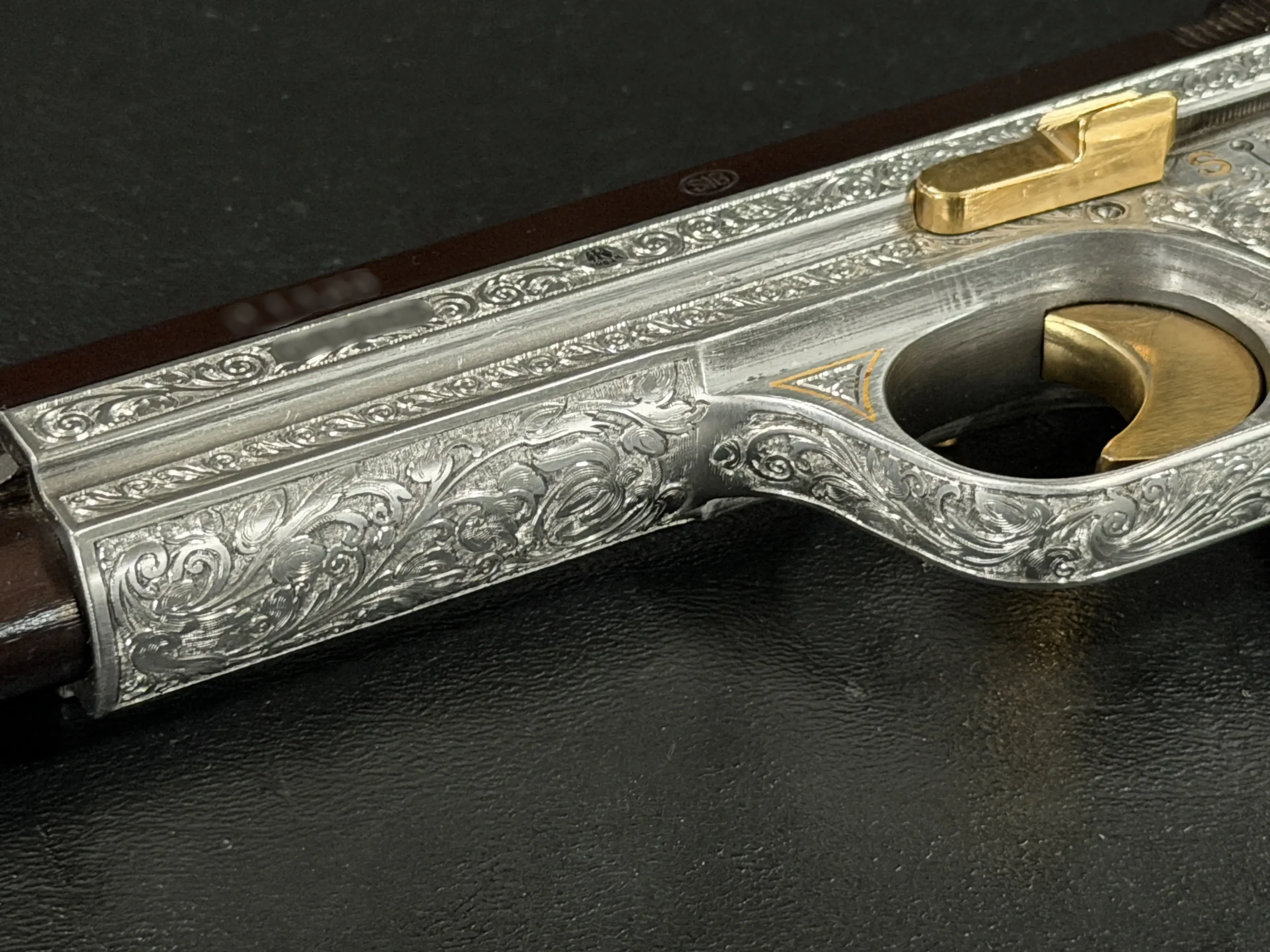 Walnut grips with carved leaf motifs echo the engraving and complete the overall presentation. Above, the slide wears a deep blued finish that pairs beautifully with the brighter tones of the frame and highlights the lines of the hammer and rear serrations.