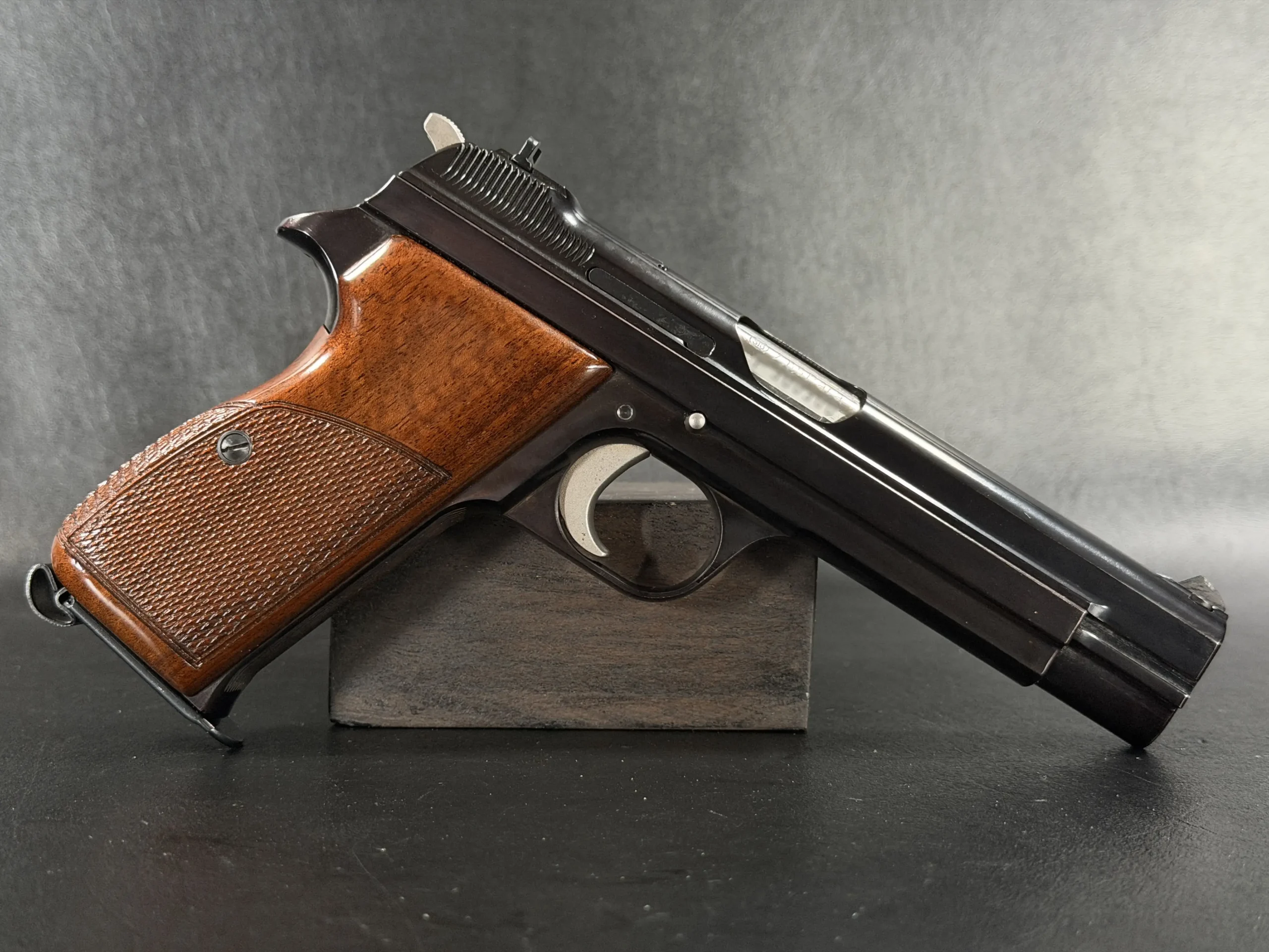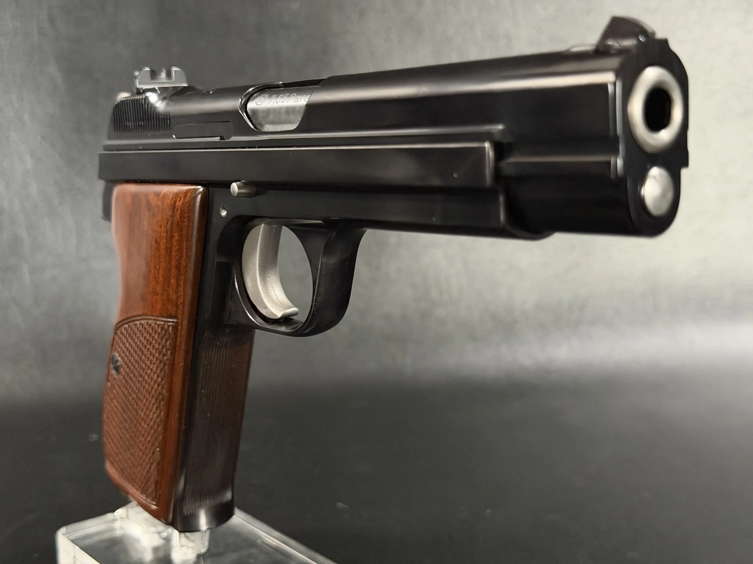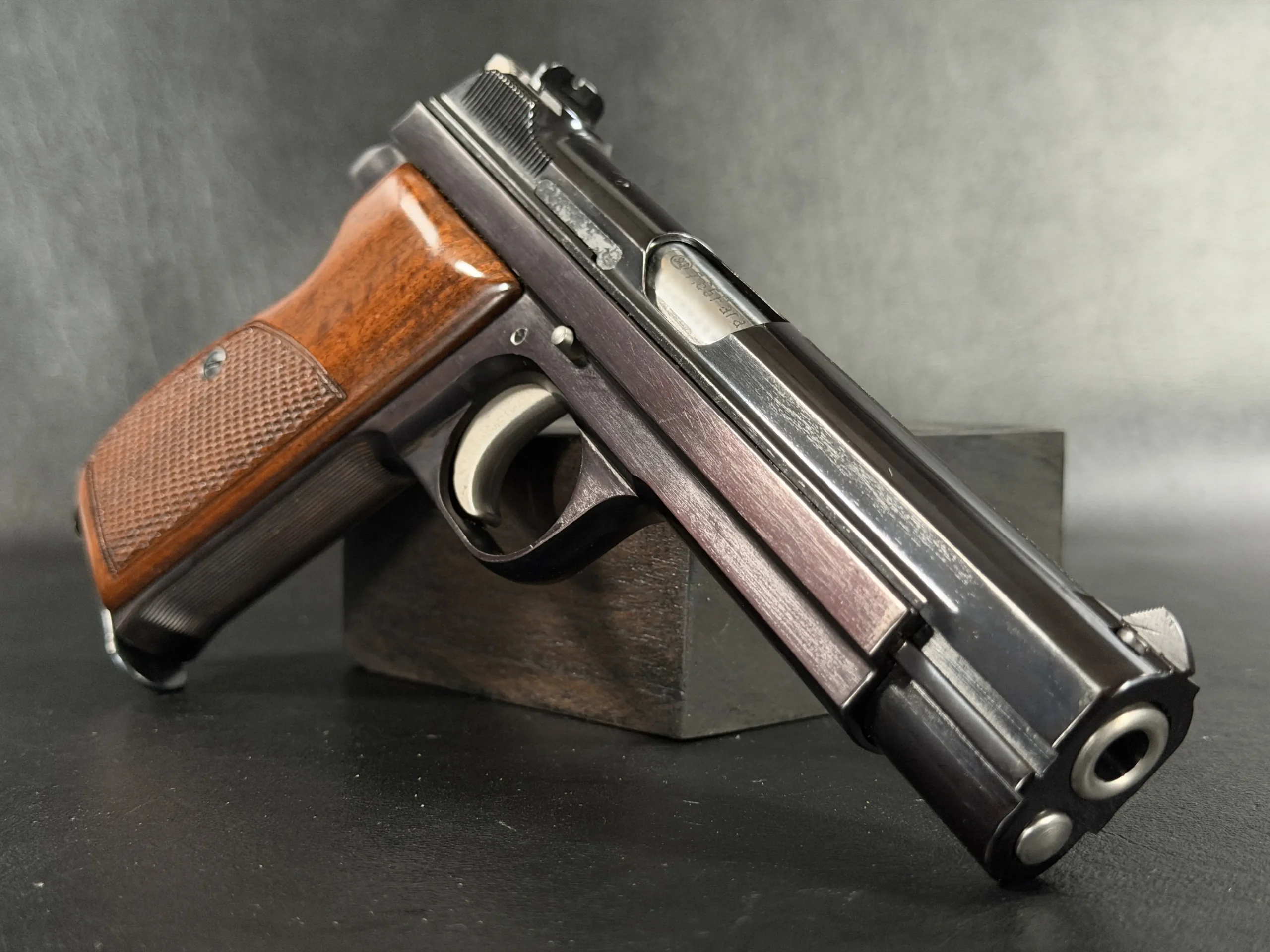 This example features deep bluing, finely checkered walnut grips, polished controls, and precise machining throughout. The overall presentation reflects the restrained, elegant character for which the model is widely recognized.
