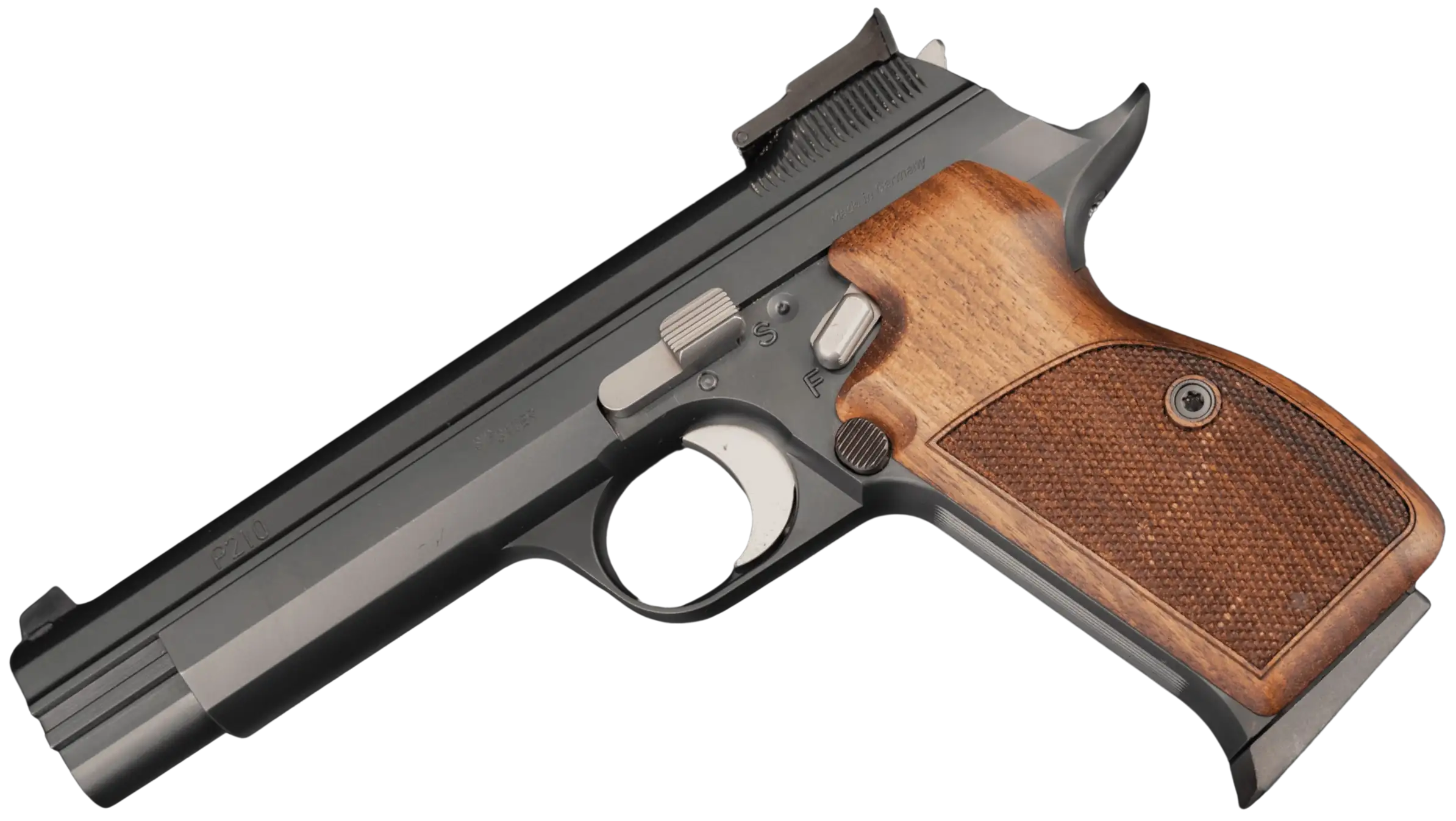 The deep black finish pairs neatly with finely checkered walnut grips for a look that feels both traditional and contemporary. Details such as the extended beavertail, refined controls, and updated frame profile speak to a careful evolution of the platform without losing the character that made the P210 so respected.