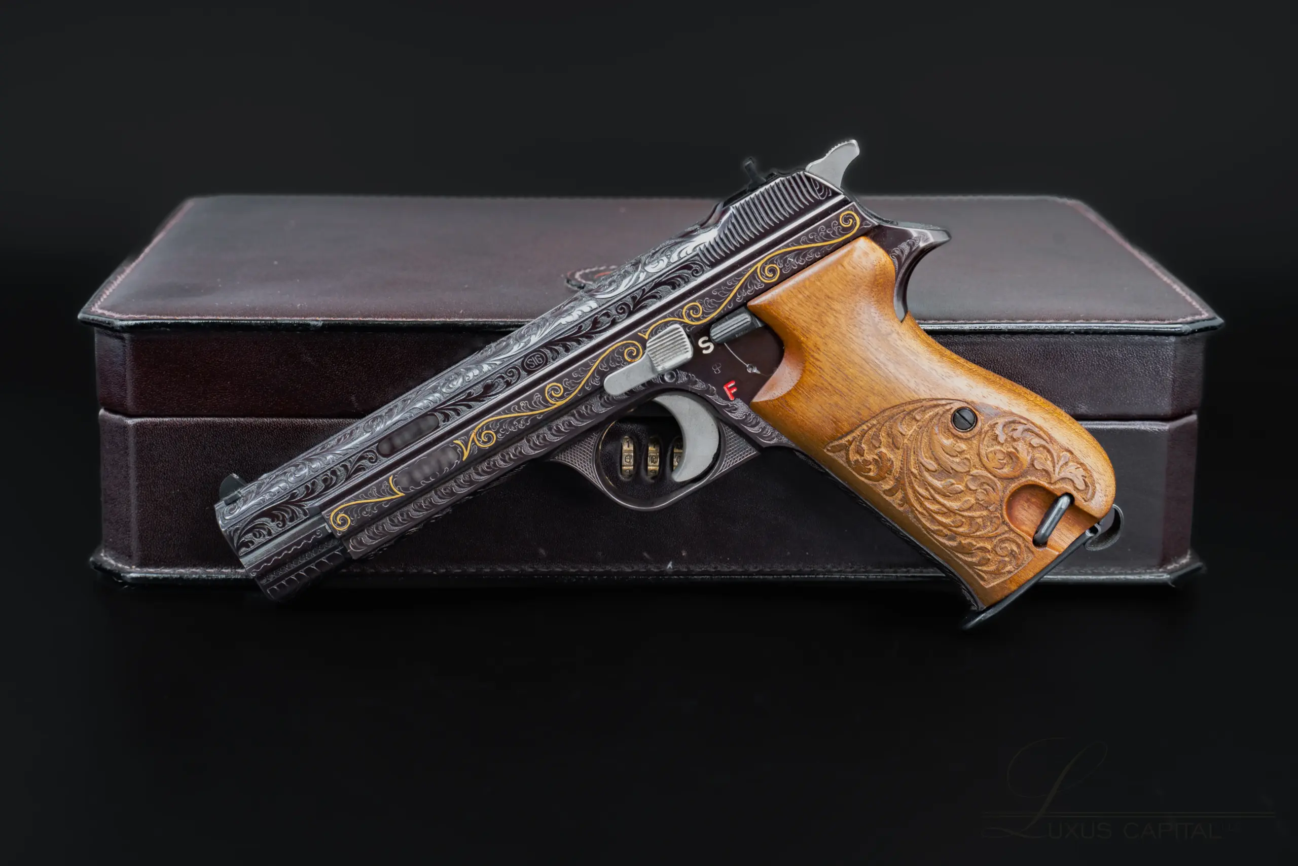 This example features deep-cut ornamental engraving across the slide, frame, and controls, with gold scroll inlays that stand out against the dark steel finish. Carved walnut grips echo the engraved motifs, adding warmth and visual contrast to the pistol’s overall design.