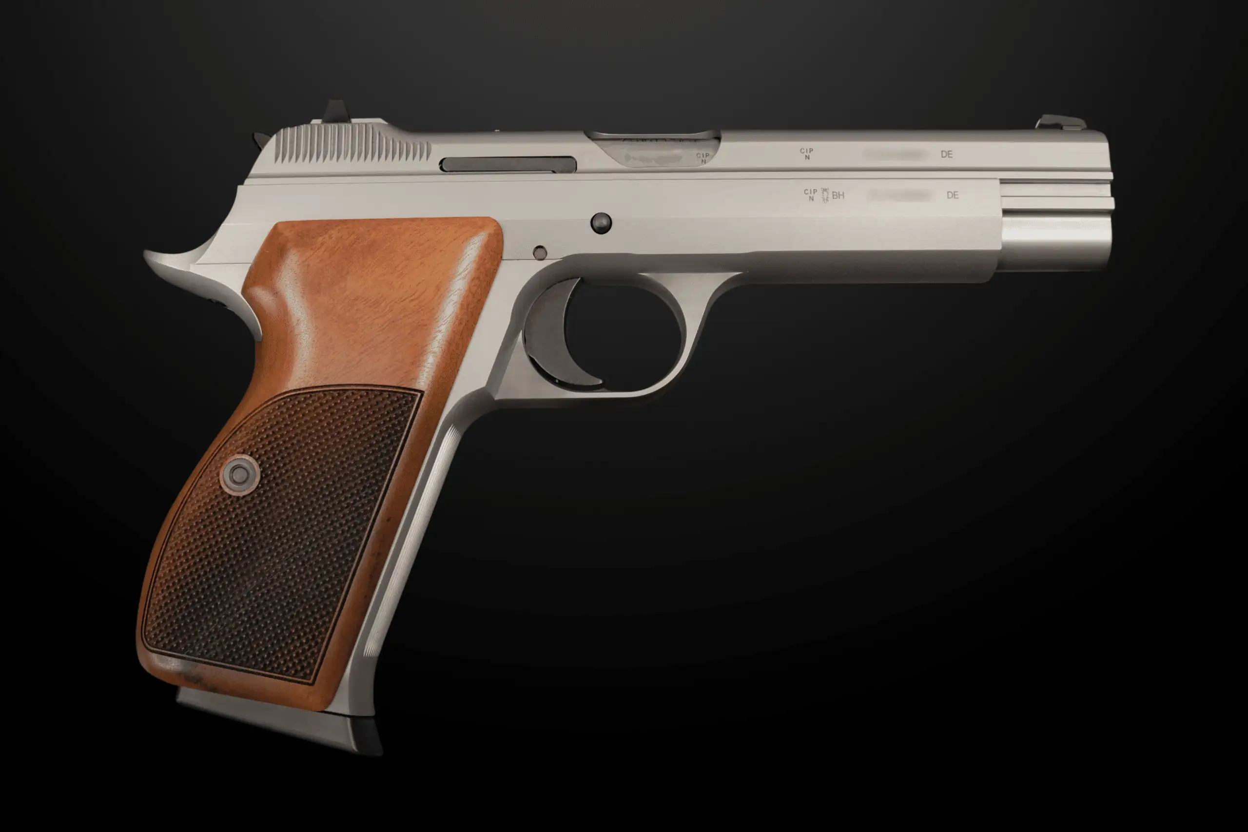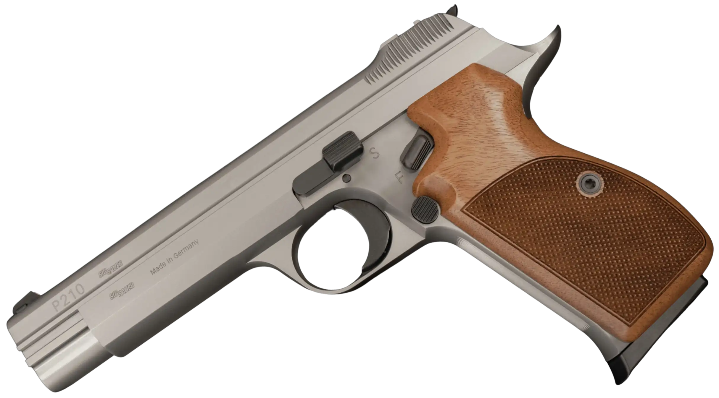 The SIG Sauer P210 Legend Silber brings together the classic P210 profile with a refined satin silver finish and finely checkered walnut grips. Chambered in 9mm, it features the platform’s distinctive long, low-profile slide design and the clean, purposeful styling that has made the P210 so widely admired.