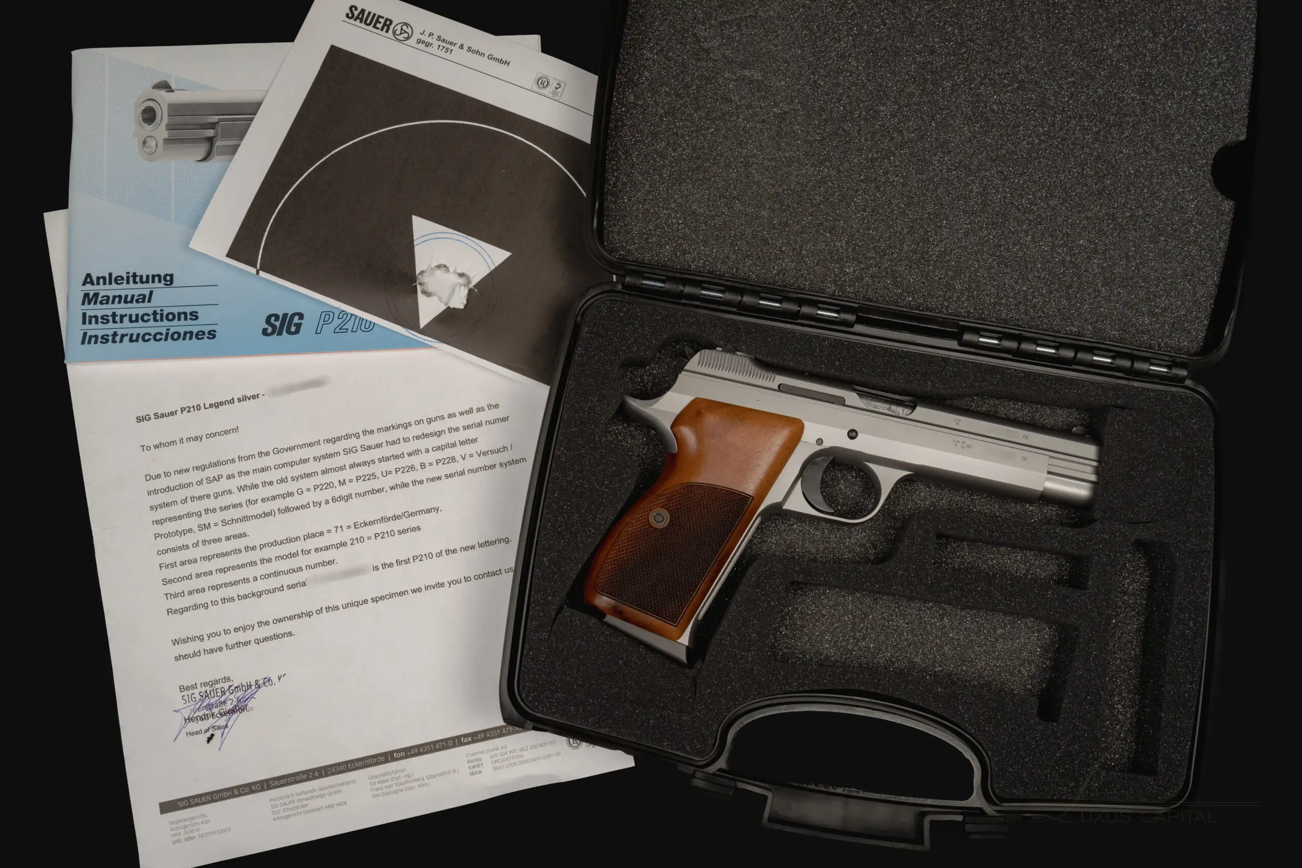 SIG Sauer’s P210 Legend Silber pairs a satin silver finish with checkered walnut grips in the classic P210 format. Chambered in 9mm, this example includes the original documents, box, and a letter from SIG regarding the updated numbering system.