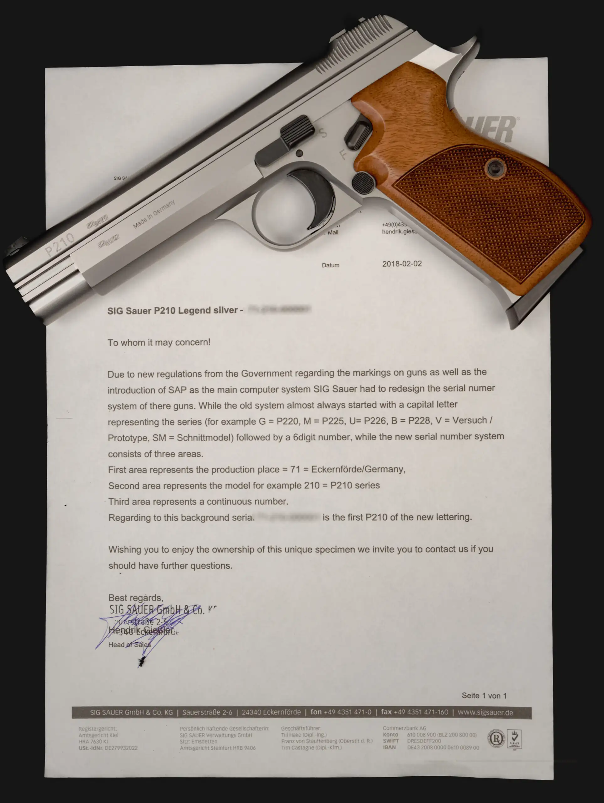 This example is notable for its place within SIG Sauer’s updated numbering system and is accompanied by original factory documentation explaining that transition. Included with the pistol are the original documents, the box, and a letter from SIG.