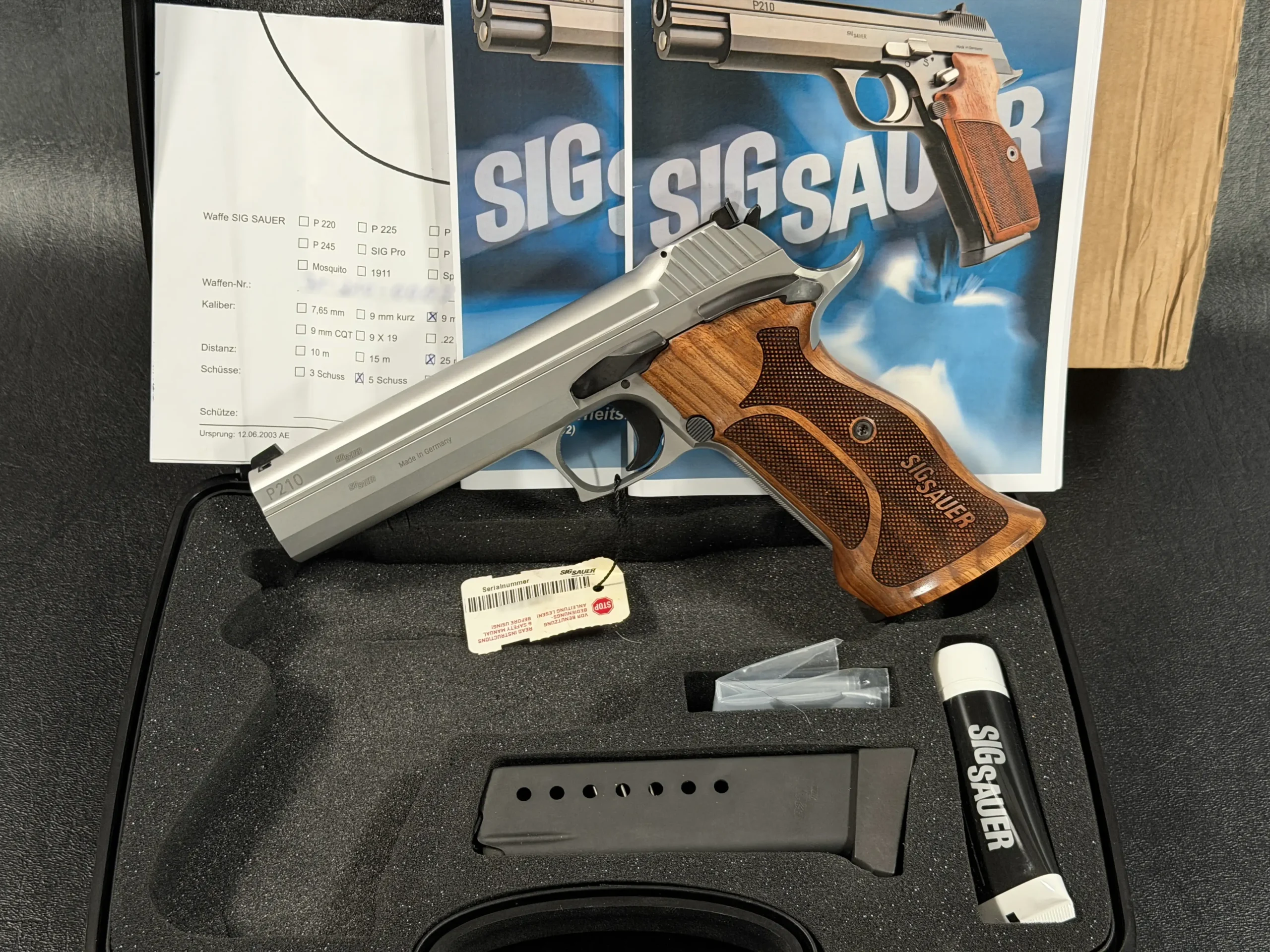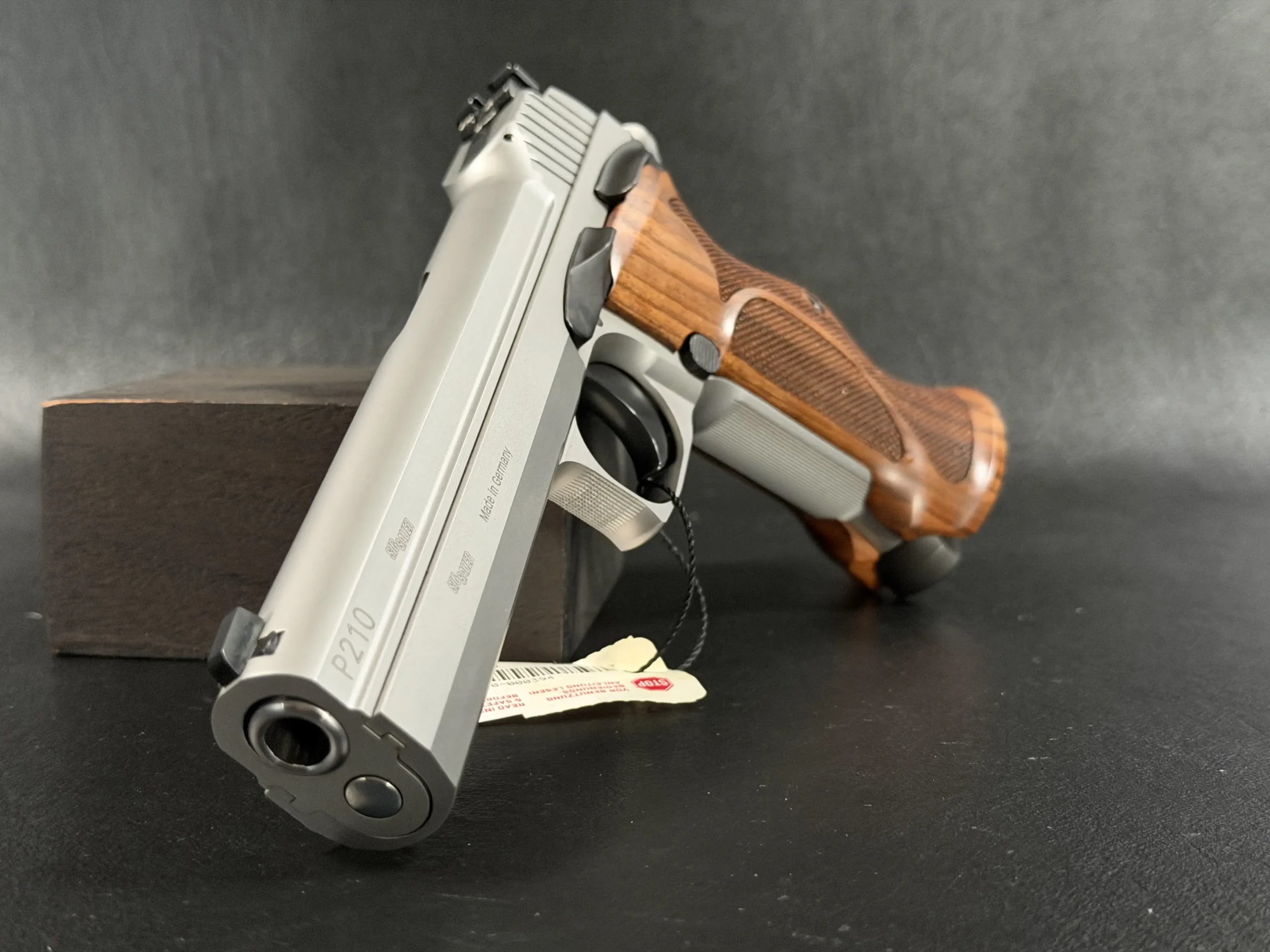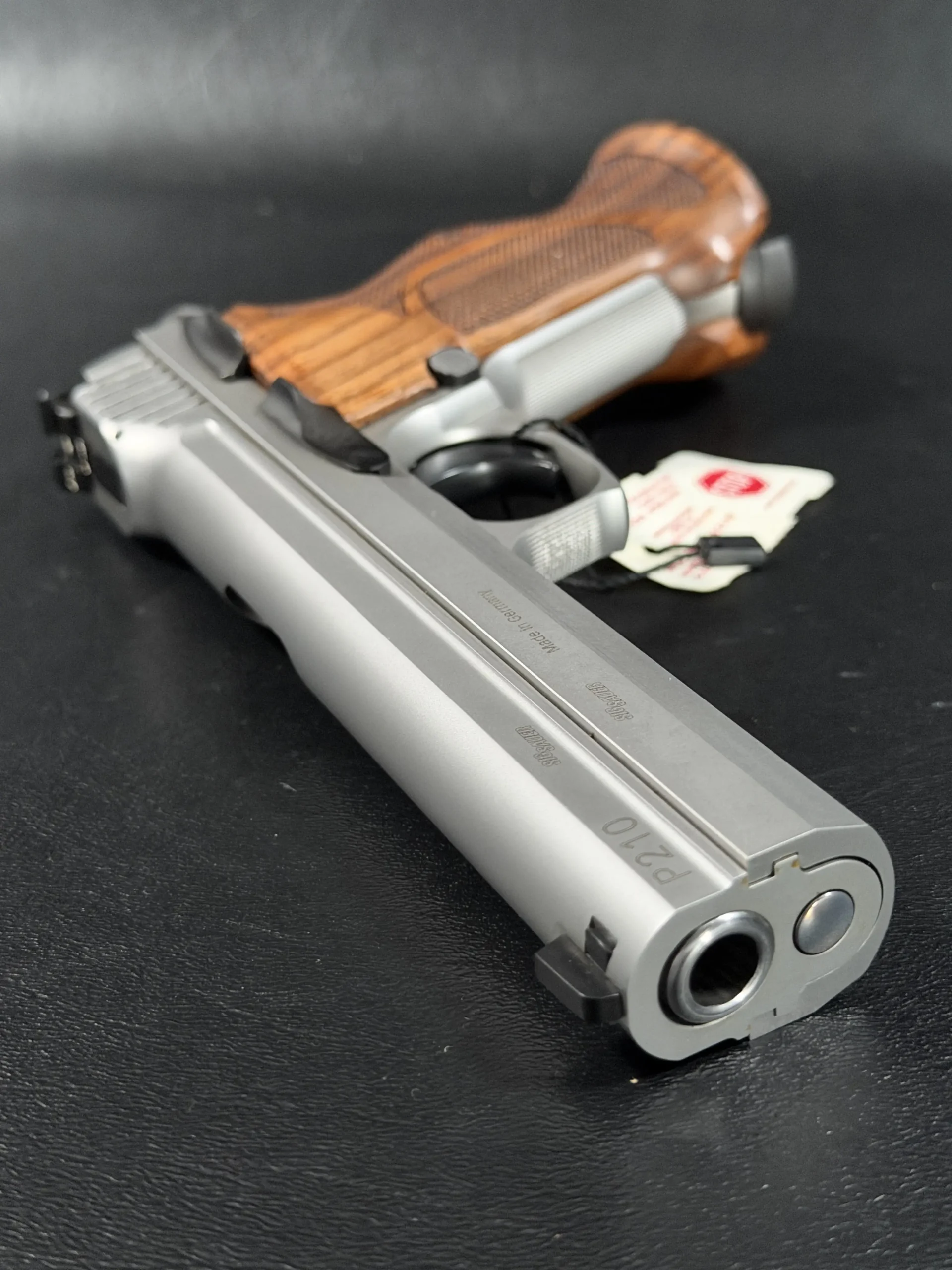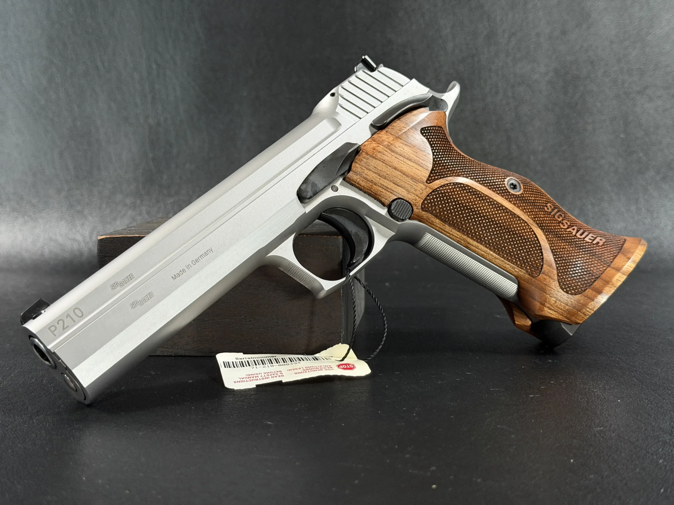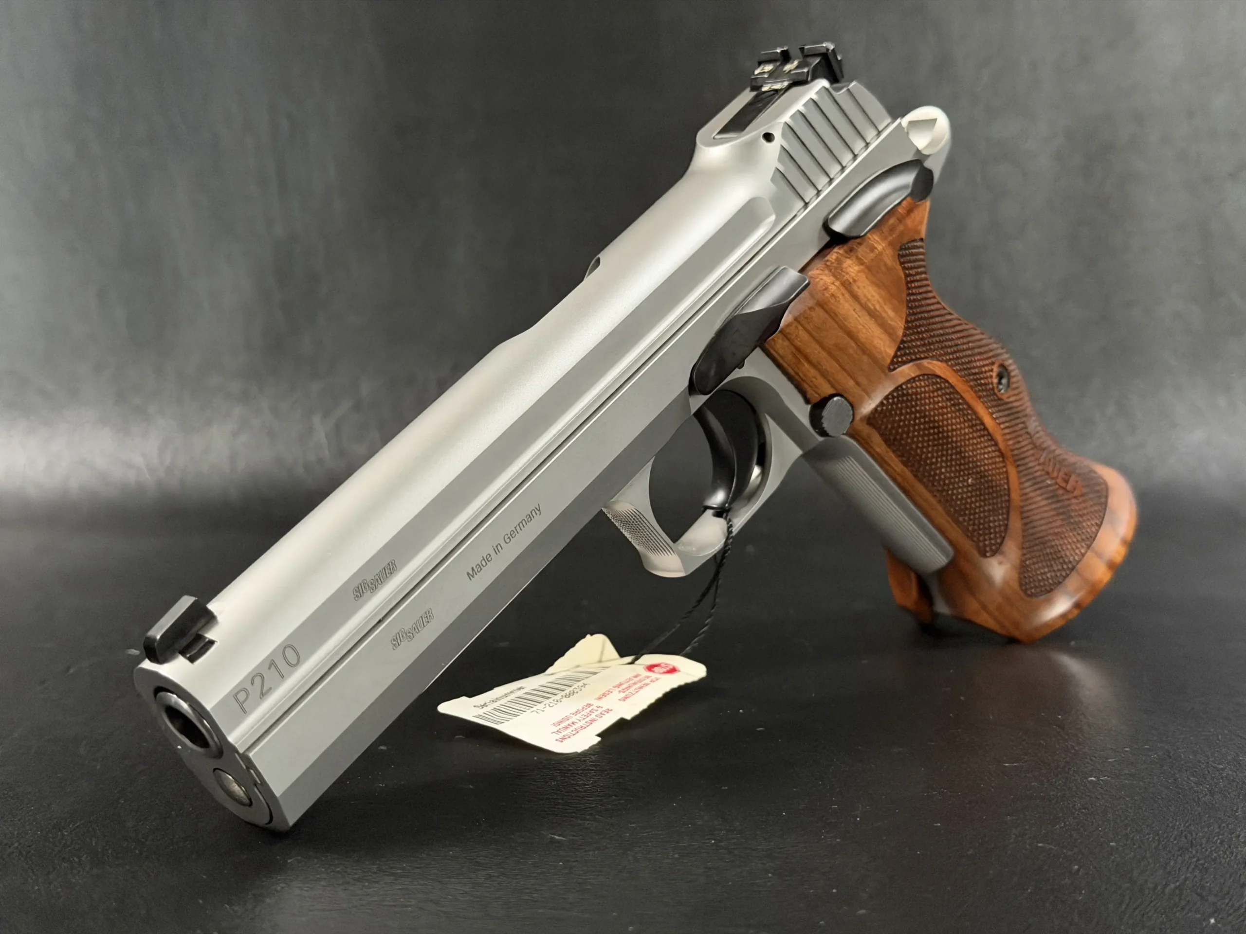 This configuration features a 5-inch barrel for added sight radius and balanced handling, along with adjustable target sights. The pistol follows the classic P210 pattern with an internal rail system and finely fitted slide-to-frame relationship, paired with the crisp trigger feel for which the model is well known.