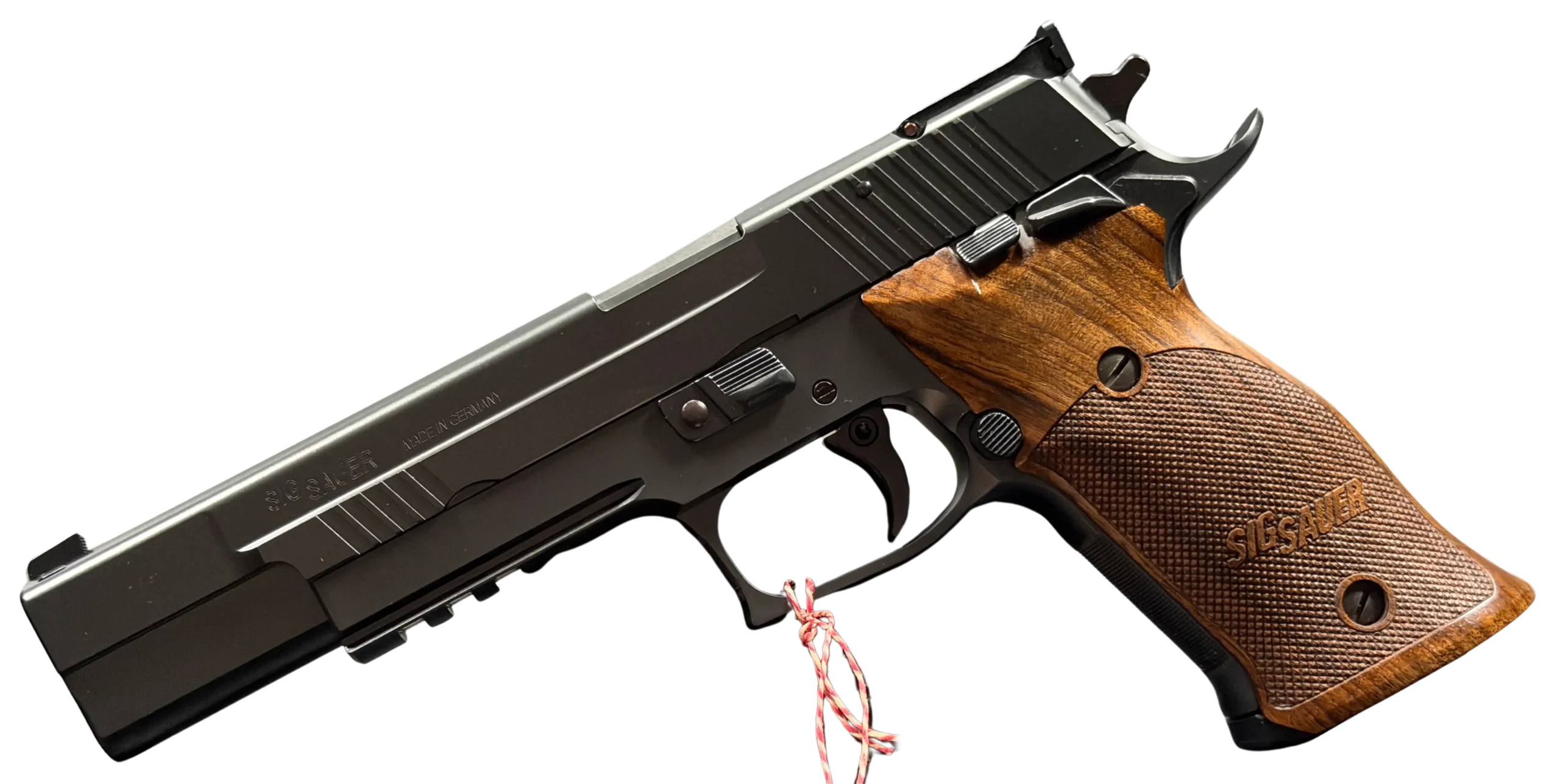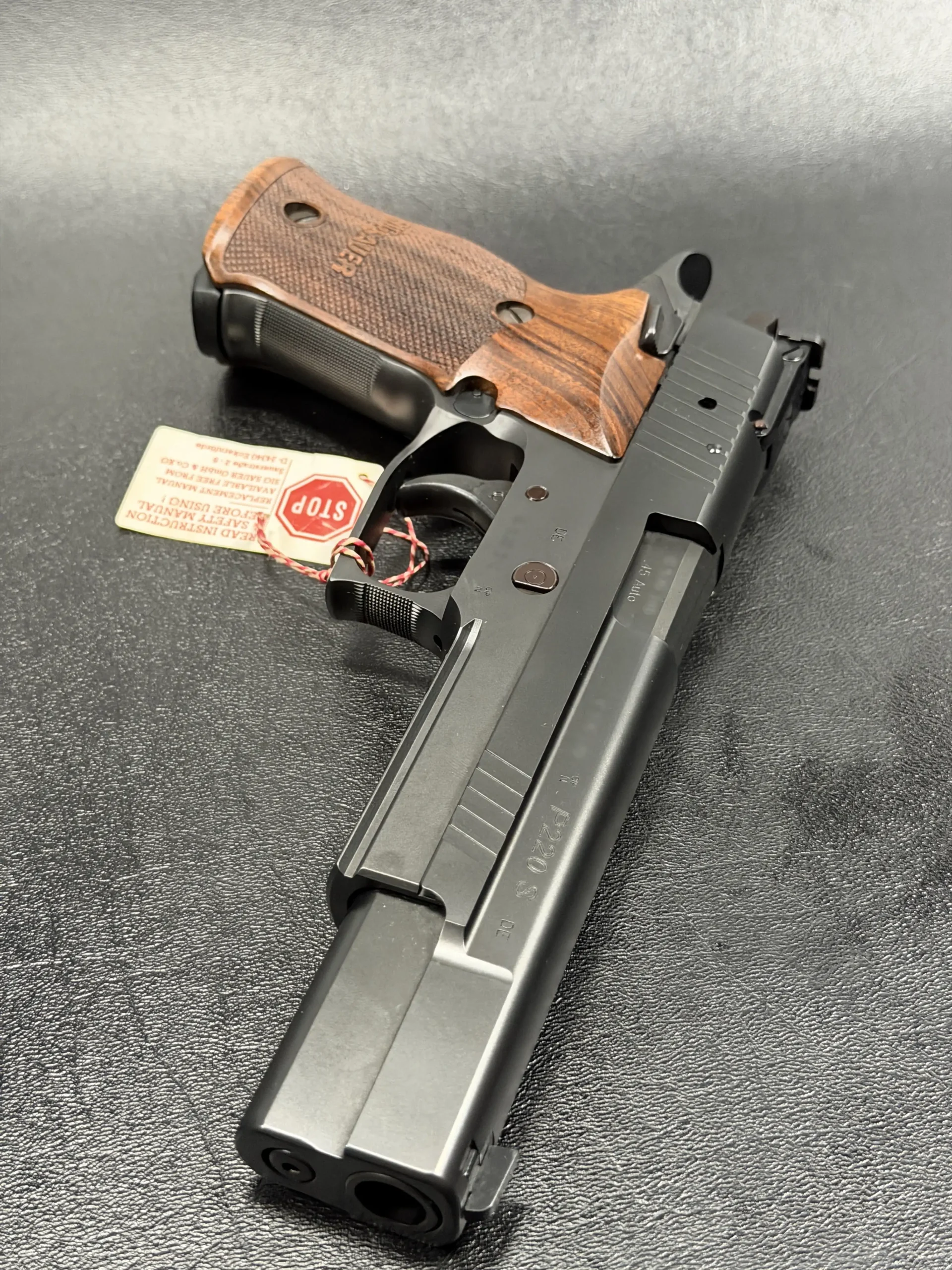The SIG Sauer P220 X-Six Black is a purpose-built X-Series sport pistol chambered in .45 ACP. Its long slide, extended dust cover, black finish, and factory wood grips give it a distinctive balance of precision-focused design and refined presentation.