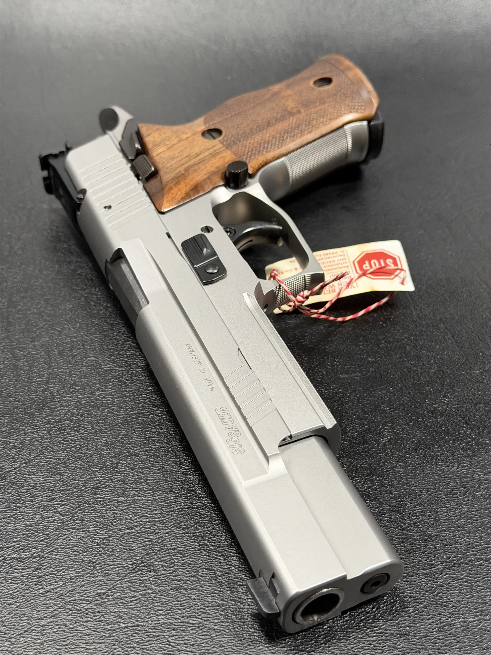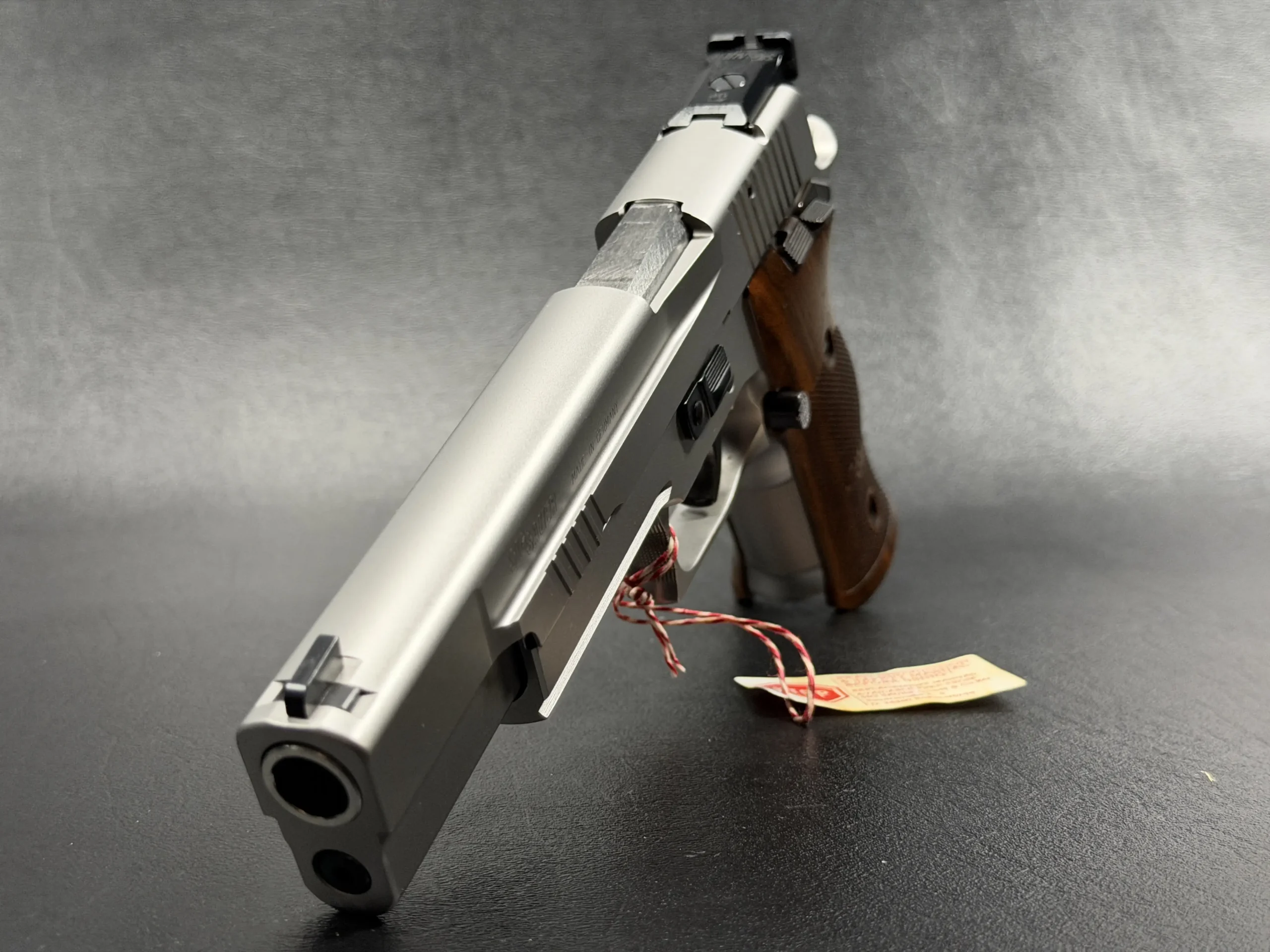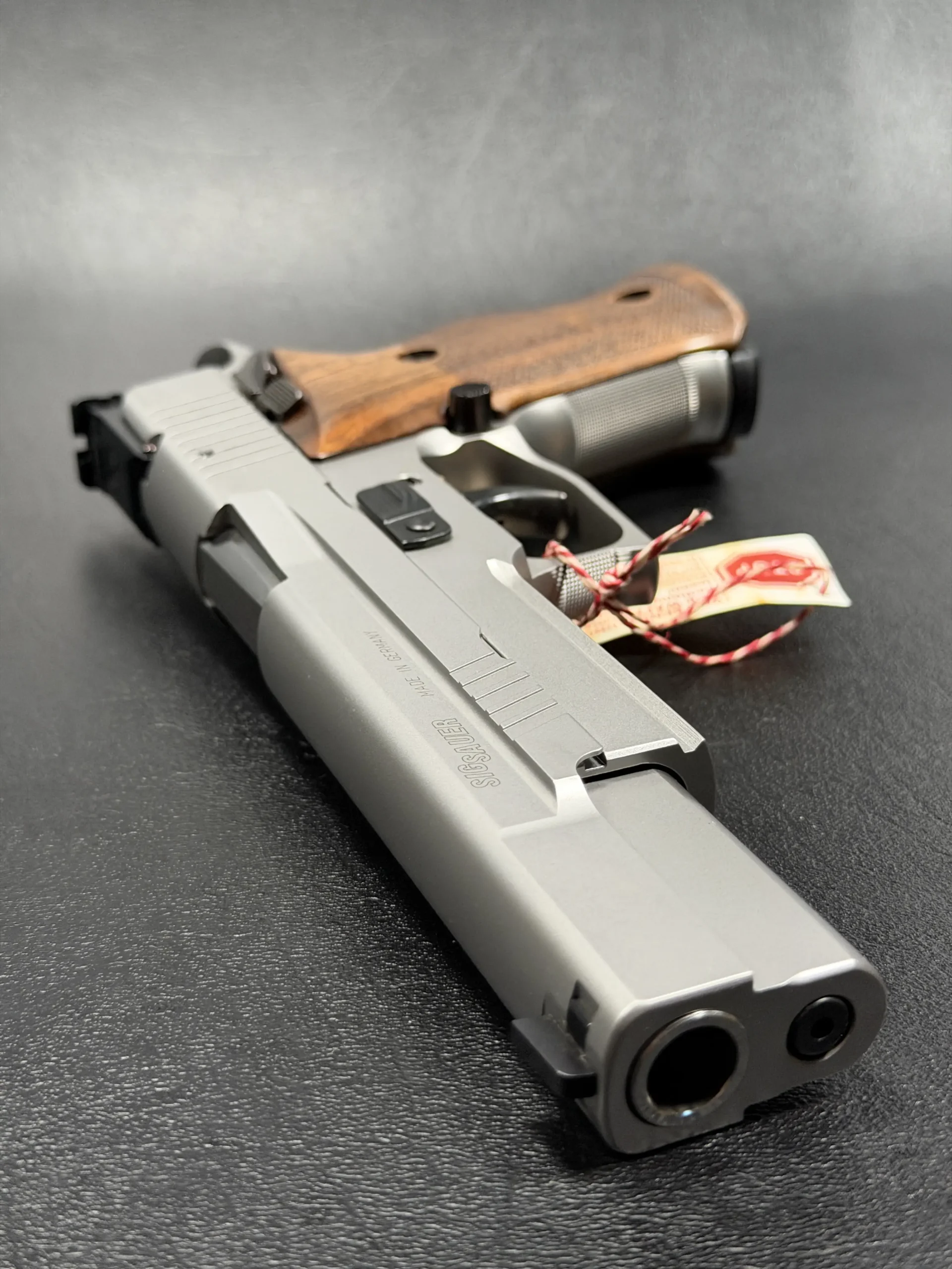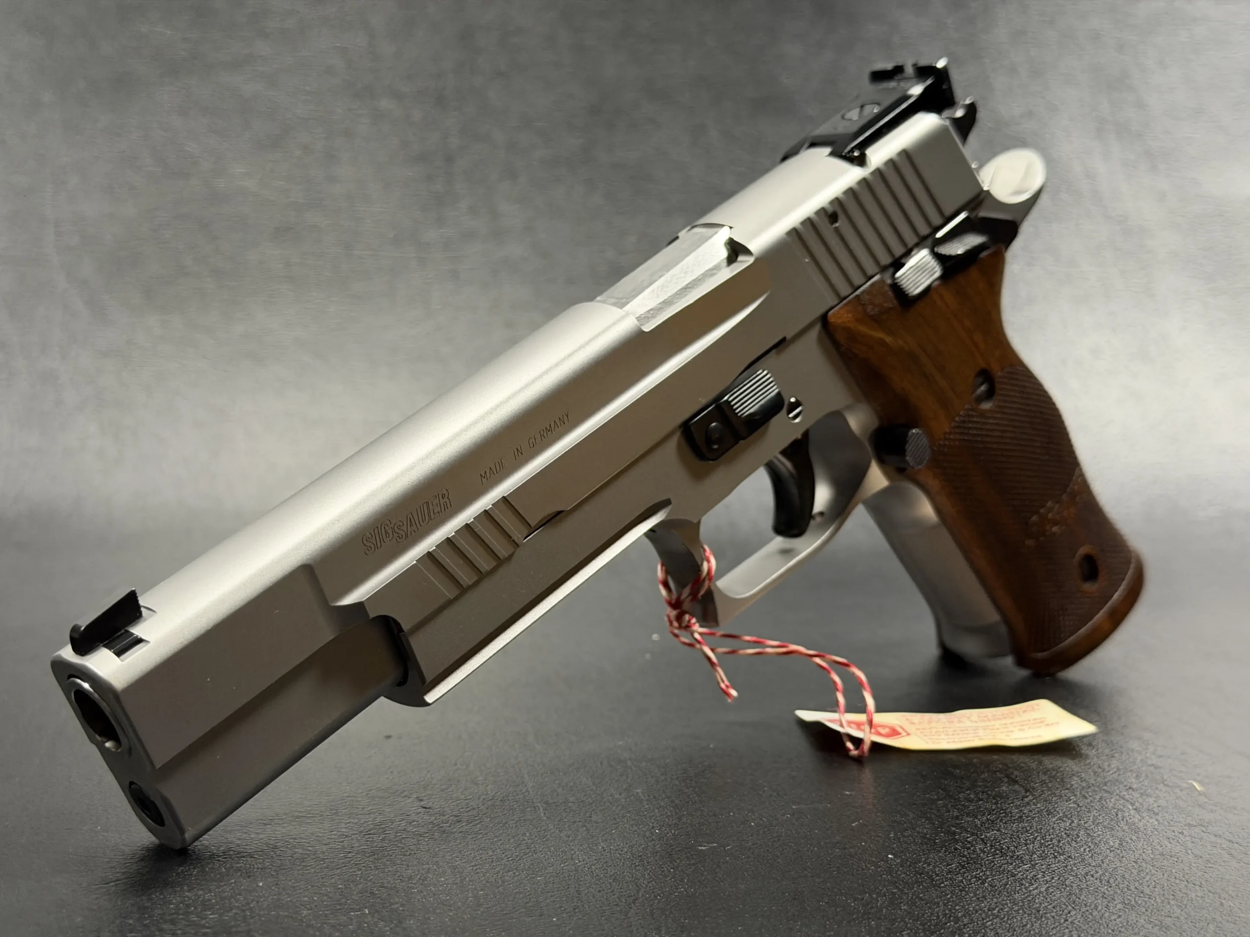 German-made SIG Sauer P220 X-Six Silver with a matte silver finish, long slide and barrel, and classic wooden grip panels. A refined X-Series pistol with competition-inspired styling and a crisp trigger.