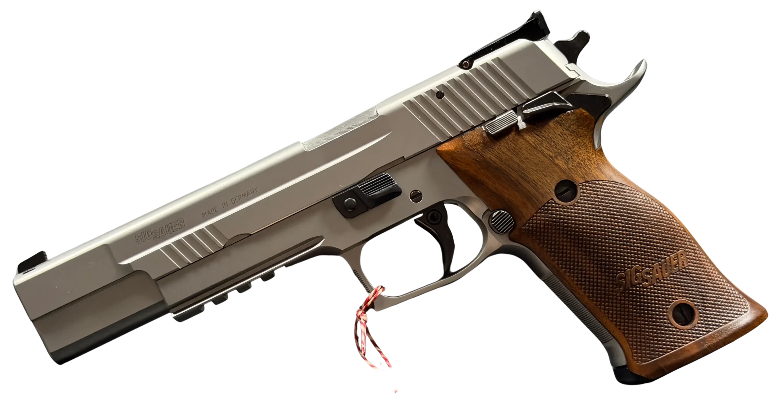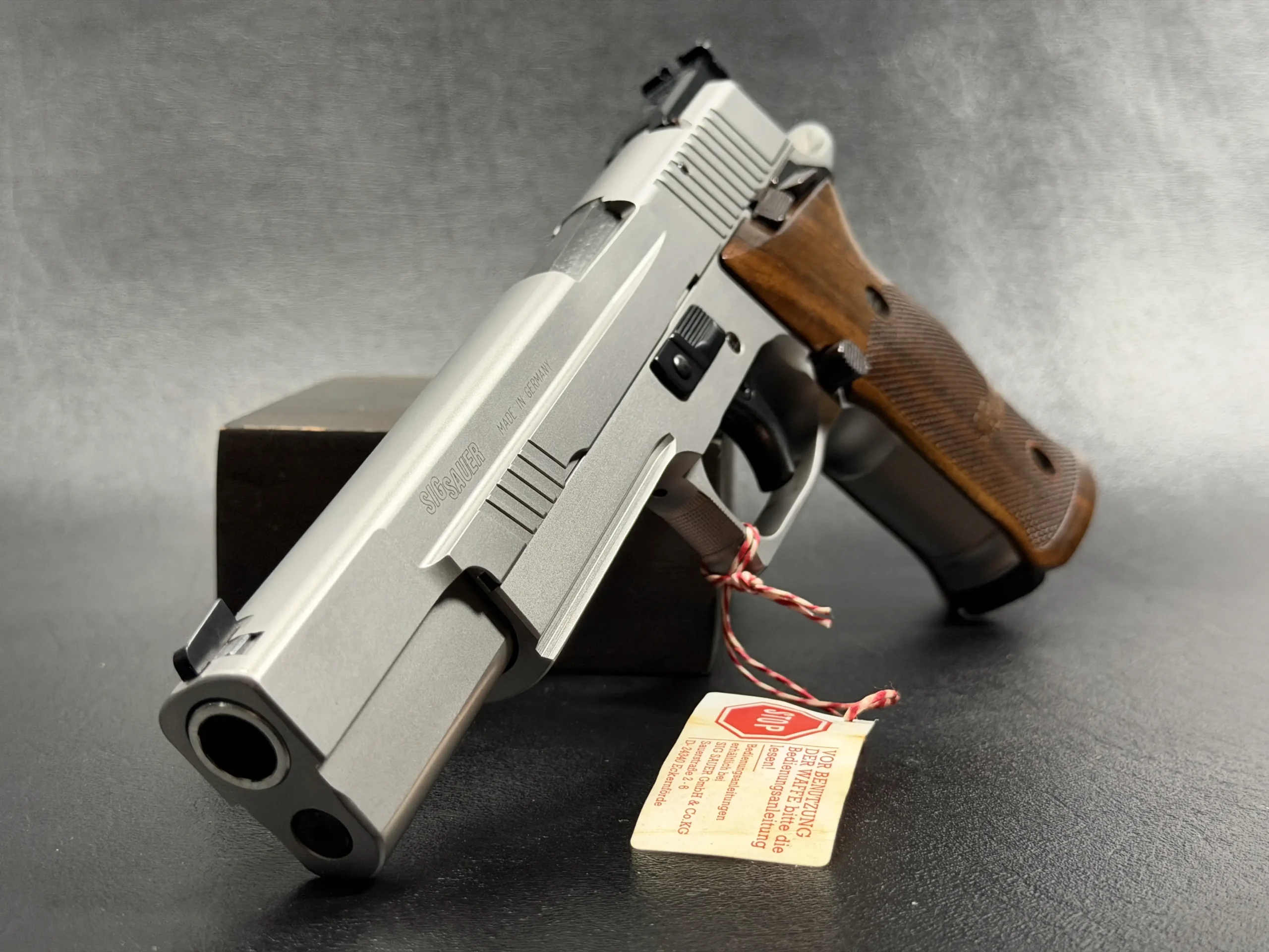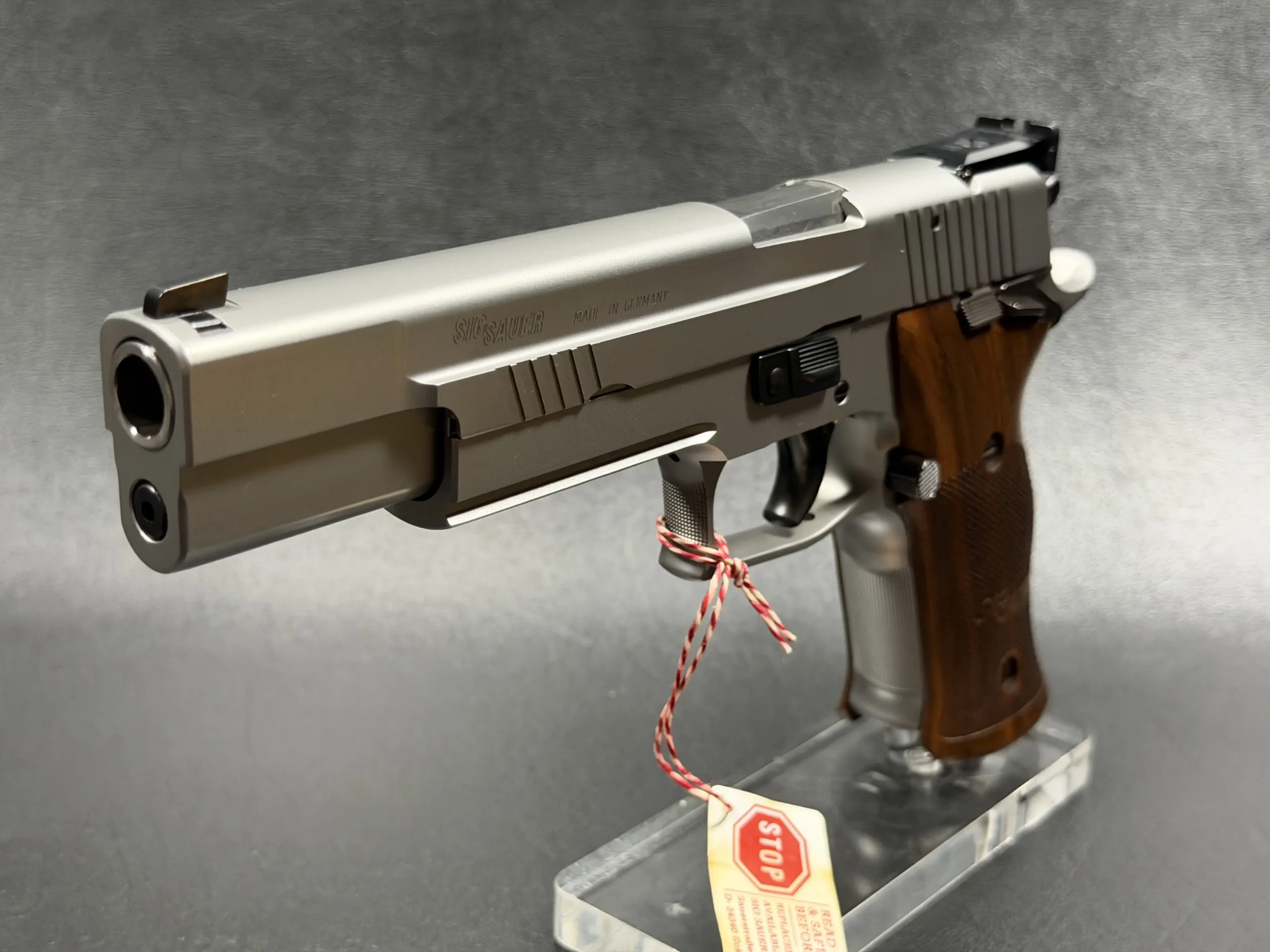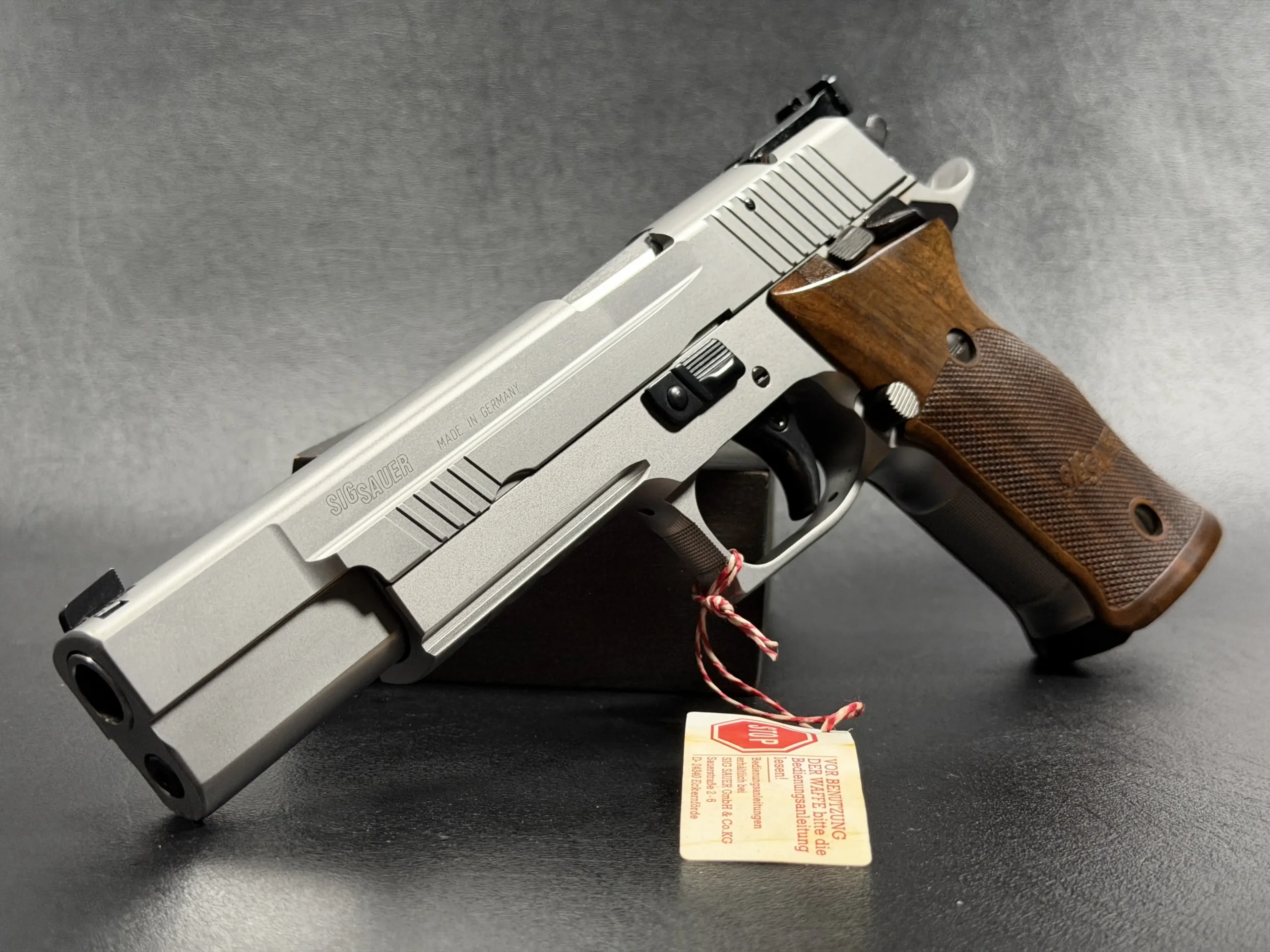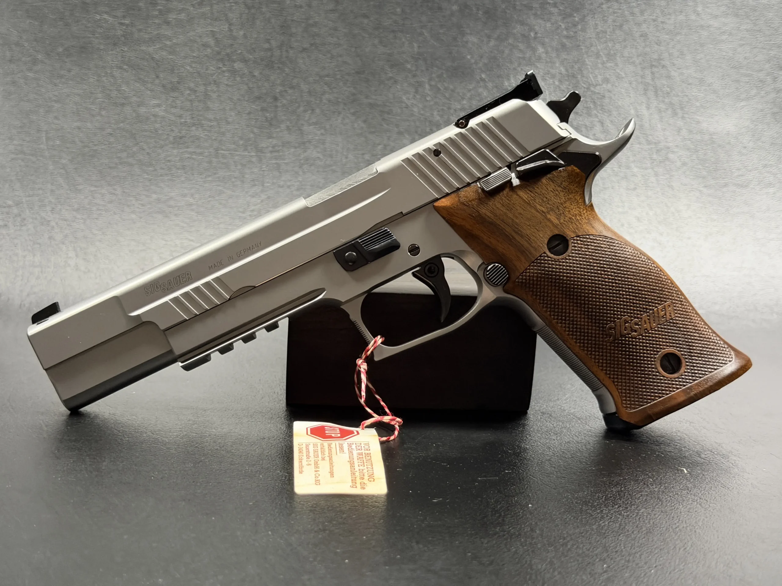 German-made SIG Sauer P220 X-Six Silver with a matte silver finish, long slide and barrel, and classic wooden grip panels. A refined X-Series pistol with competition-inspired styling and a crisp trigger.