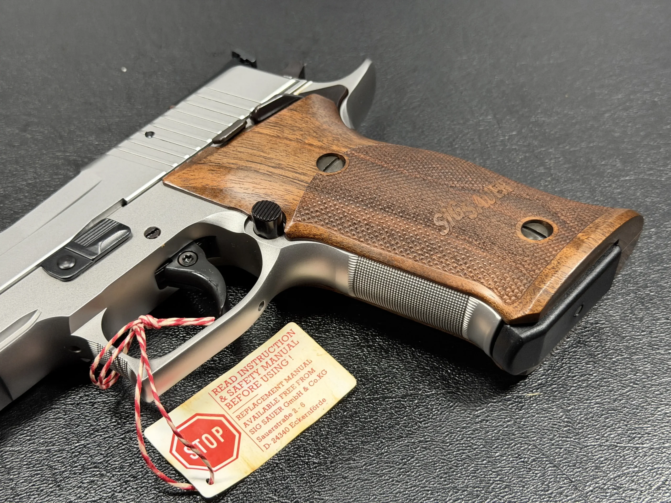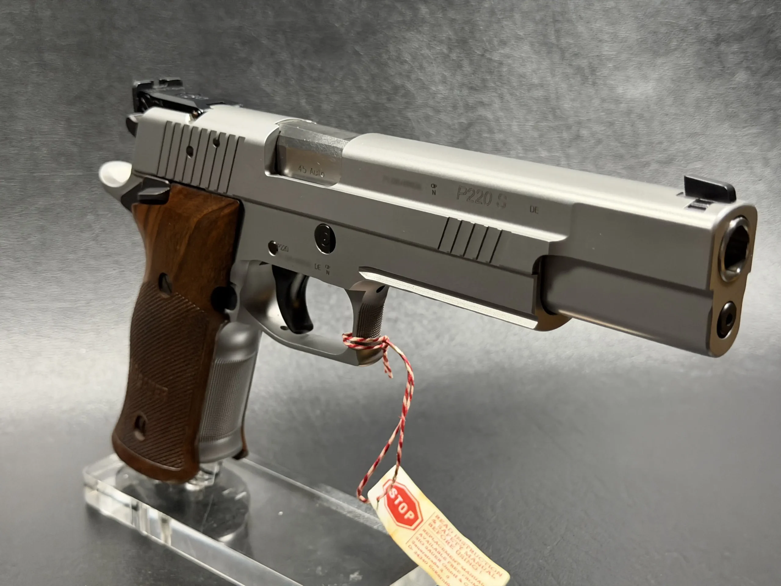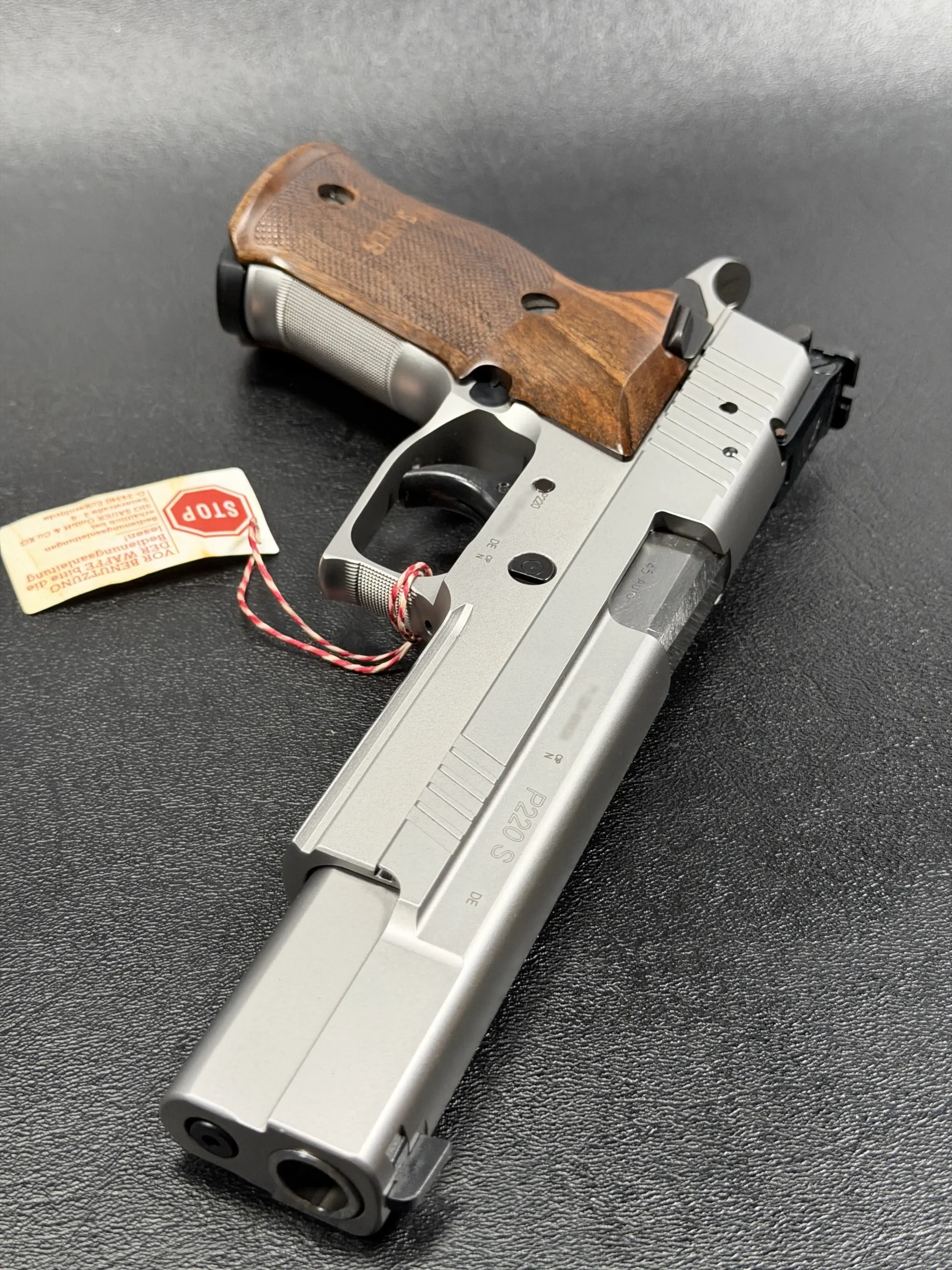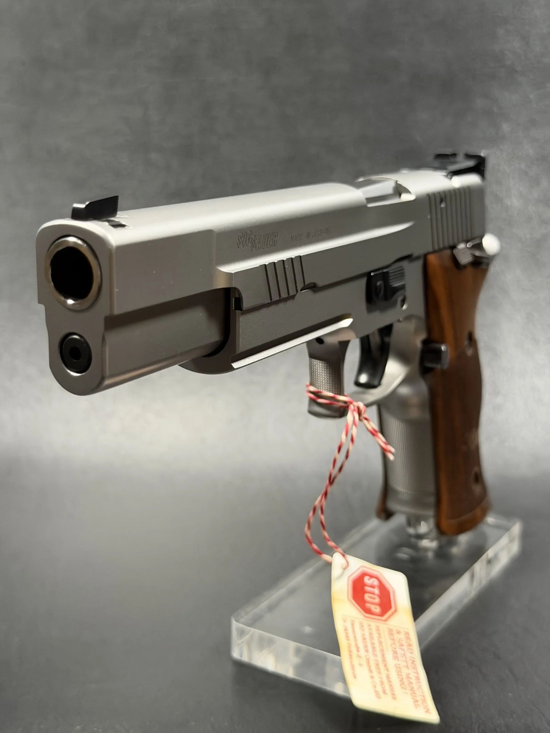 German-made SIG Sauer P220 X-Six Silver with a matte silver finish, long slide and barrel, and classic wooden grip panels. A refined X-Series pistol with competition-inspired styling and a crisp trigger.