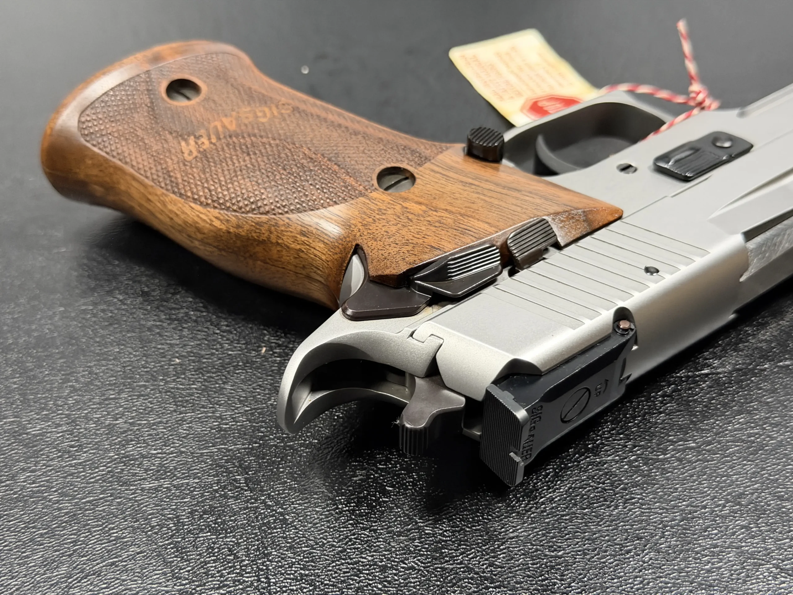 Warm wooden grip panels provide visual contrast against the silver-toned finish while offering a comfortable hold. Carefully machined controls and a crisp trigger reflect the model’s competition-inspired design, with close attention paid to fit, finish, and overall refinement.