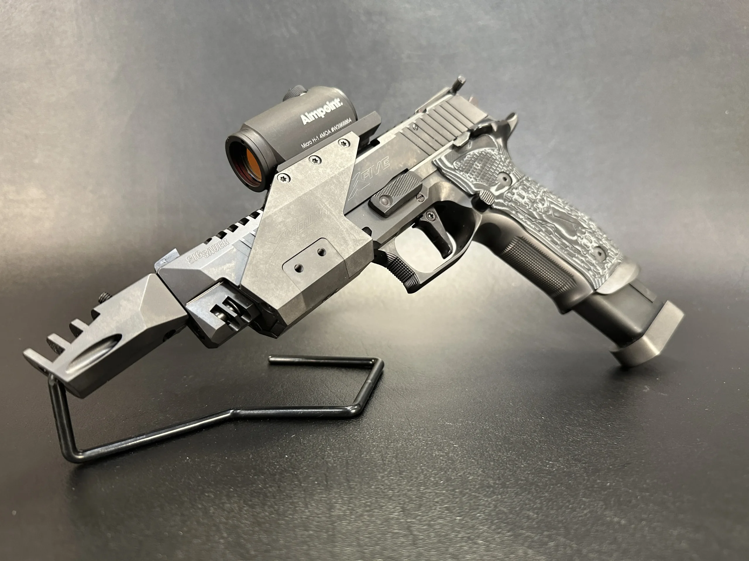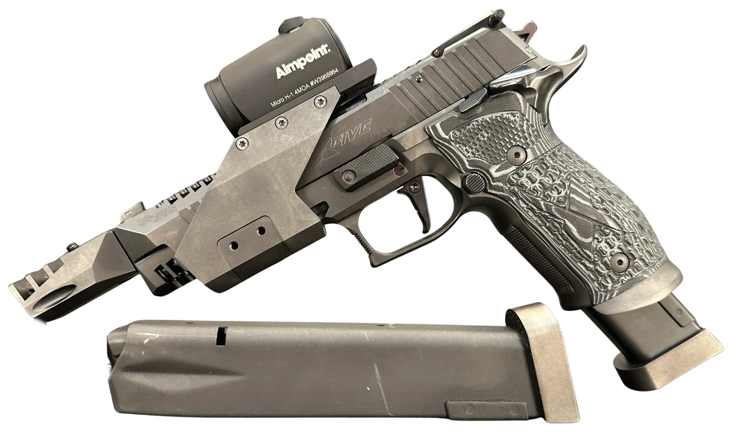 The SIG Sauer P226 X-5 Open Skeleton Black combines distinctive styling with a feature-rich competition-oriented configuration. This P226 X-5 variant includes a compensator, an adjustable SAO (Single Action Only) trigger, an X-Mount mounting bridge, an Aimpoint red dot sight, and a 25-round magazine.
