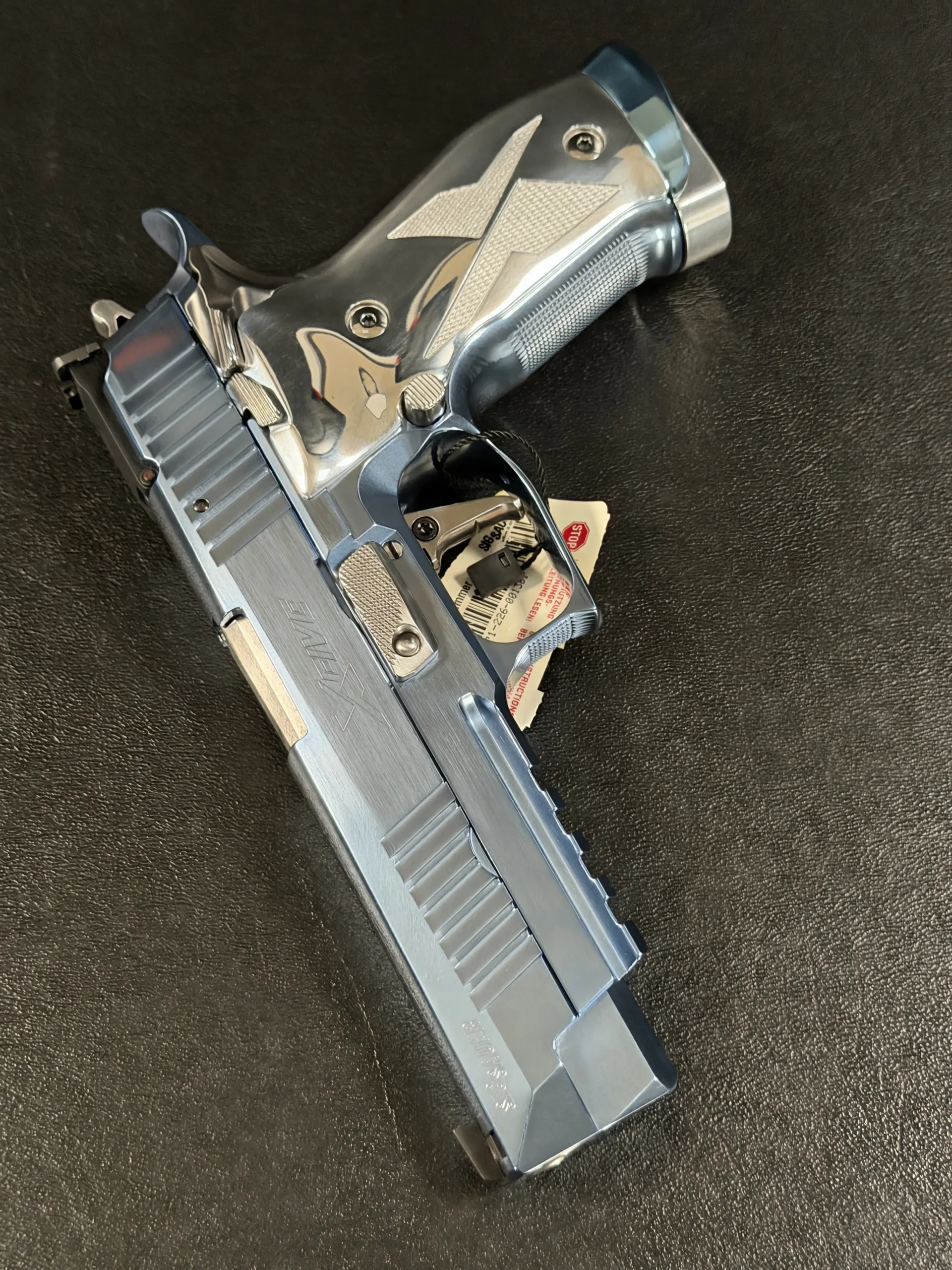 The SIG Sauer P226 X-Five Supermatch “Blue Ice” is a Mastershop-built 9mm with a distinctive blue-and-polished-metal finish. Based on the X-Five Supermatch platform, it brings together target-focused design, hand-tuned details, and a standout presentation.