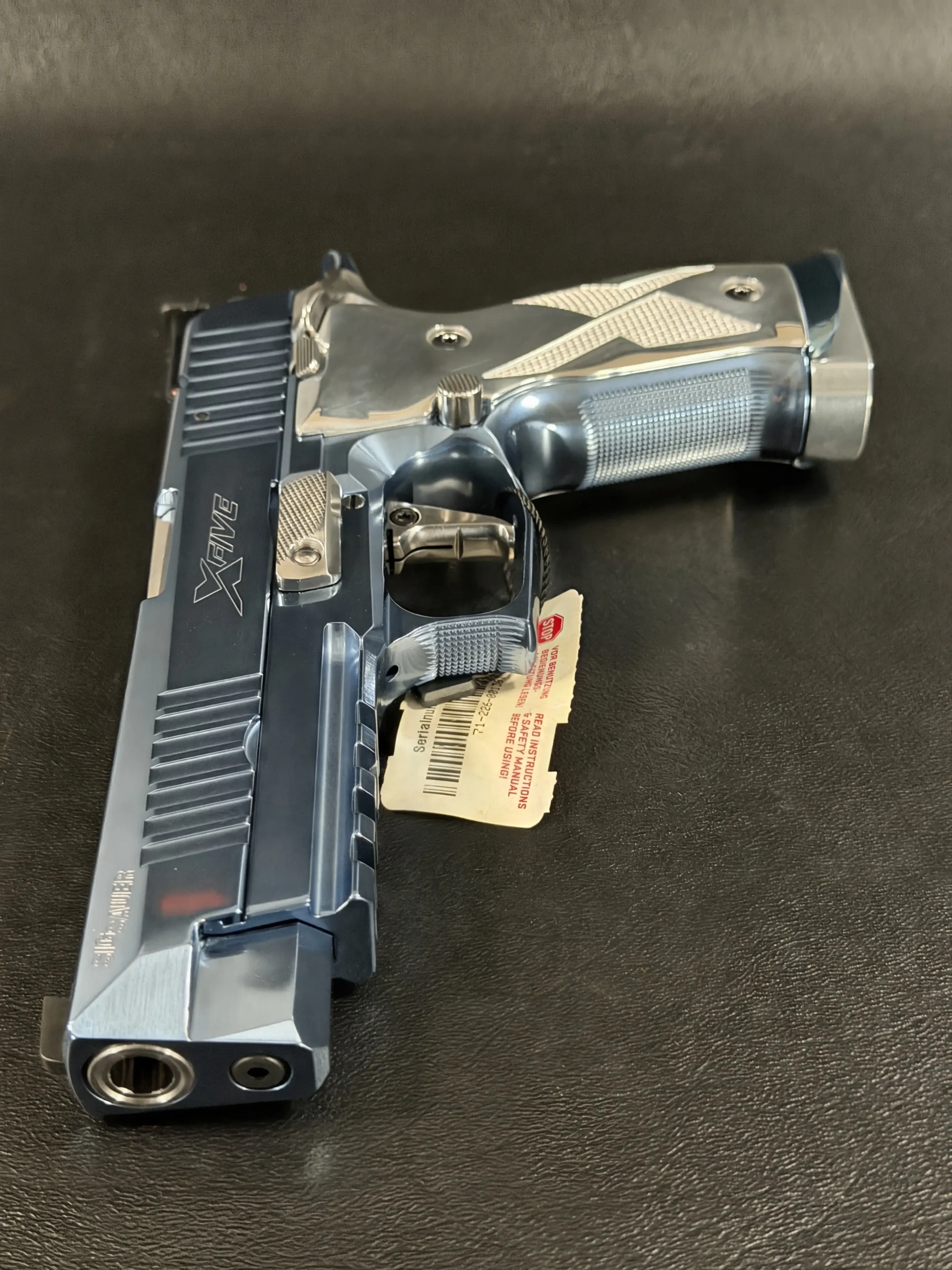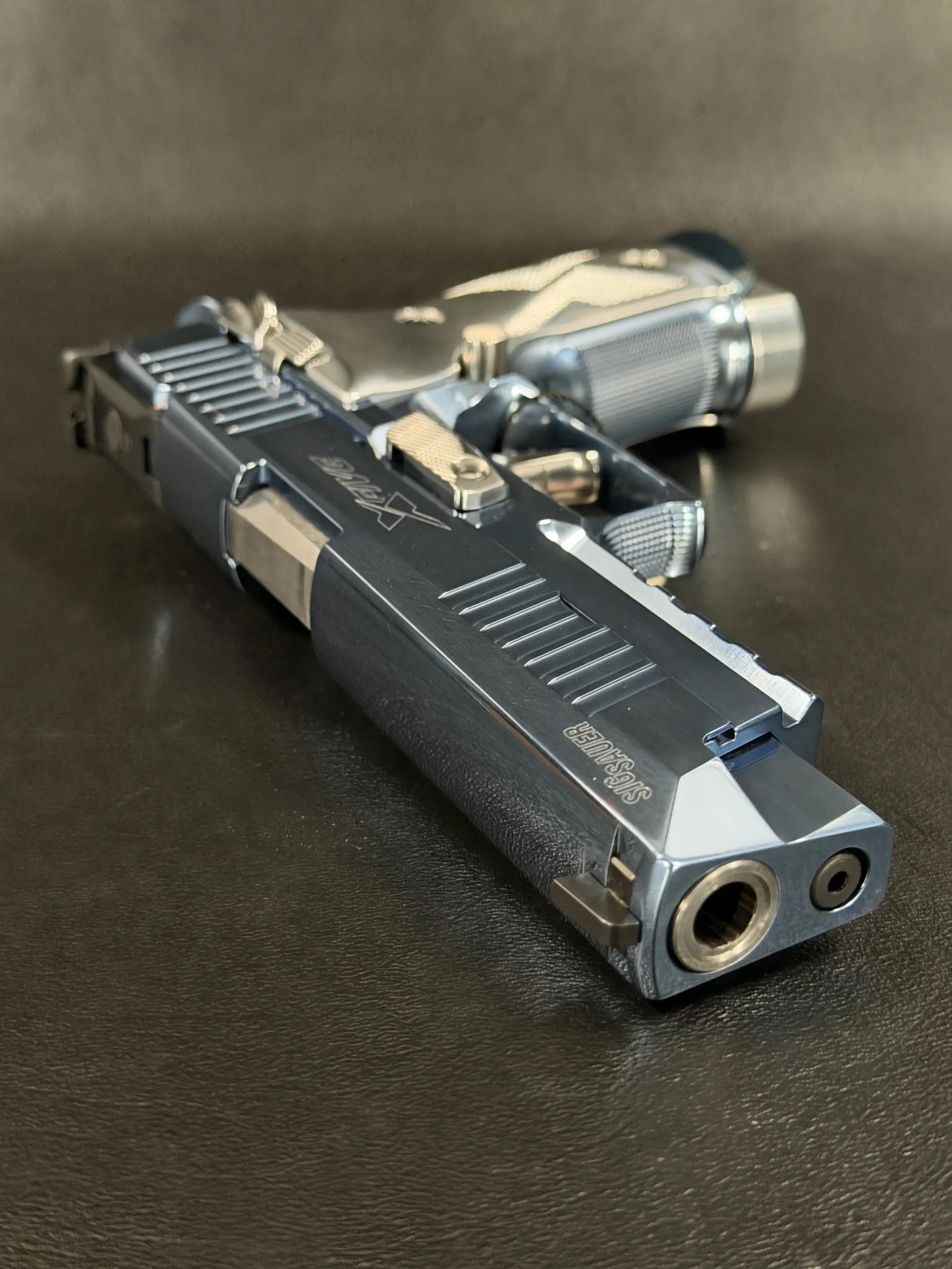 With its unified finish treatment and matching overall presentation, this “Blue Ice” configuration stands apart within the X-Five line. It is a striking interpretation of the P226 X-Five Supermatch, pairing competition styling and Mastershop craftsmanship in a highly distinctive package.