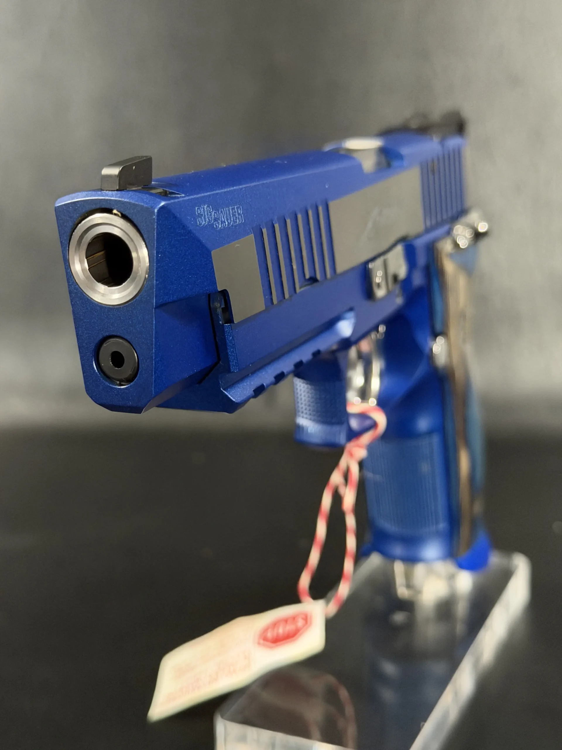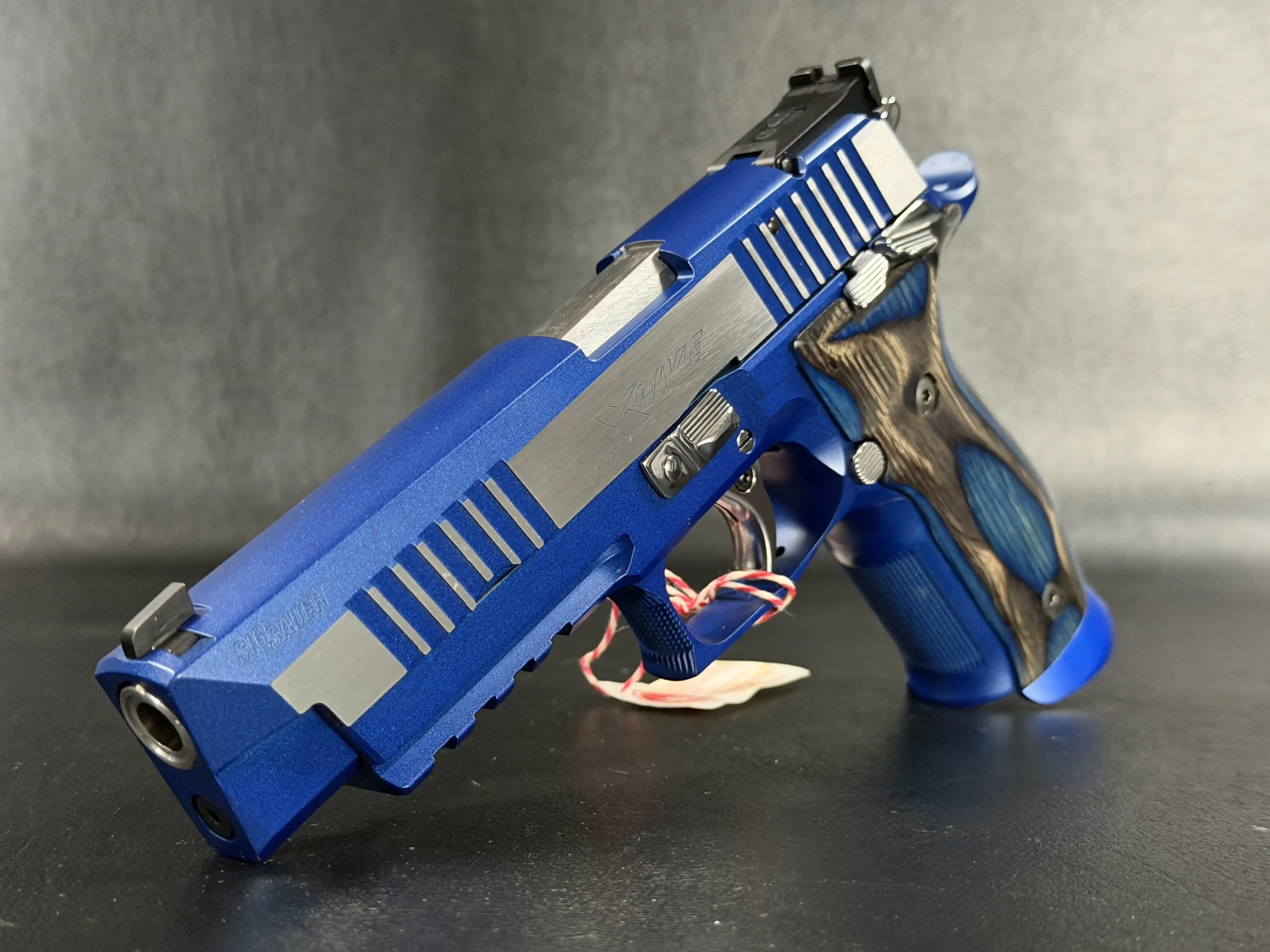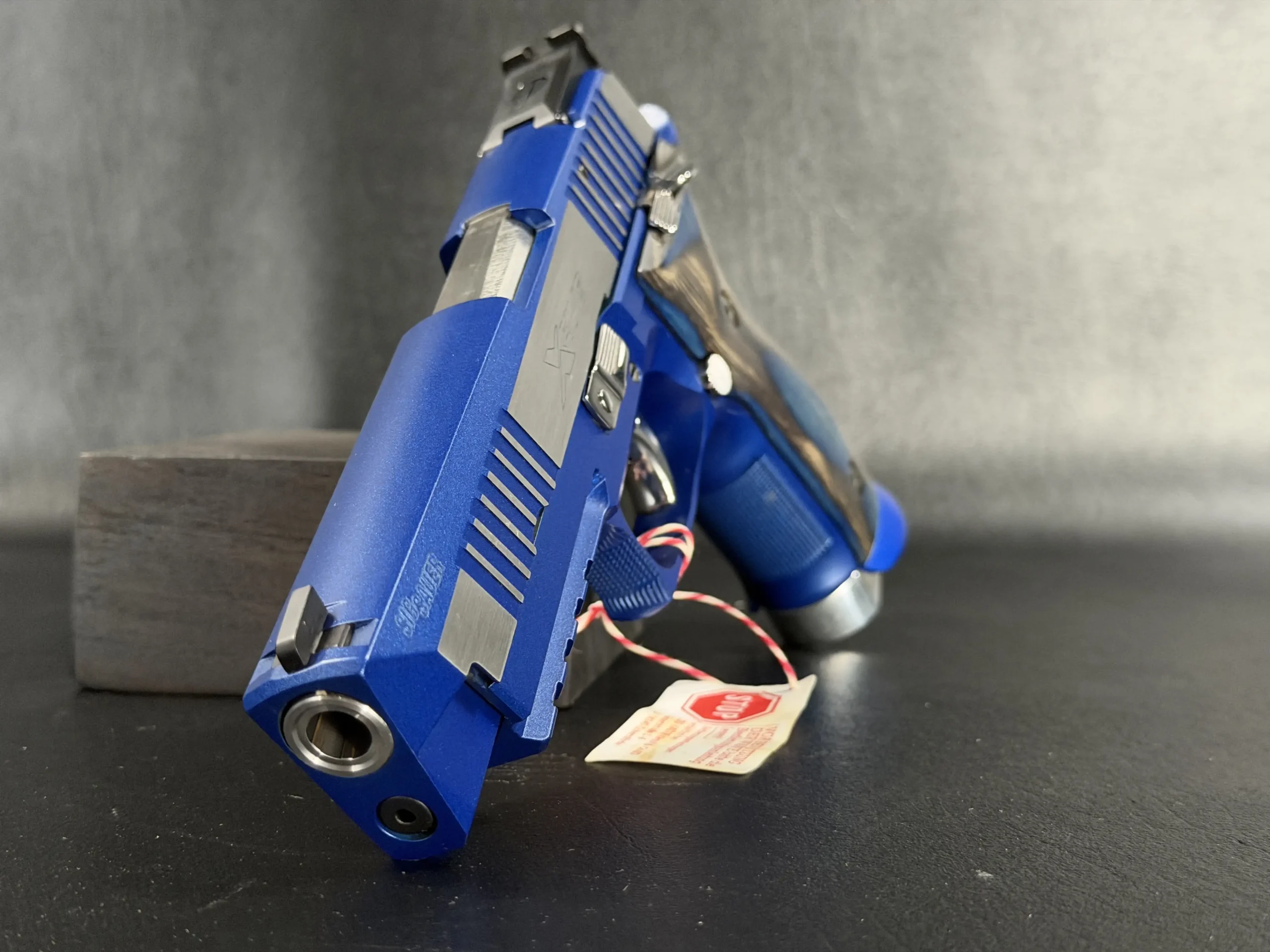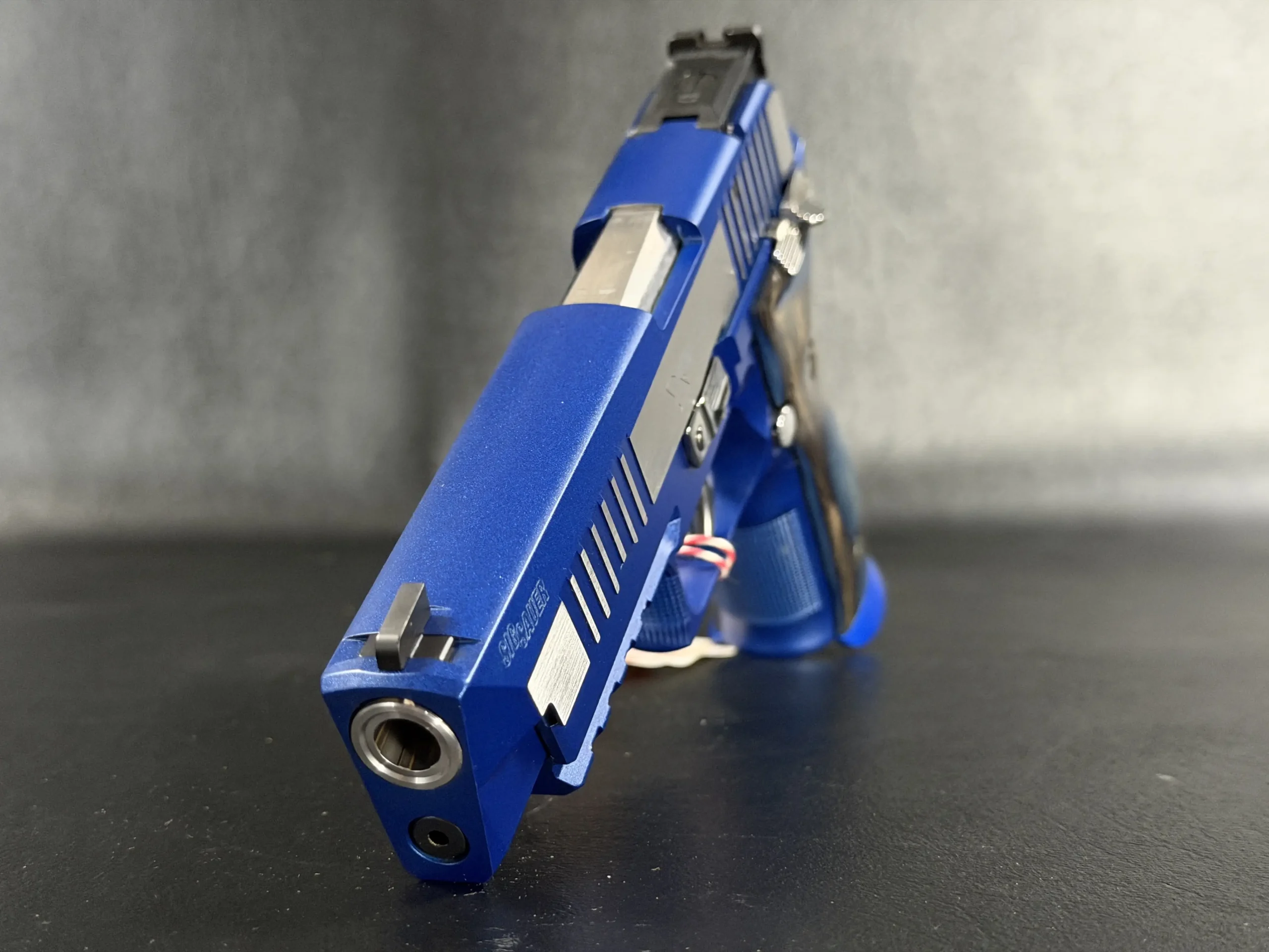 Finished in SIG Sauer’s Blue Moon anodized coating, this pistol features a deep satin blue tone set against brushed stainless accents on the slide, controls, and barrel. The extended X-Five slide includes lightening cuts and refined serrations, giving the pistol a purposeful profile while highlighting the model’s specialized design.
