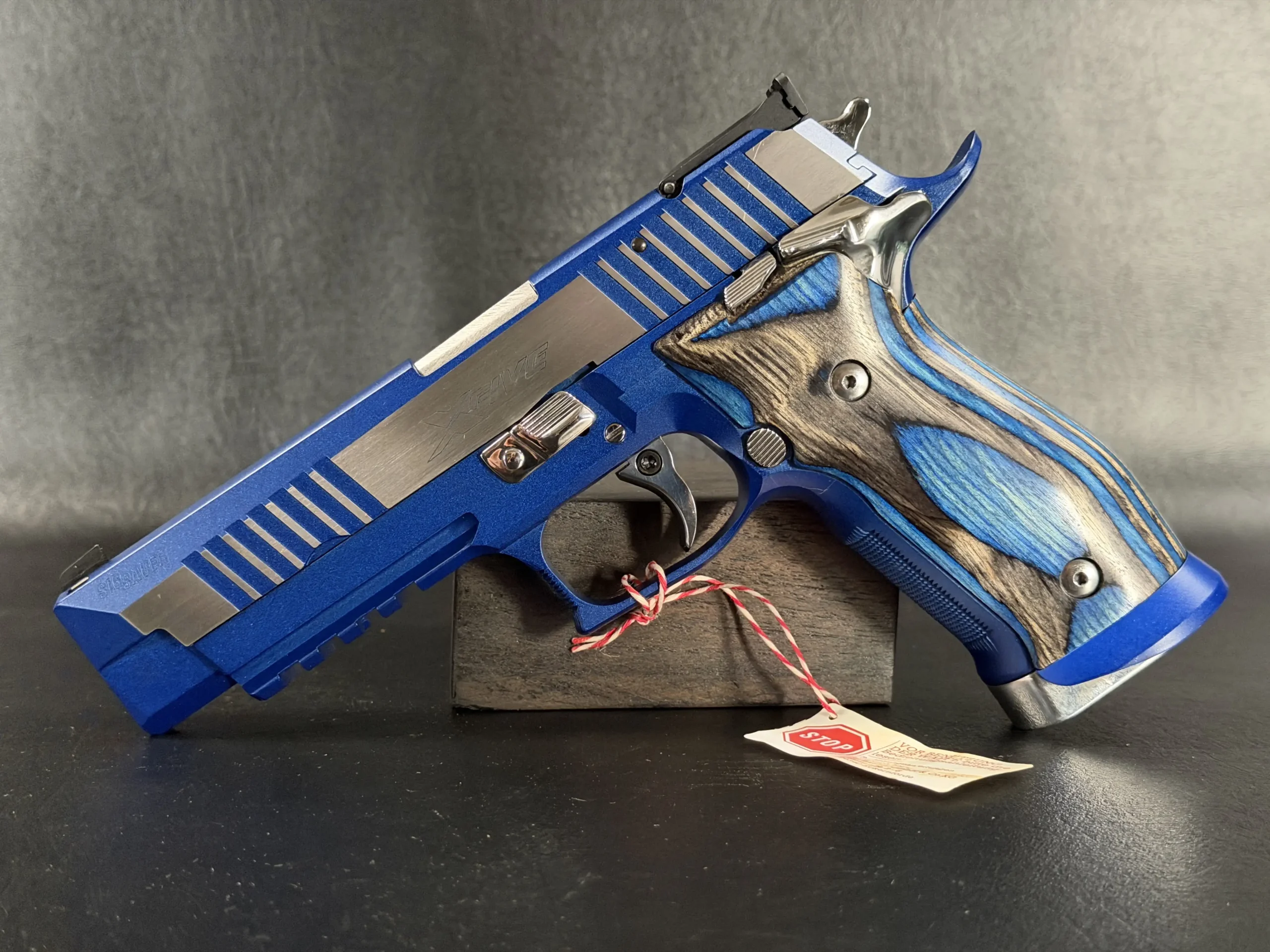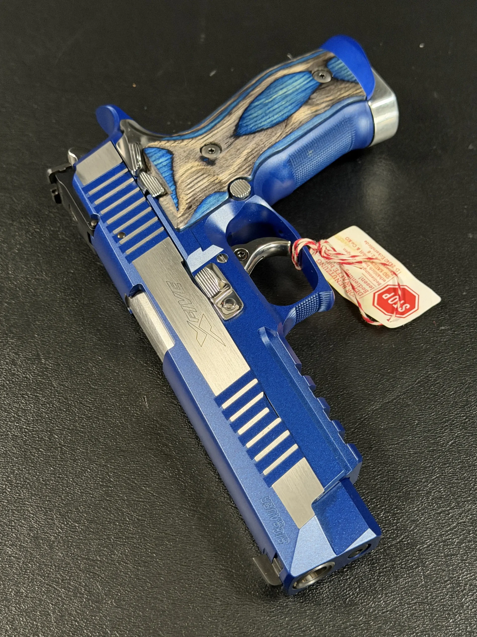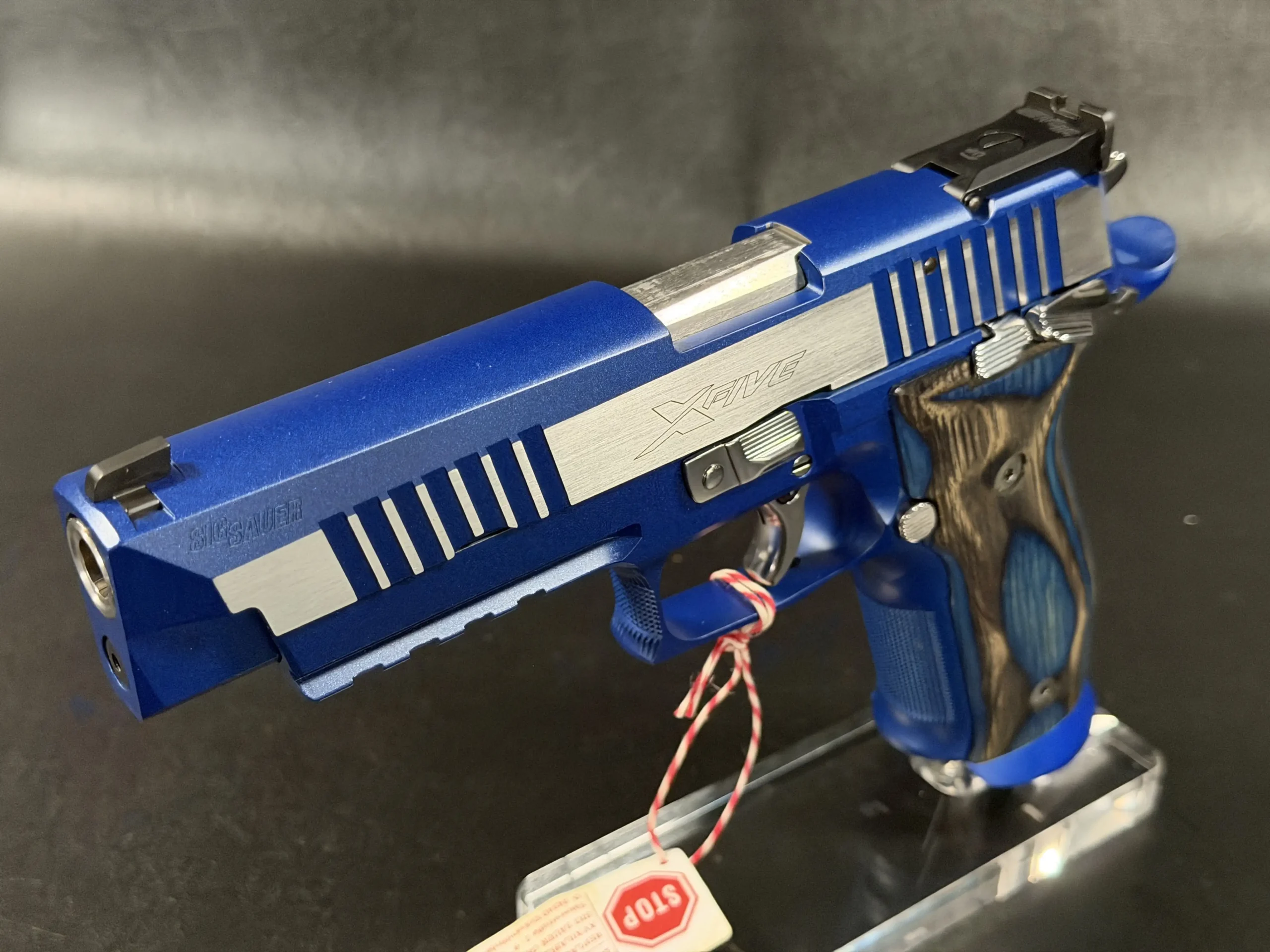 Finished in SIG Sauer’s Blue Moon anodized coating, this pistol features a deep satin blue tone set against brushed stainless accents on the slide, controls, and barrel. The extended X-Five slide includes lightening cuts and refined serrations, giving the pistol a purposeful profile while highlighting the model’s specialized design.