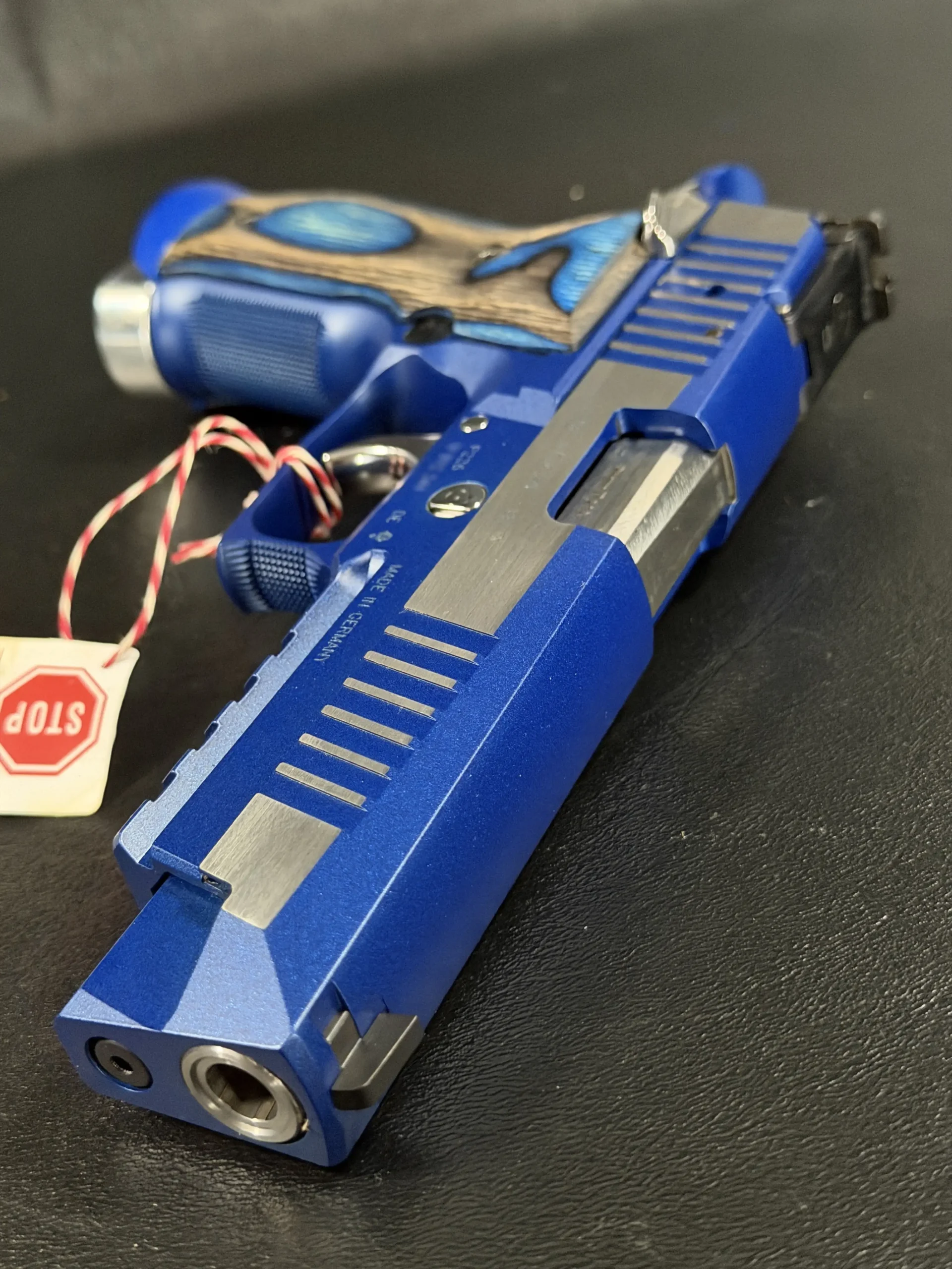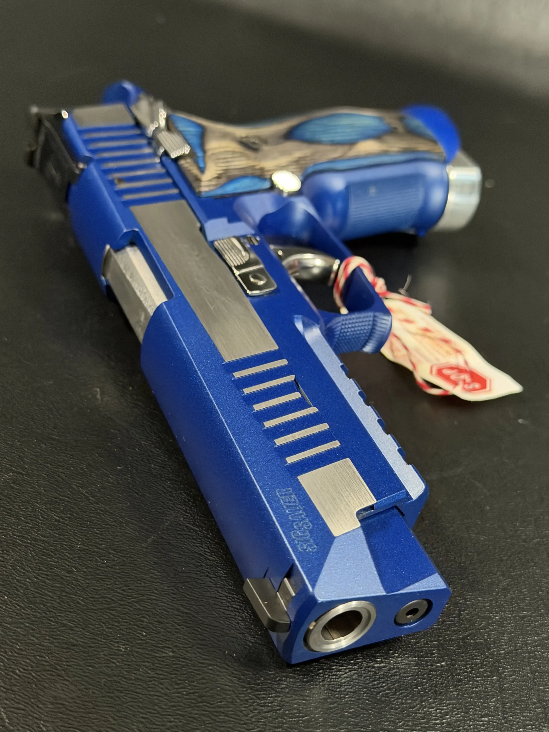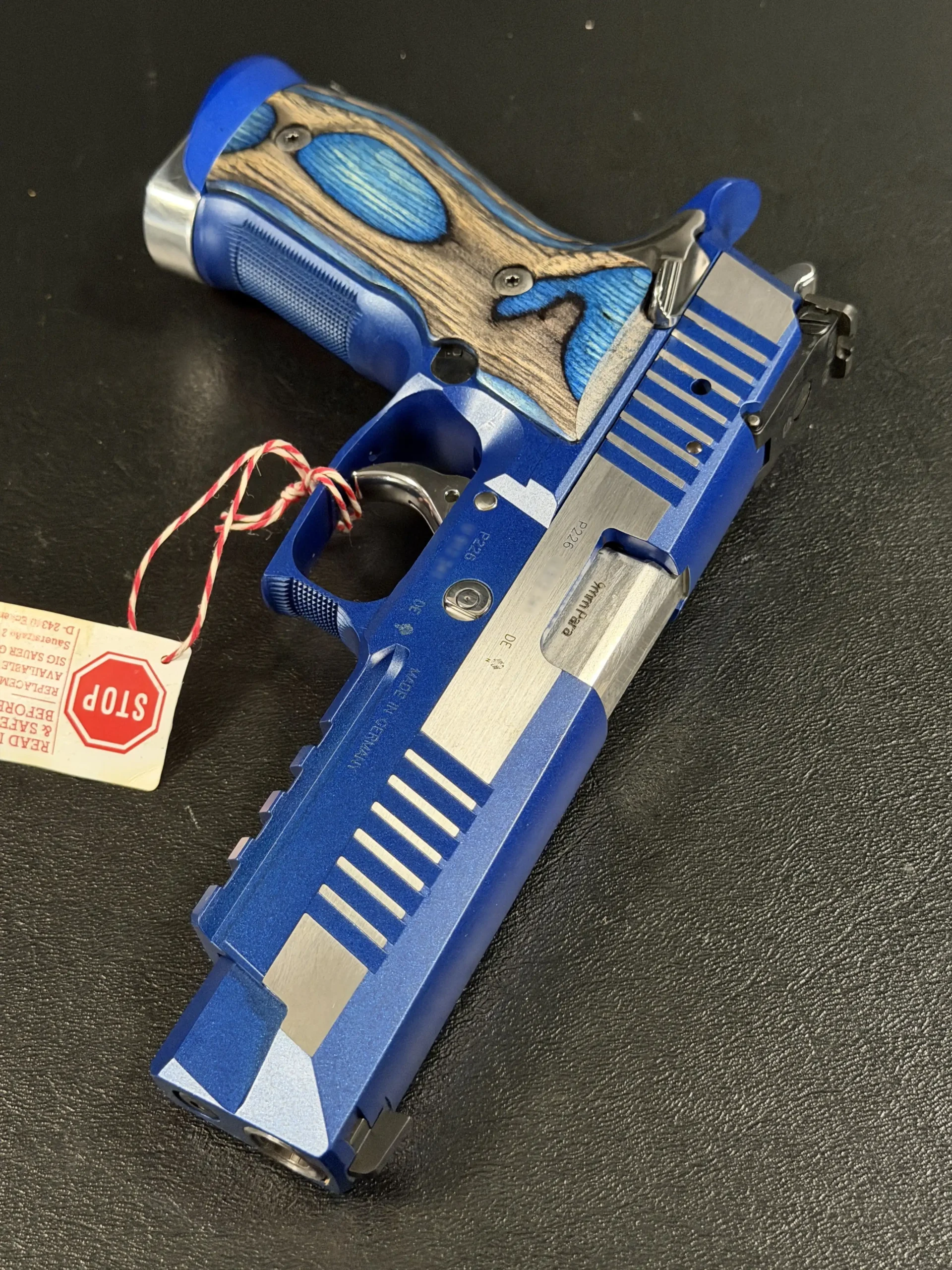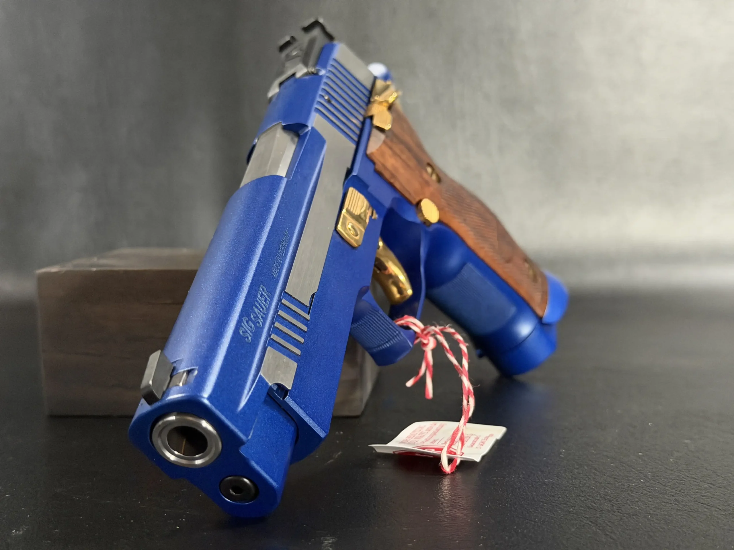 Finished in SIG Sauer’s Blue Moon anodized coating, this pistol features a deep satin blue tone set against brushed stainless accents on the slide, controls, and barrel. The extended X-Five slide includes lightening cuts and refined serrations, giving the pistol a purposeful profile while highlighting the model’s specialized design.