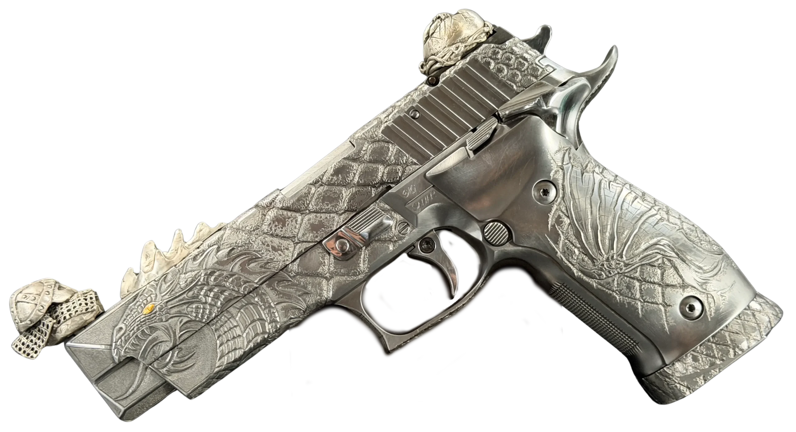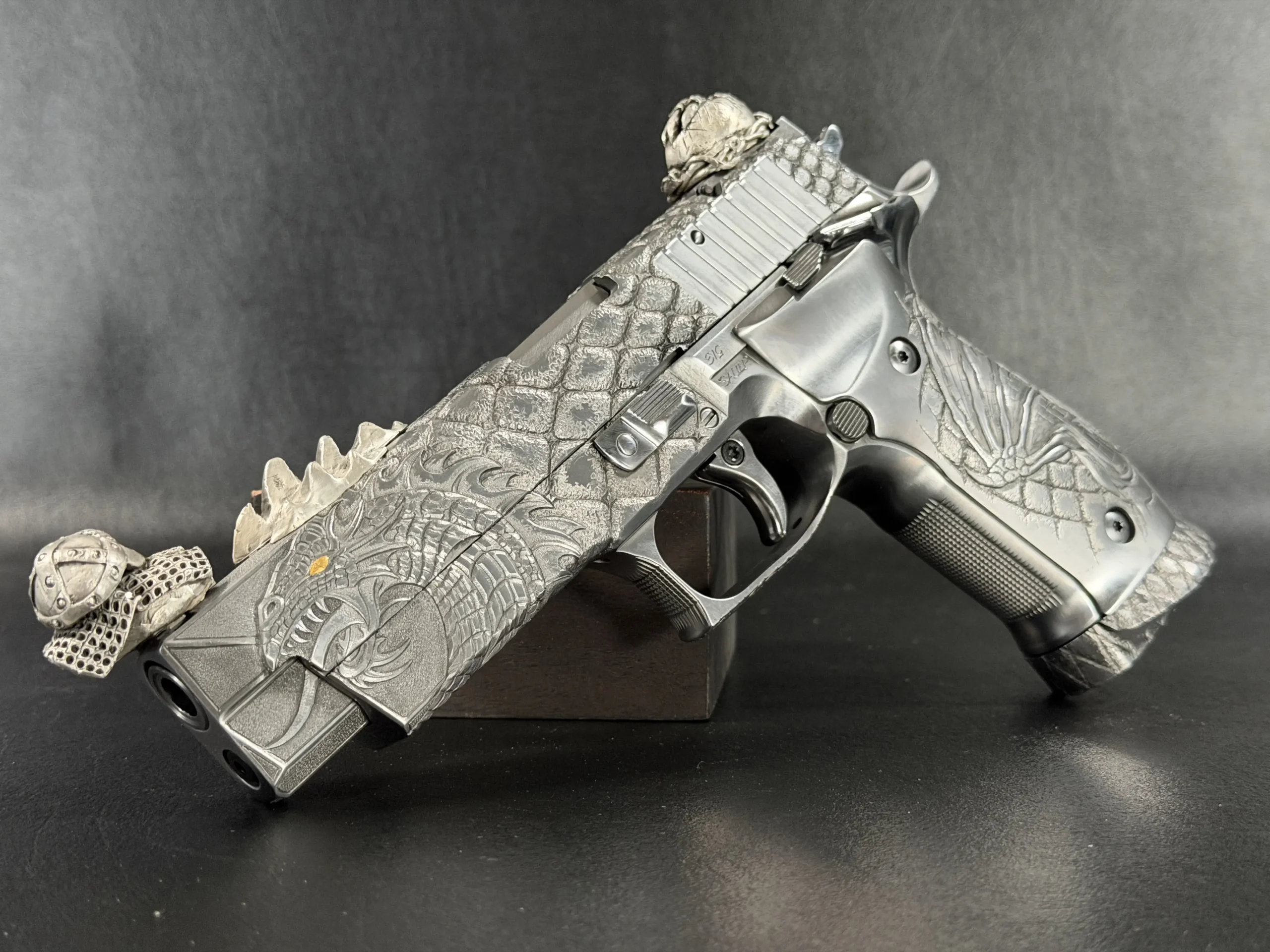 Built on the X-Five platform, it retains the profile and character associated with SIG Sauer’s competition-inspired P226 variant, while the presentation emphasizes decorative metalwork and finishing. This is a distinctive Mastershop Prestige Series example with an especially elaborate Dragon treatment.