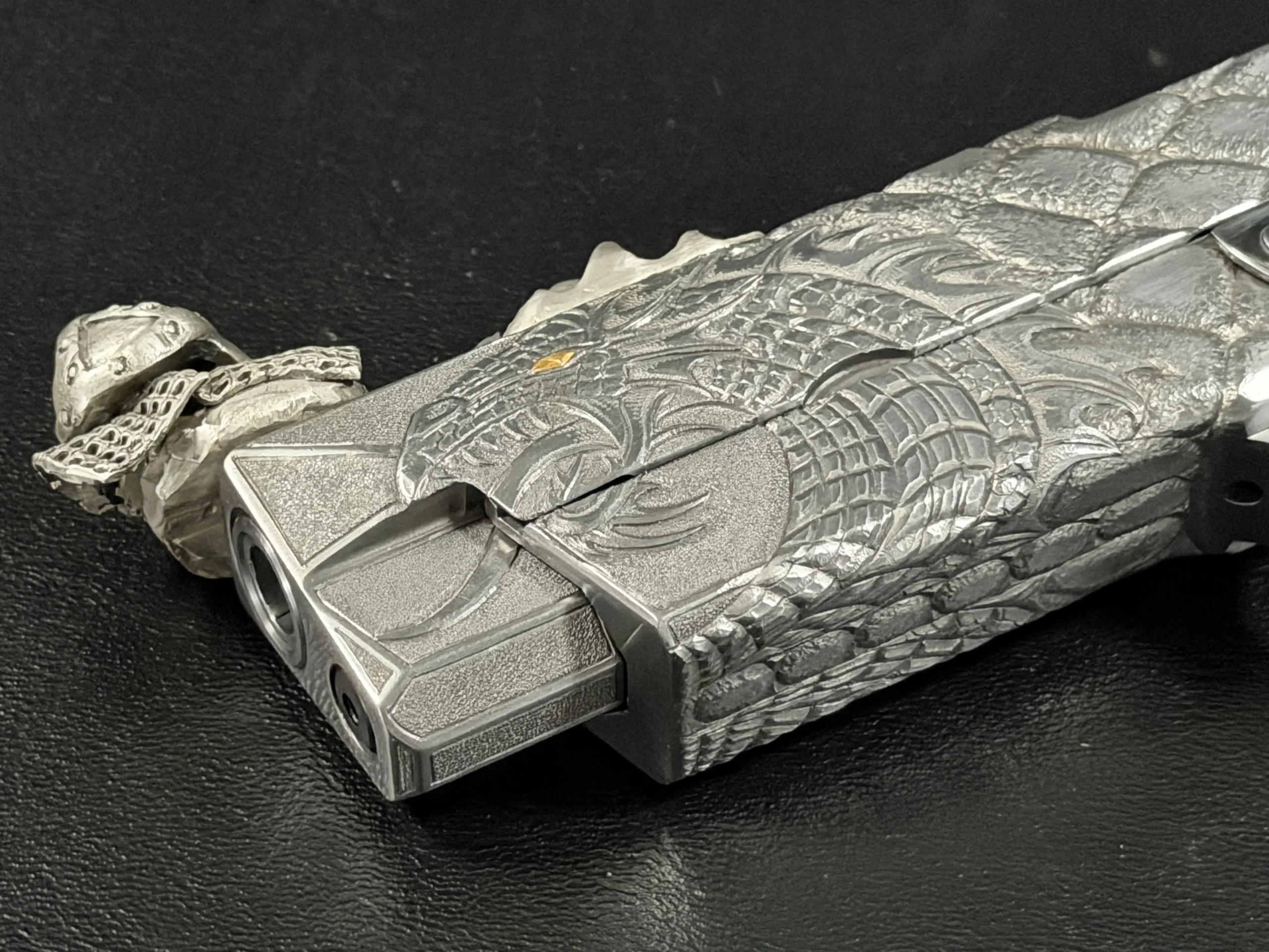 Three-dimensional dragon accents and finely detailed grip panels continue the theme, giving the pistol a cohesive, fully integrated appearance. The overall effect is that of a unified design rather than a collection of separately embellished parts.