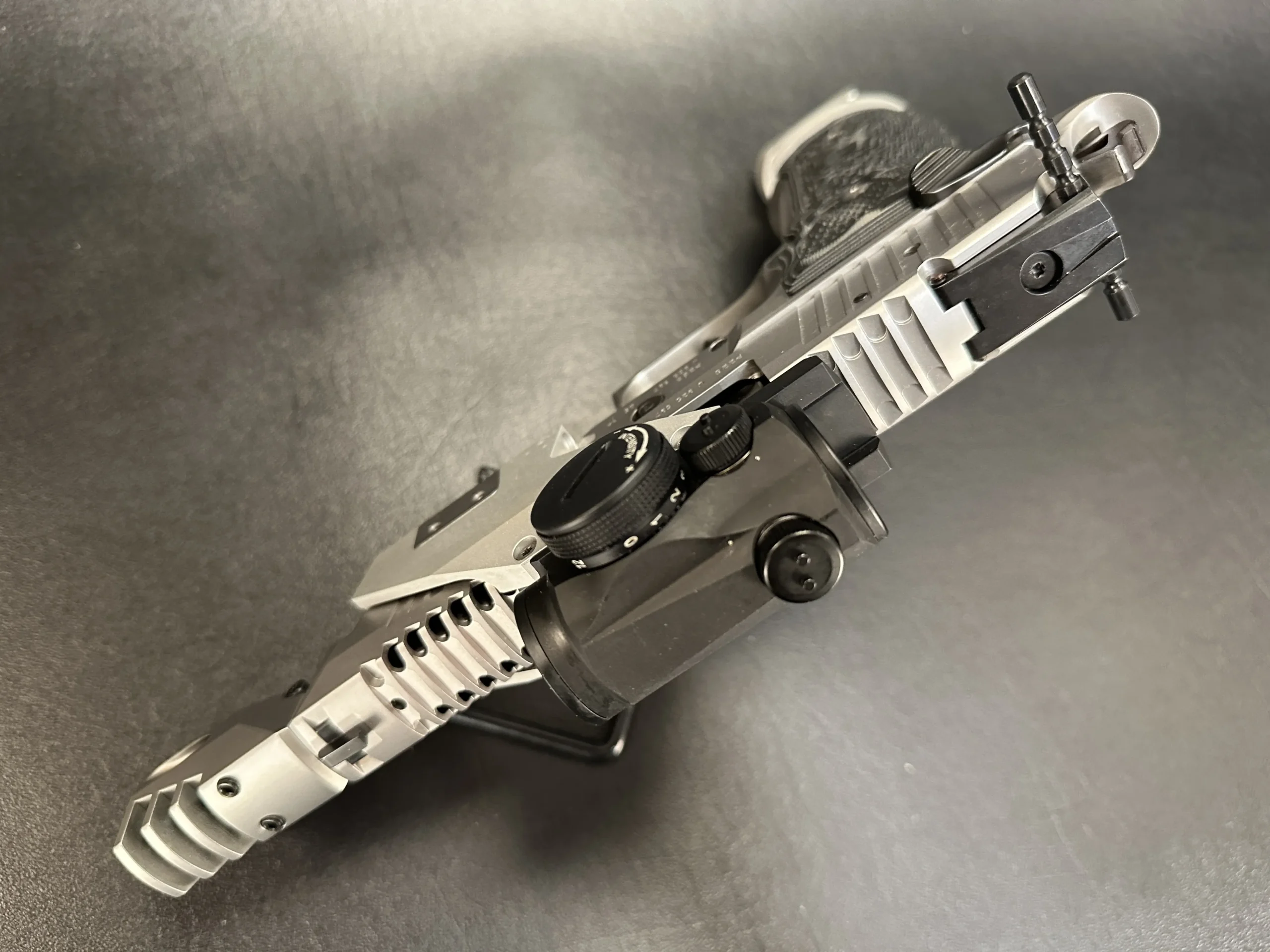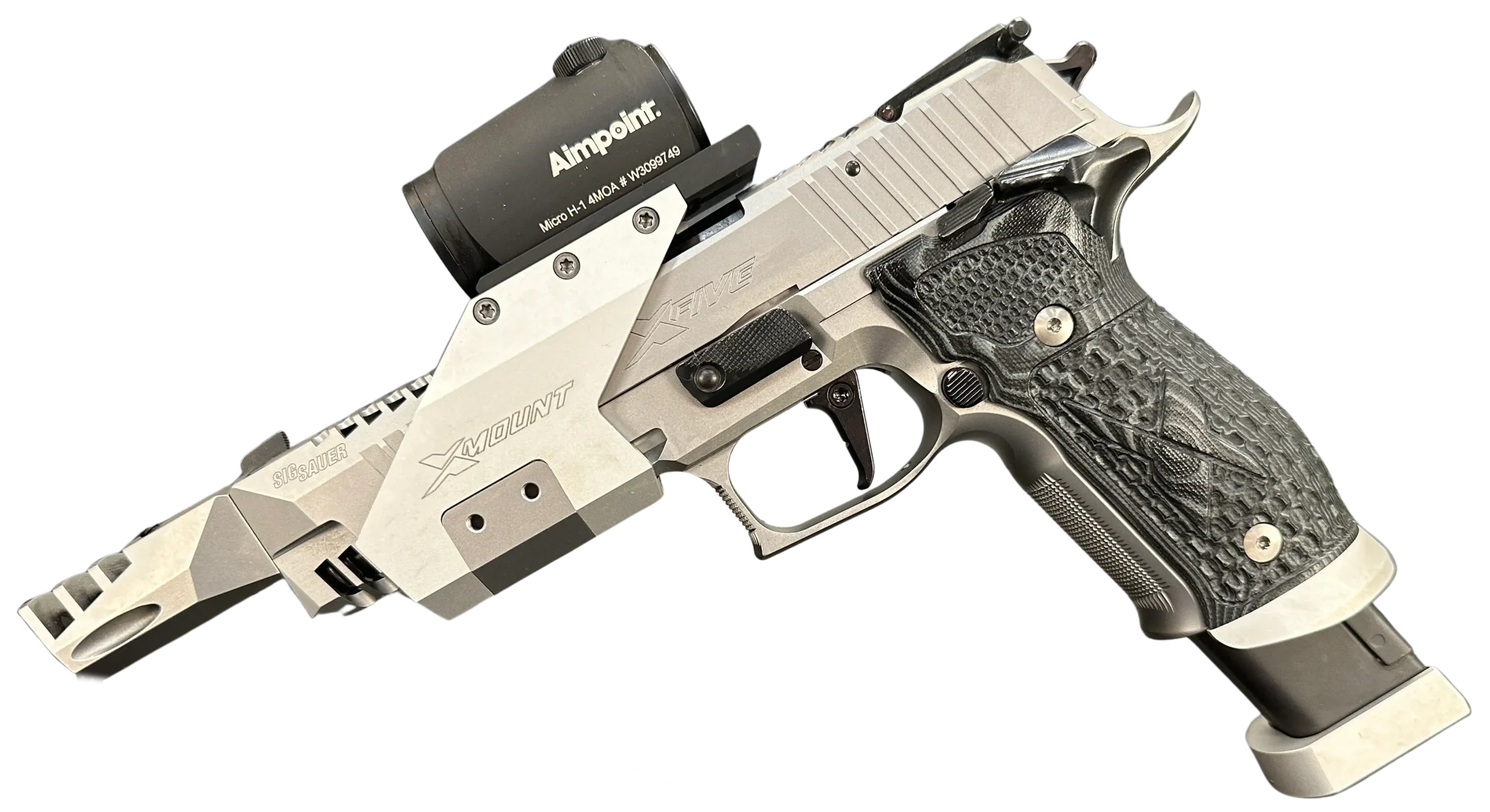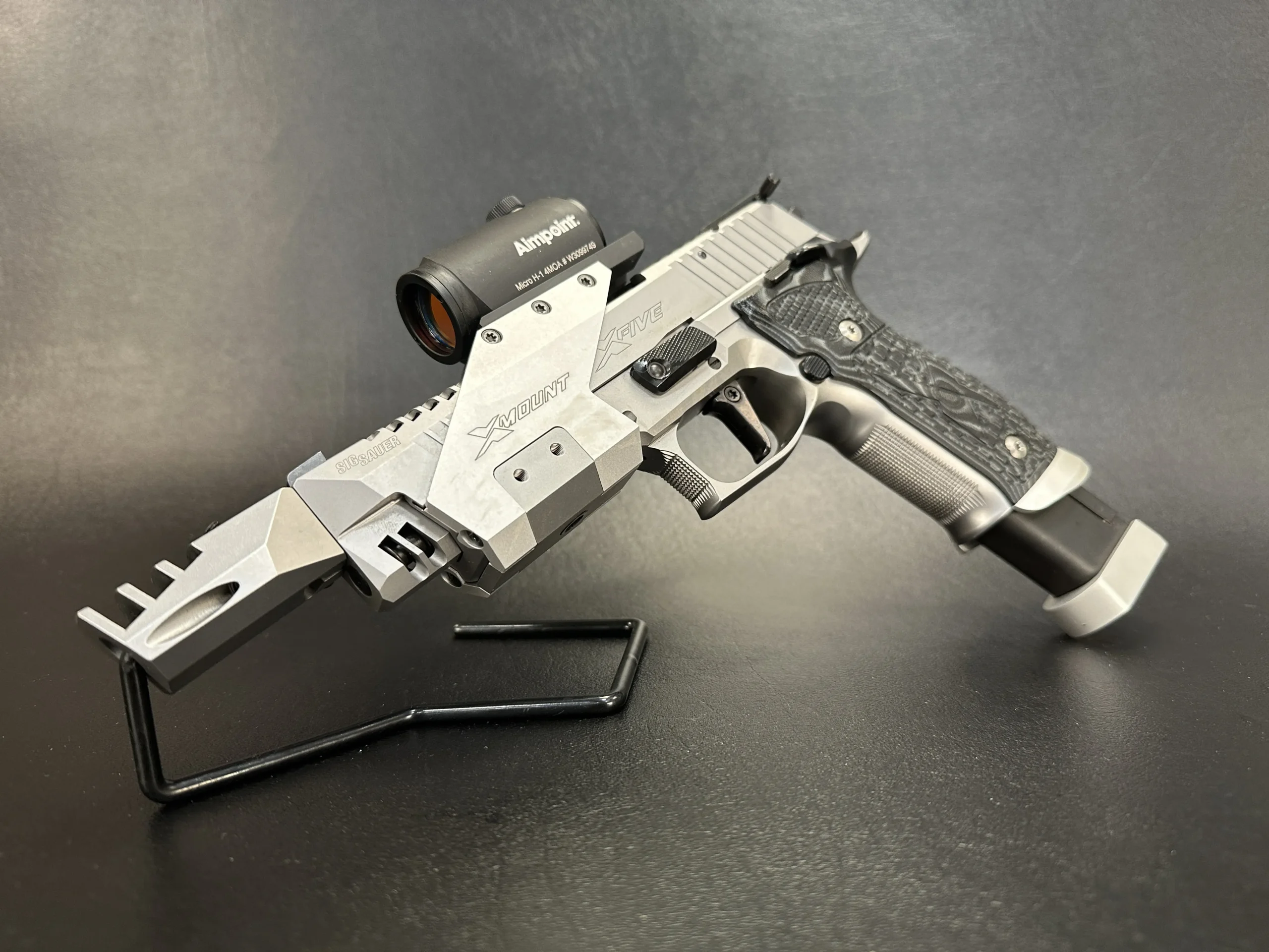 This example features an adjustable SAO trigger and an integrated compensator. It also includes the factory X-Mount mounting bridge and is outfitted with an Aimpoint red dot sight for optic-ready use.