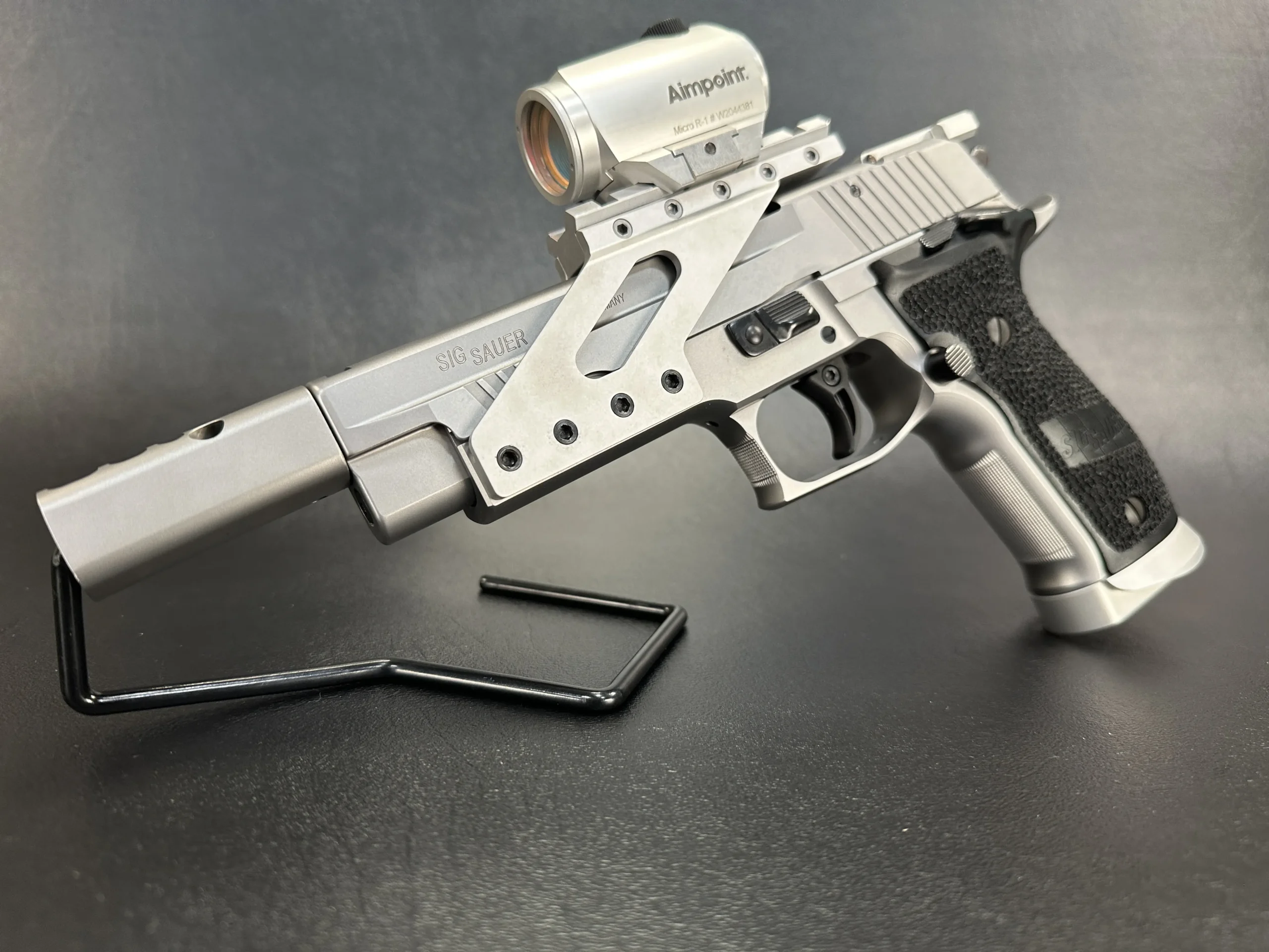 The Sig Sauer P226 X-Five PPC Open is a Mastershop competition pistol with stainless steel construction, a stainless steel scope mount, an Aimpoint red dot sight, and a charging handle. It also includes the original factory box, manual, and factory test target.