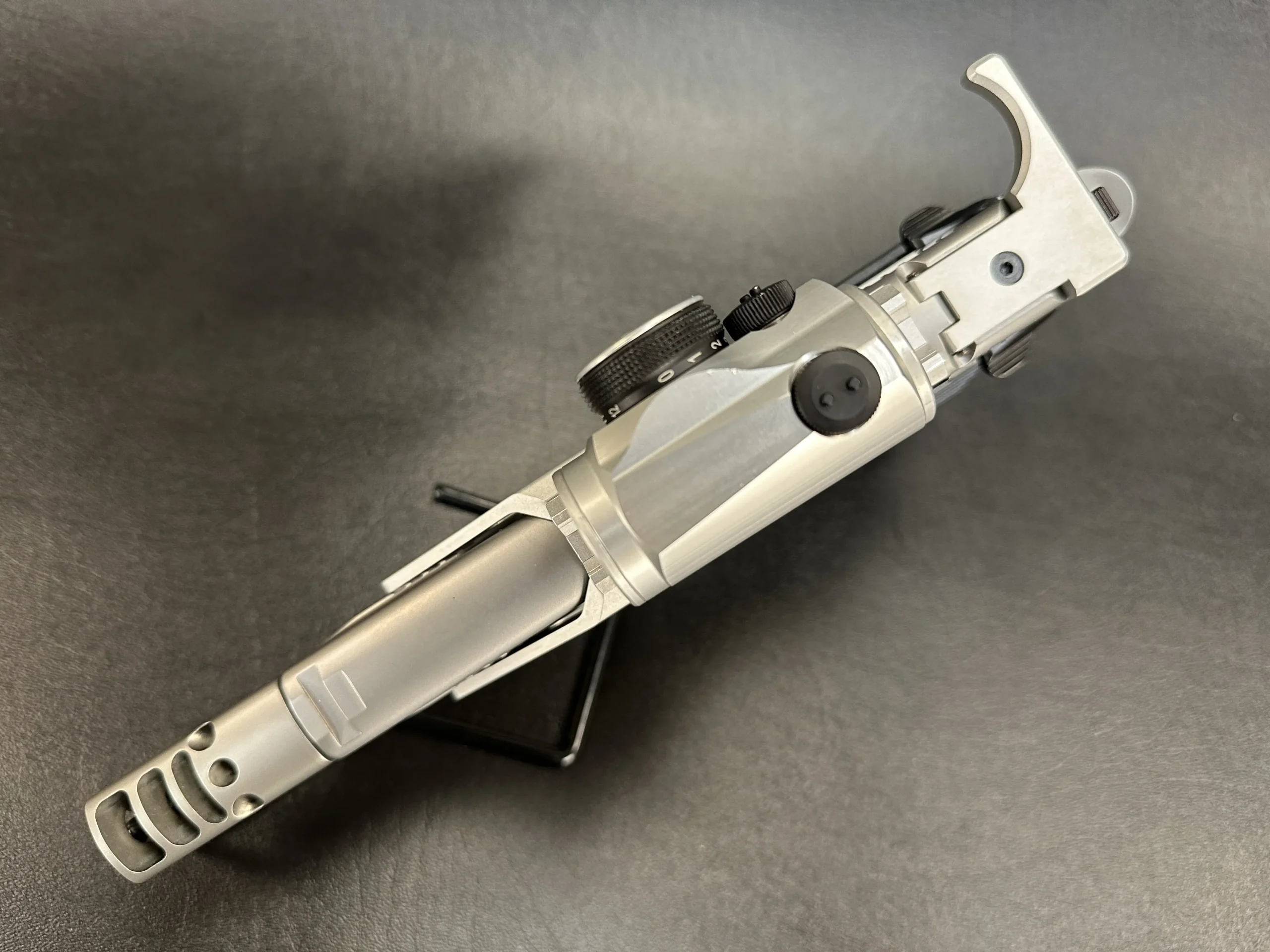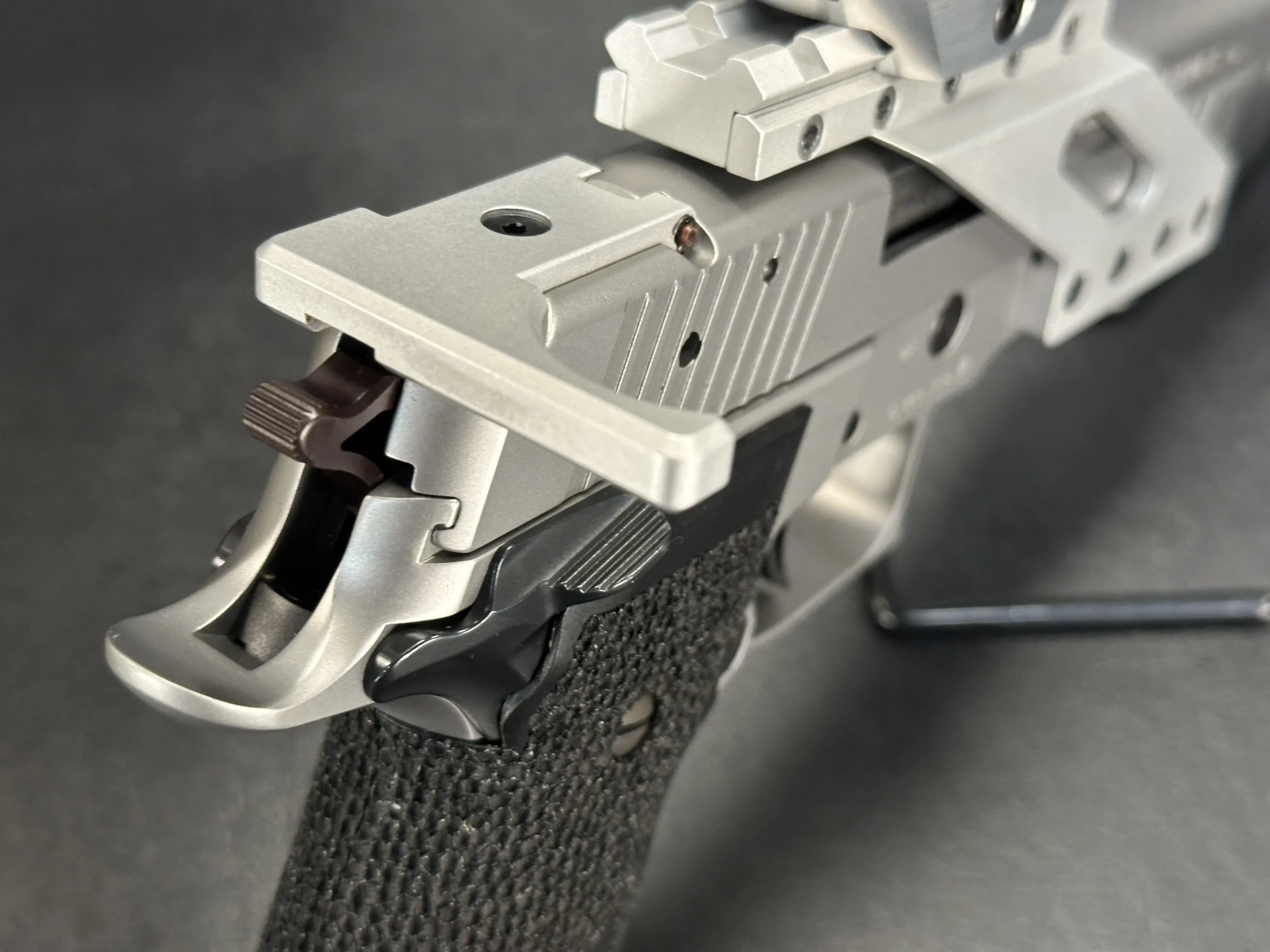 This example is equipped with a stainless steel scope mount paired with an Aimpoint red dot sight for a stable, competition-ready optic setup. A charging handle is also fitted, aiding slide manipulation and handling on the range.
