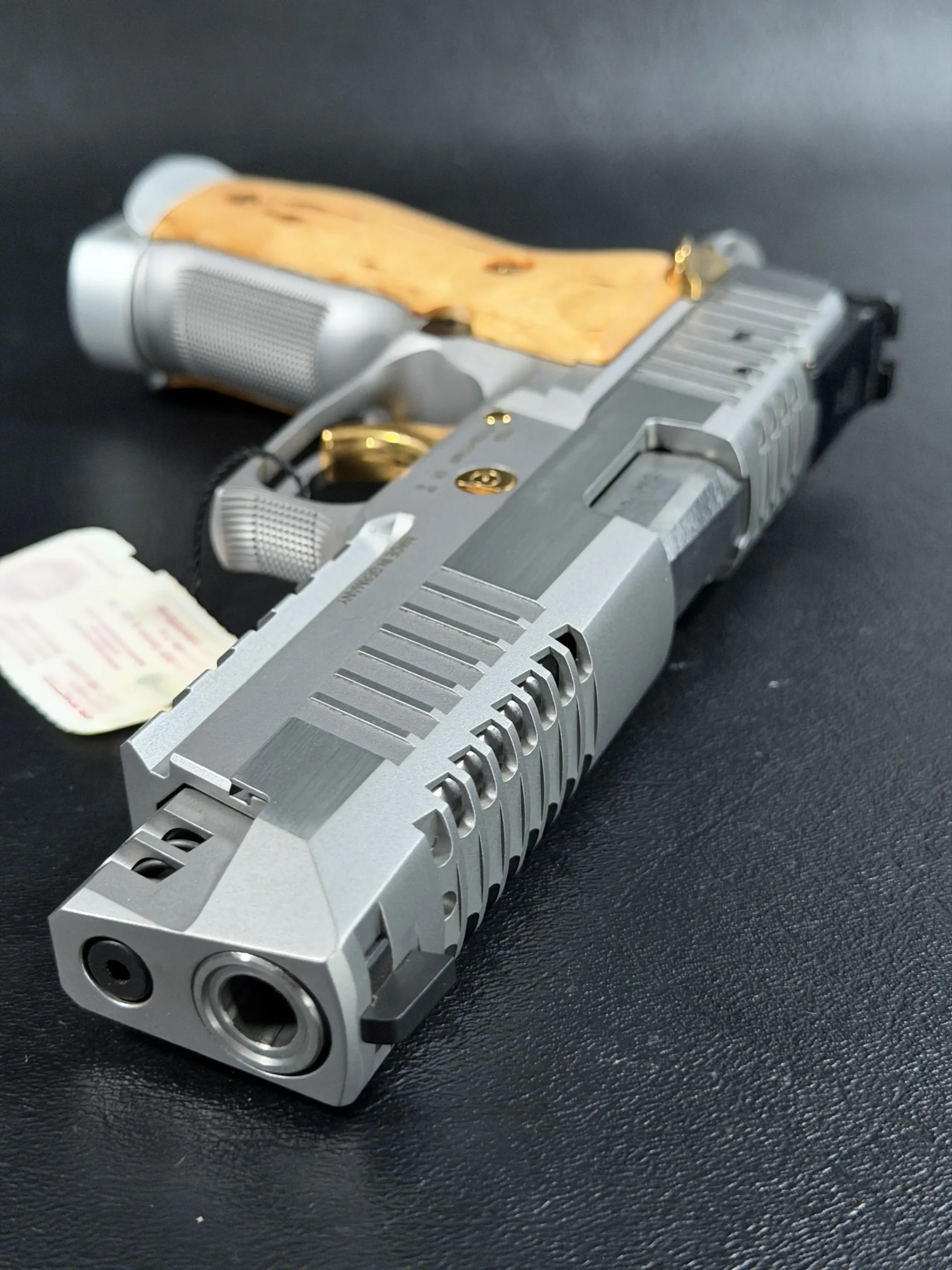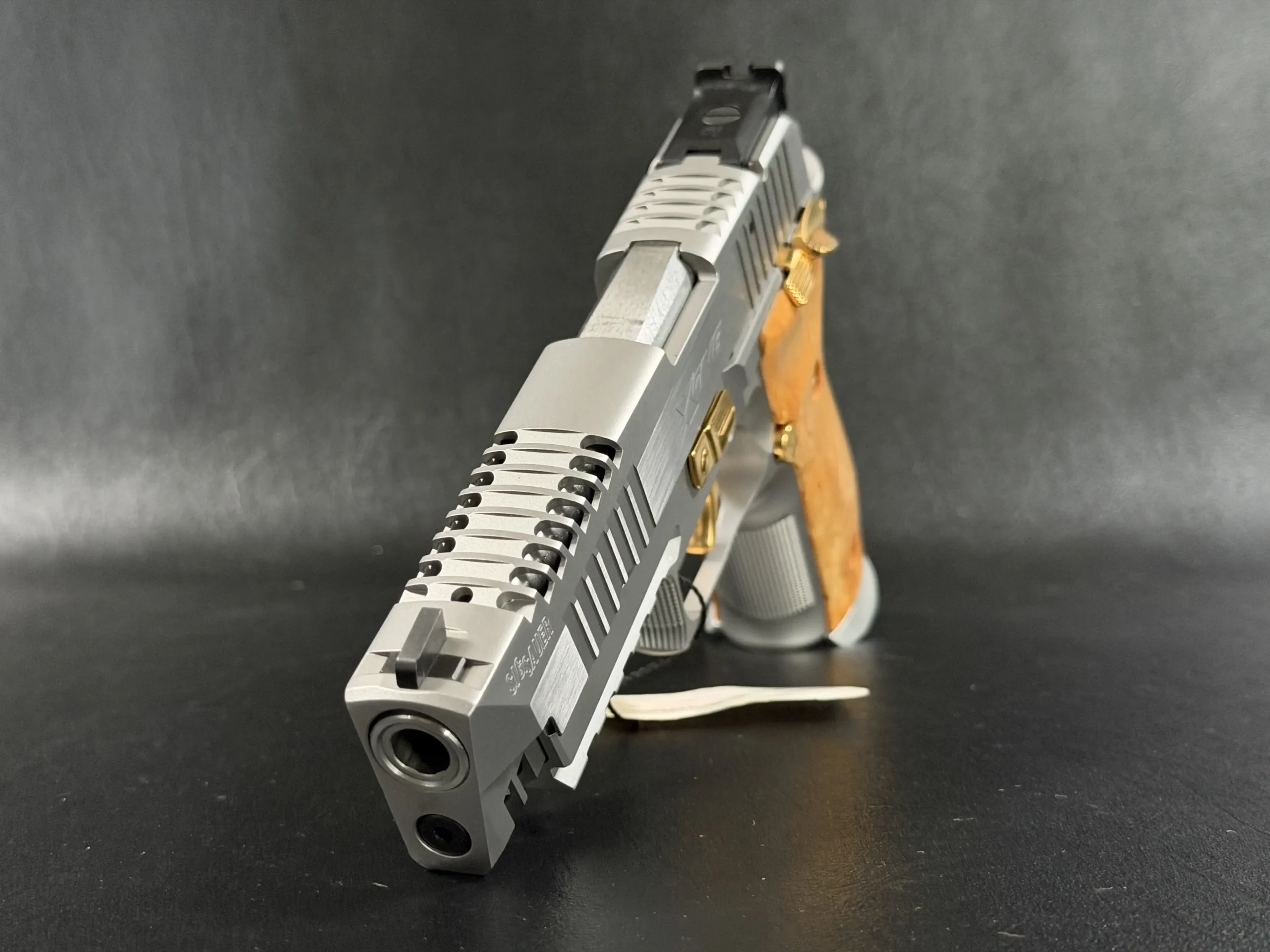 Gold-finished controls, including the trigger, safety, takedown lever, and hammer, create strong contrast against the matte stainless surfaces. The pistol is also fitted with figured wood grips, adding natural variation in grain and tone, along with an extended beavertail and flared magwell for a more complete ergonomic package.