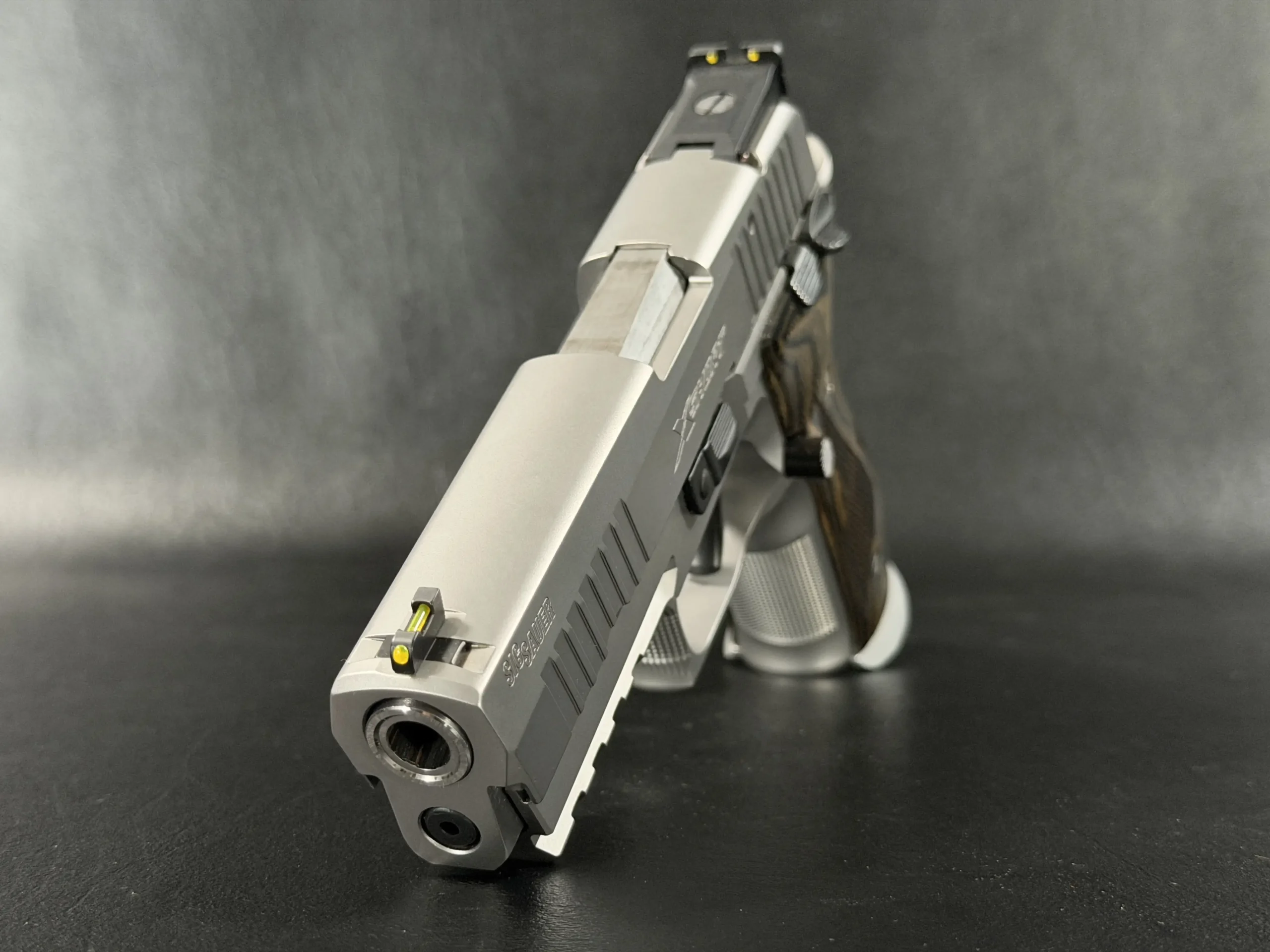 Its stainless steel slide and frame are finished in a matte satin treatment, giving the pistol a clean, understated look. The metalwork is complemented by contoured wood grips that add visual contrast and a traditional touch to the X-Short’s competition-influenced profile.