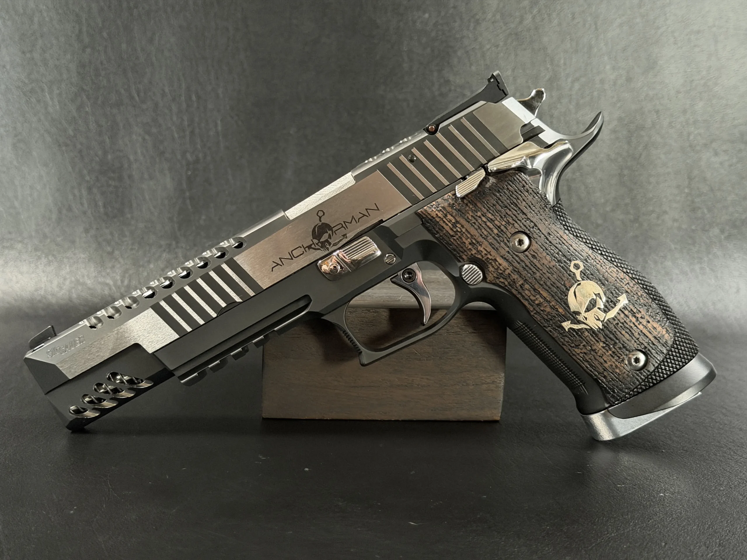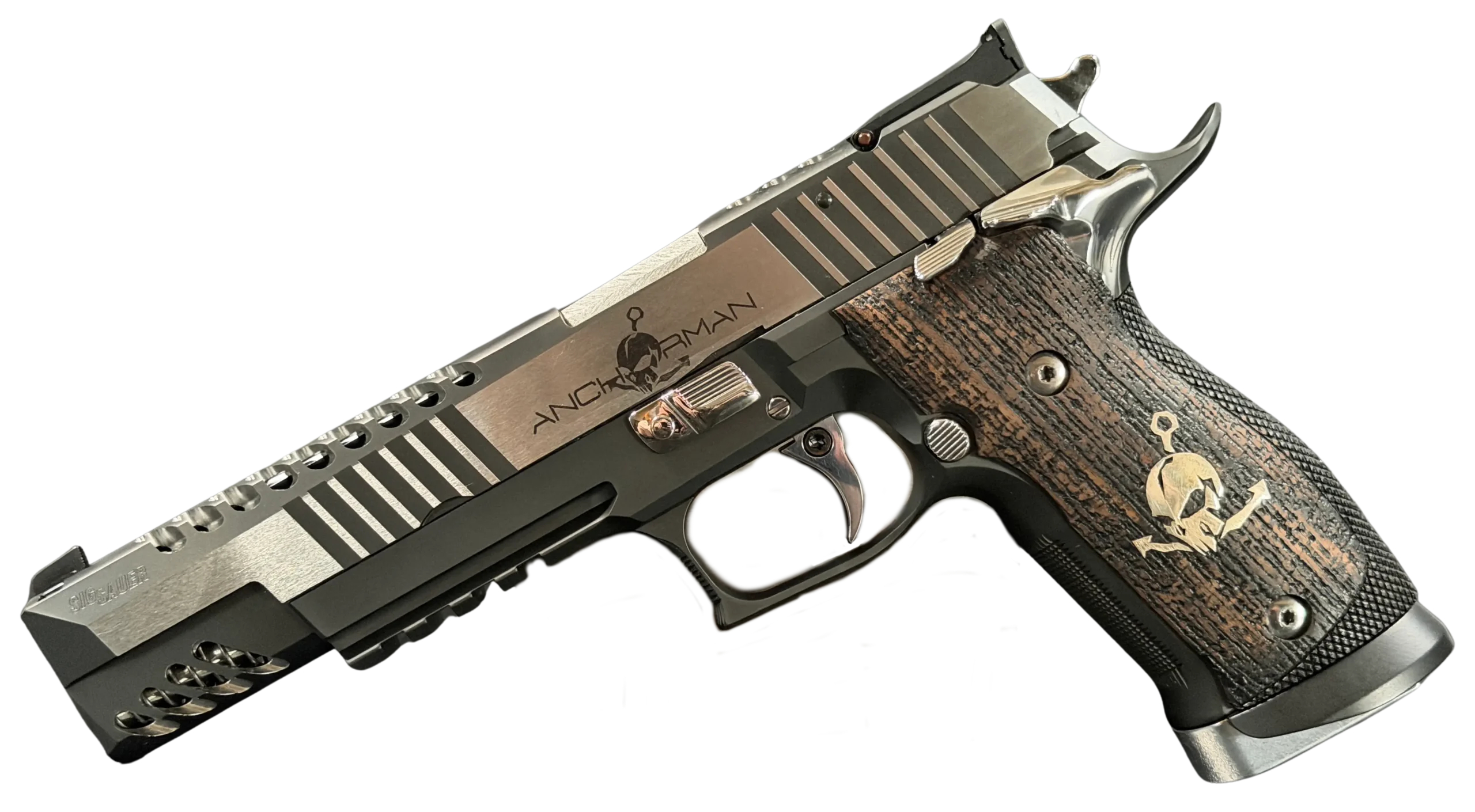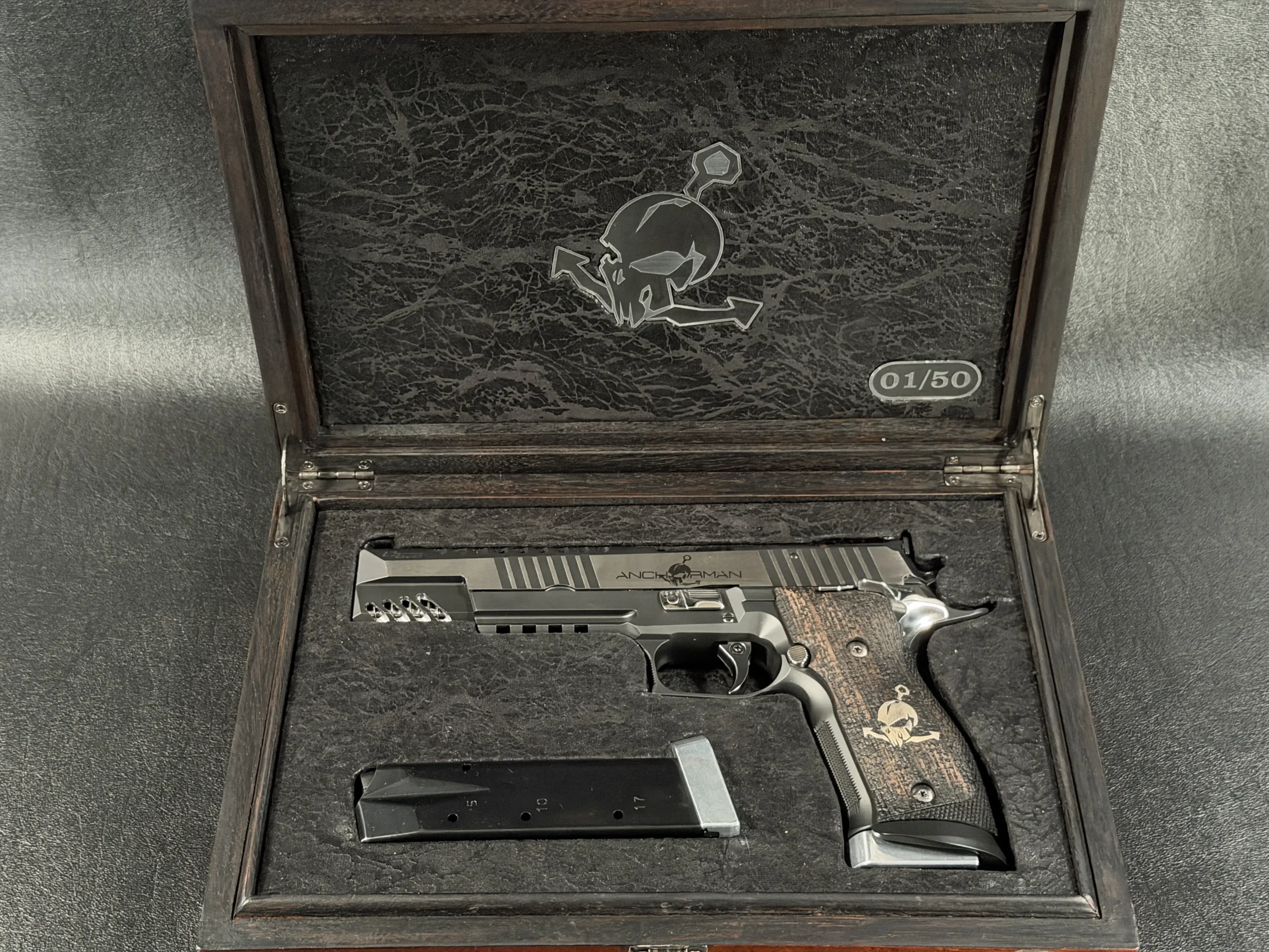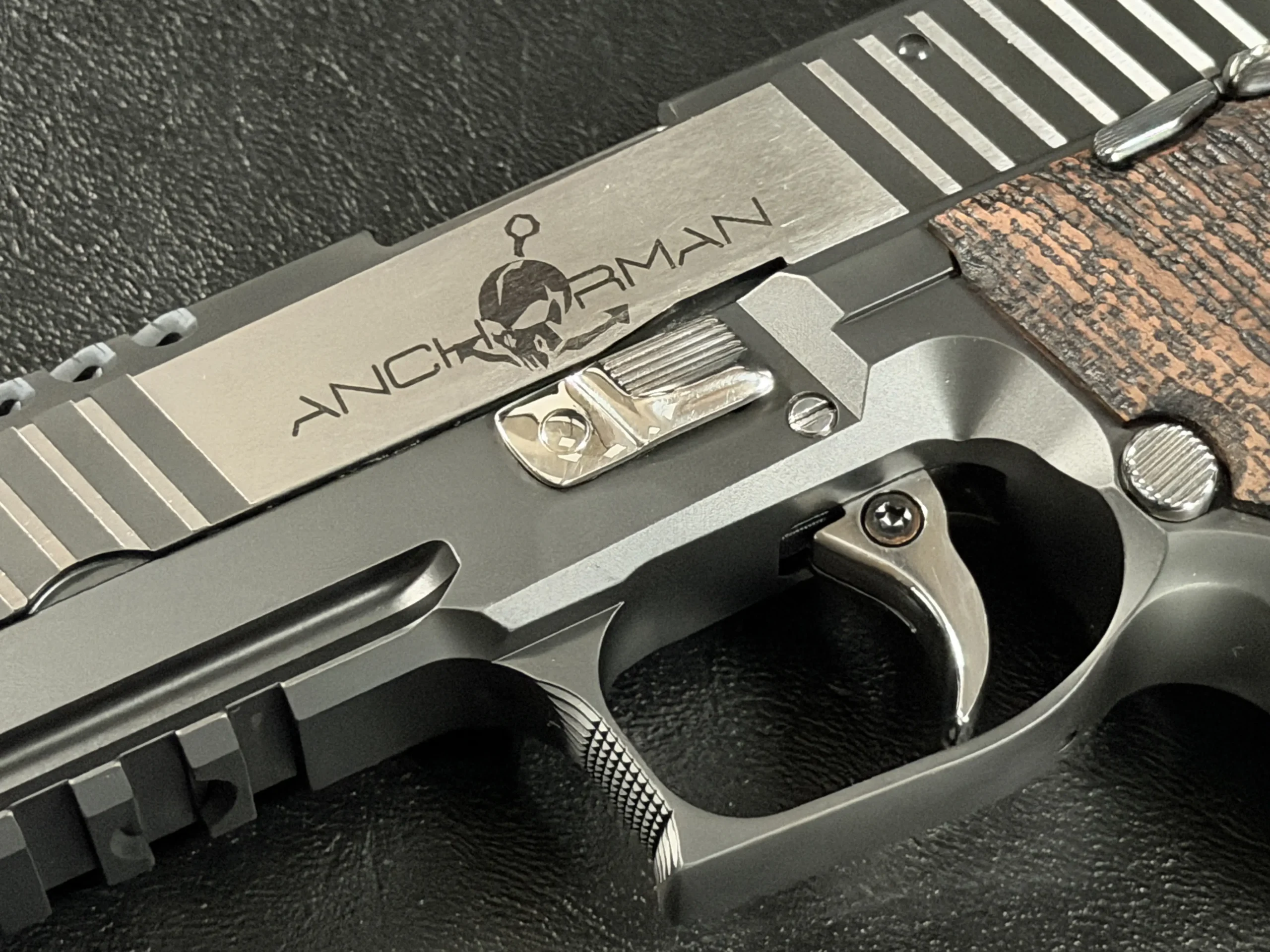 It features a sculpted two-tone slide with porting, precision-cut serrations, and Anchorman emblem engraving. The custom wood grips are inlaid with the Anchorman insignia, while polished accents on the trigger, hammer, controls, and magwell add to the presentation.