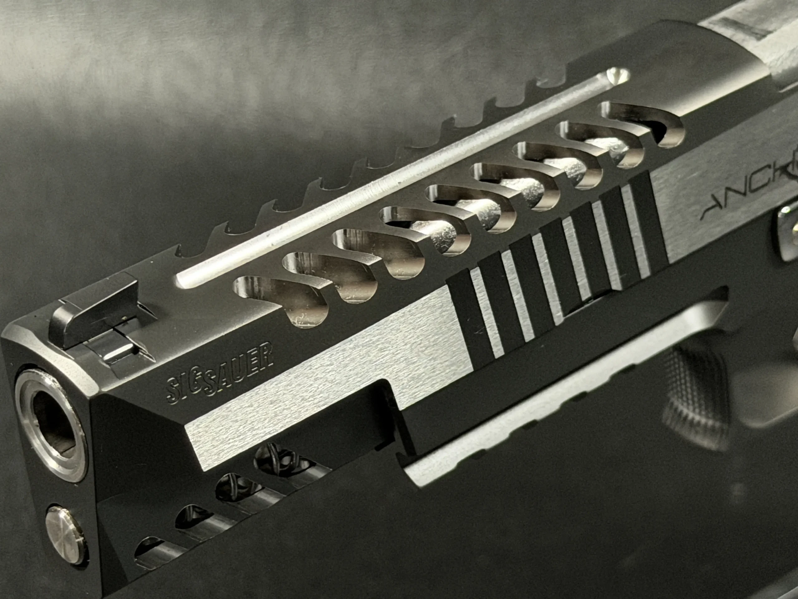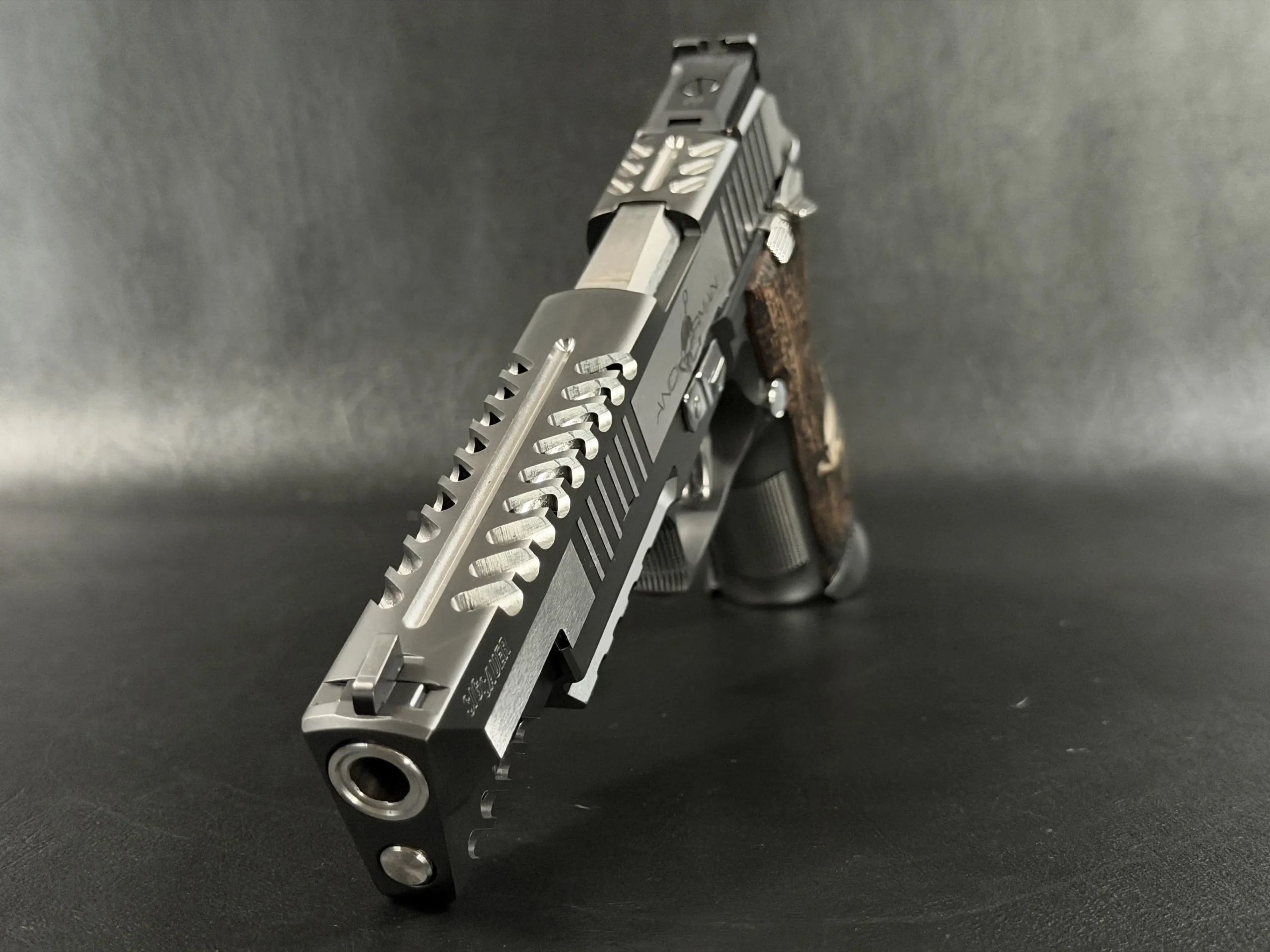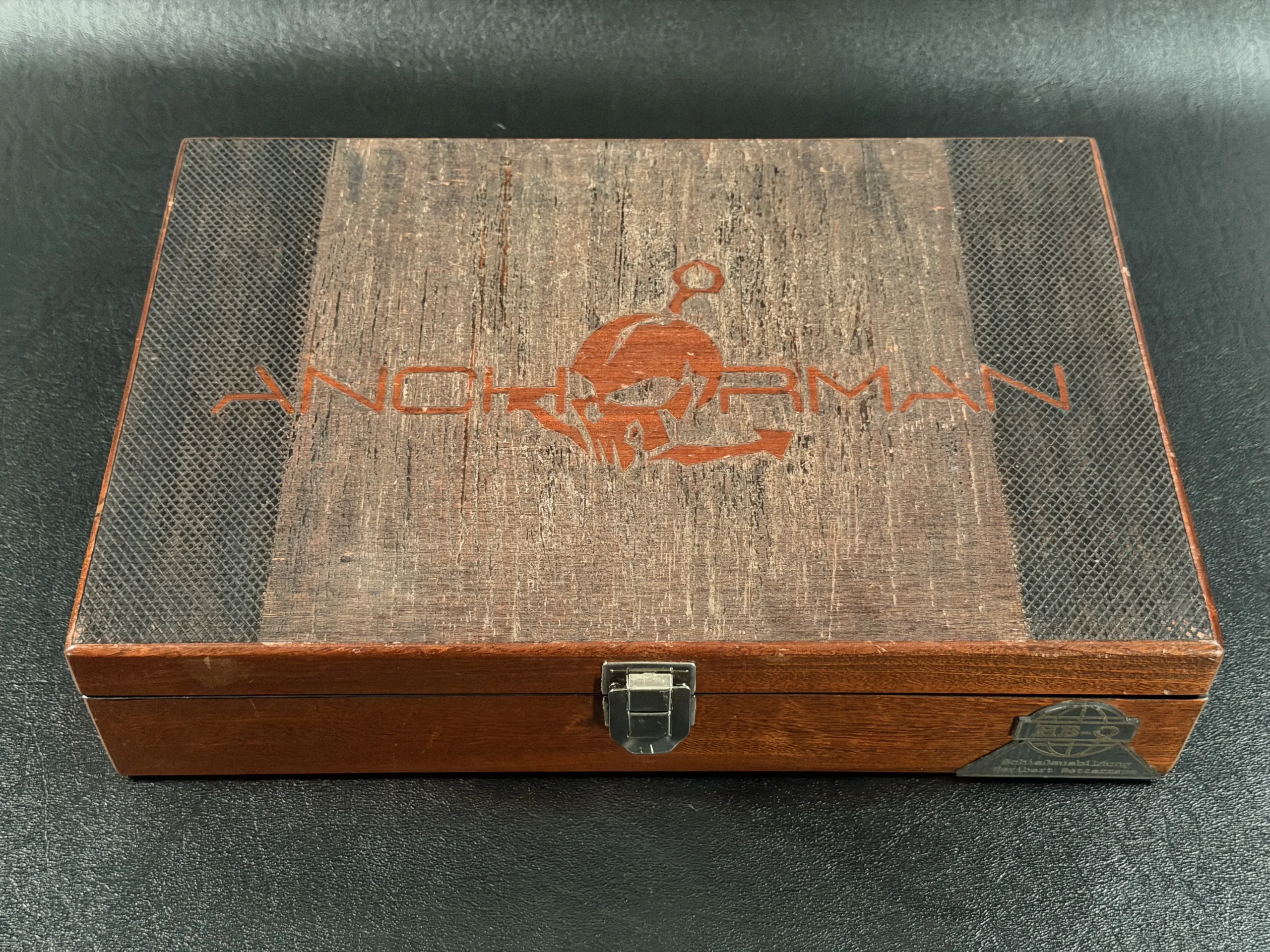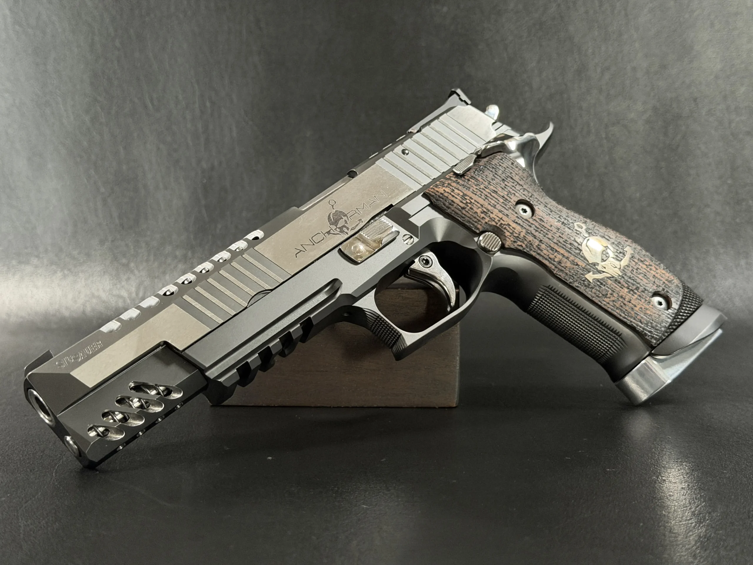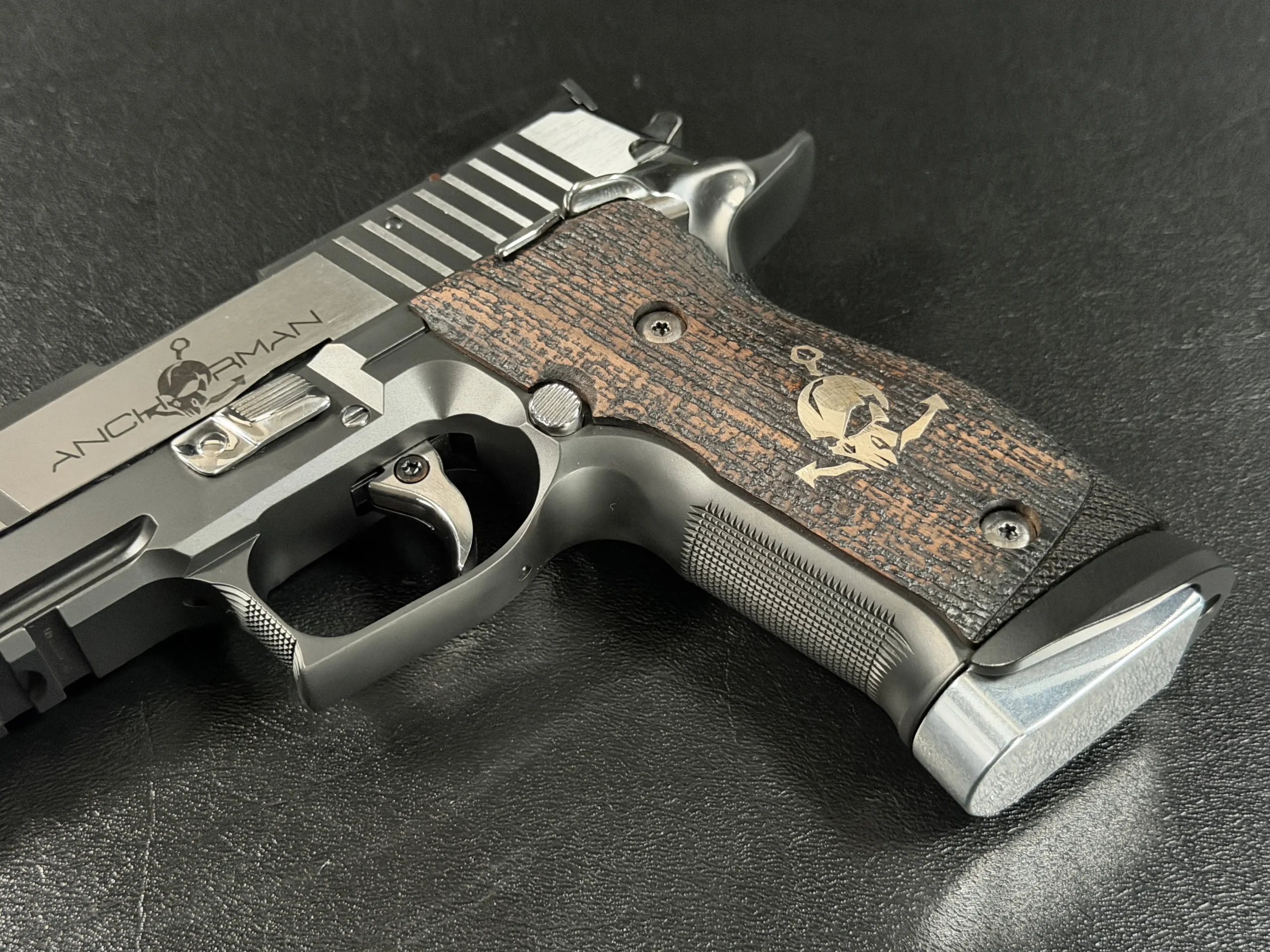 It features a sculpted two-tone slide with porting, precision-cut serrations, and Anchorman emblem engraving. The custom wood grips are inlaid with the Anchorman insignia, while polished accents on the trigger, hammer, controls, and magwell add to the presentation.
