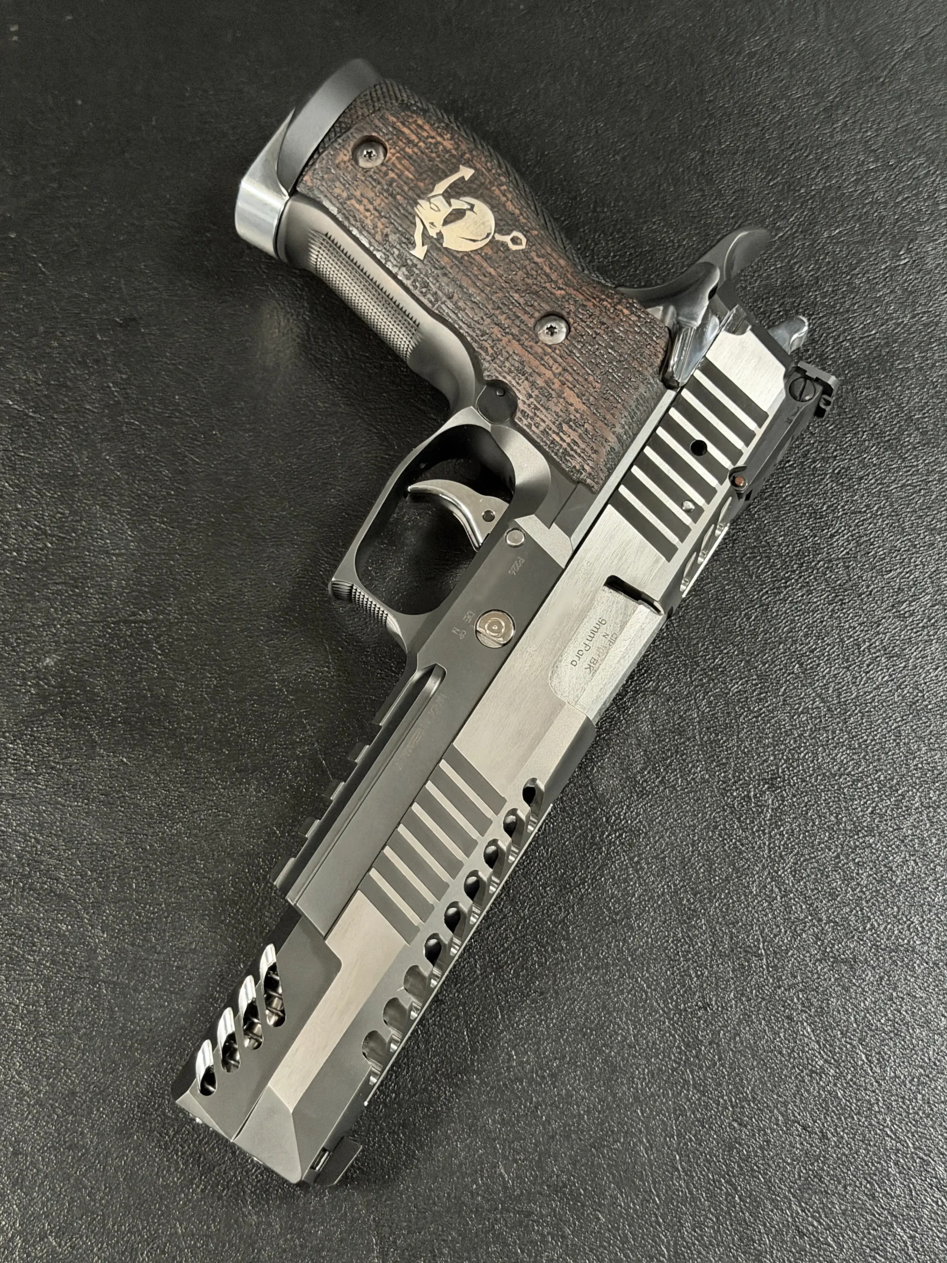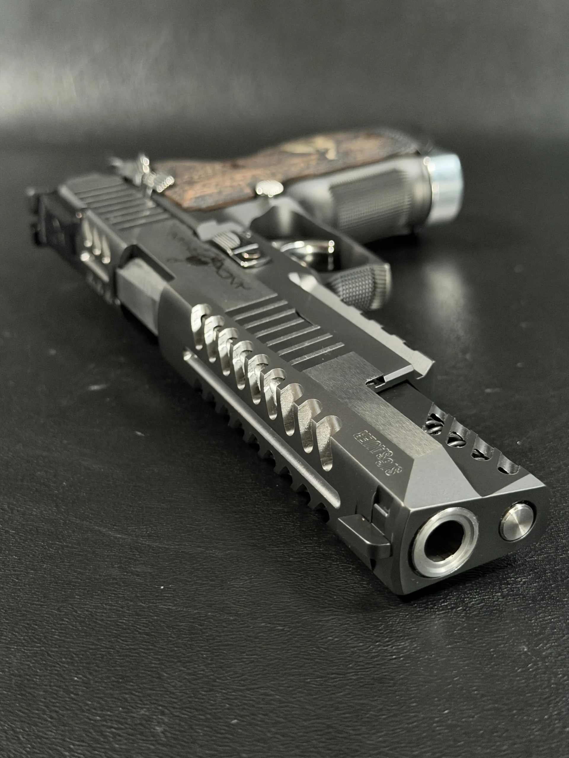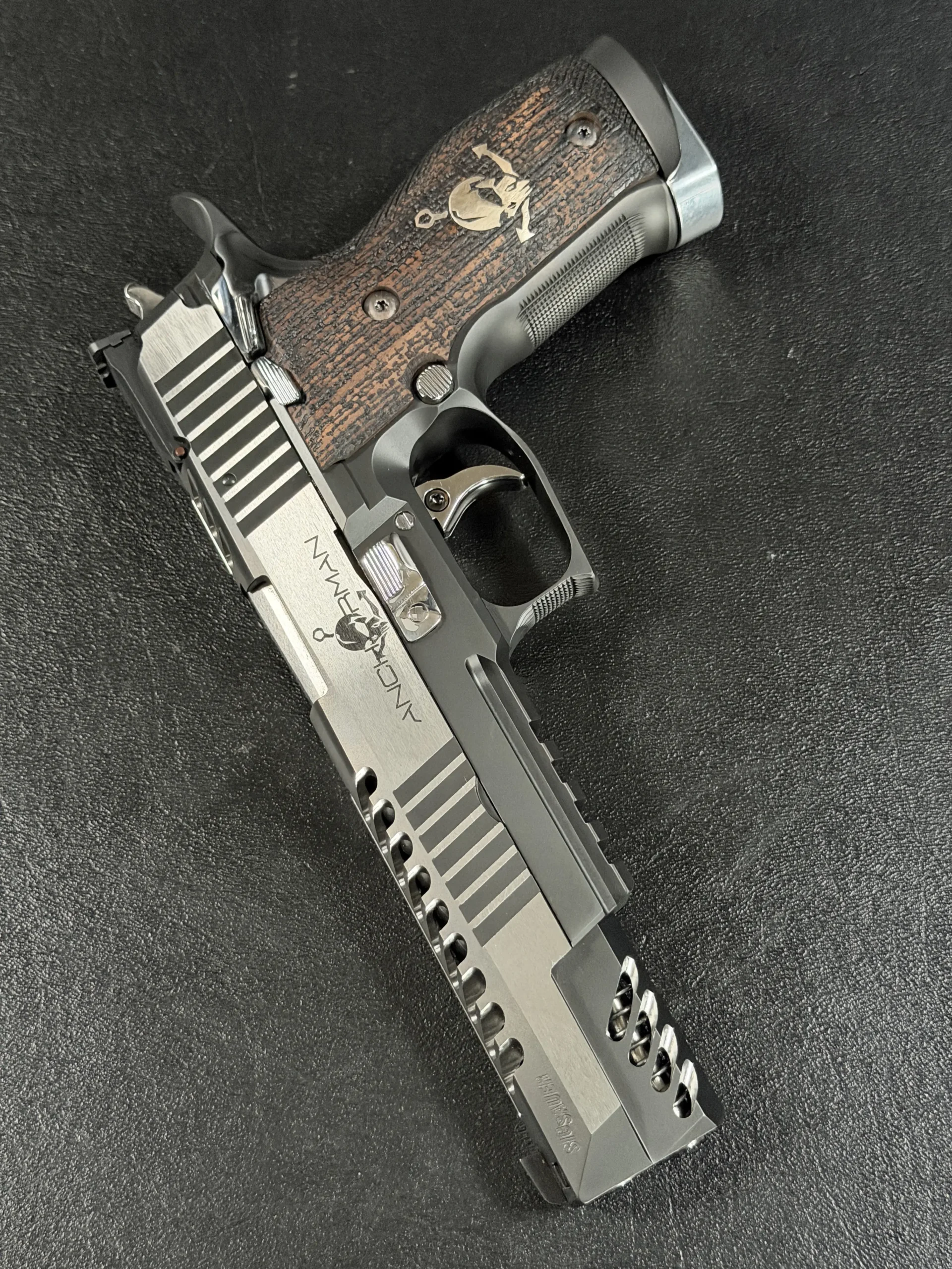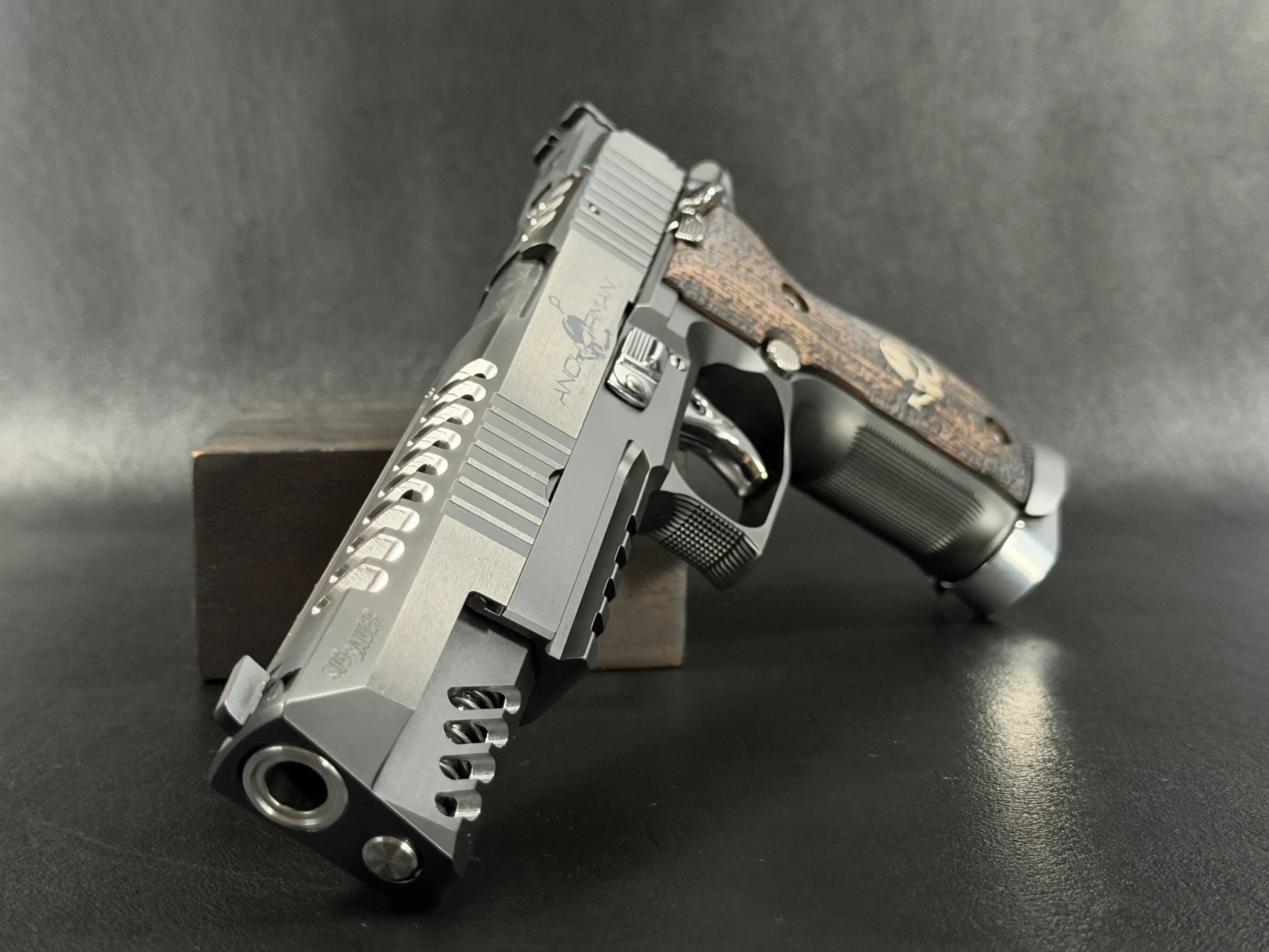 It features a sculpted two-tone slide with porting, precision-cut serrations, and Anchorman emblem engraving. The custom wood grips are inlaid with the Anchorman insignia, while polished accents on the trigger, hammer, controls, and magwell add to the presentation.