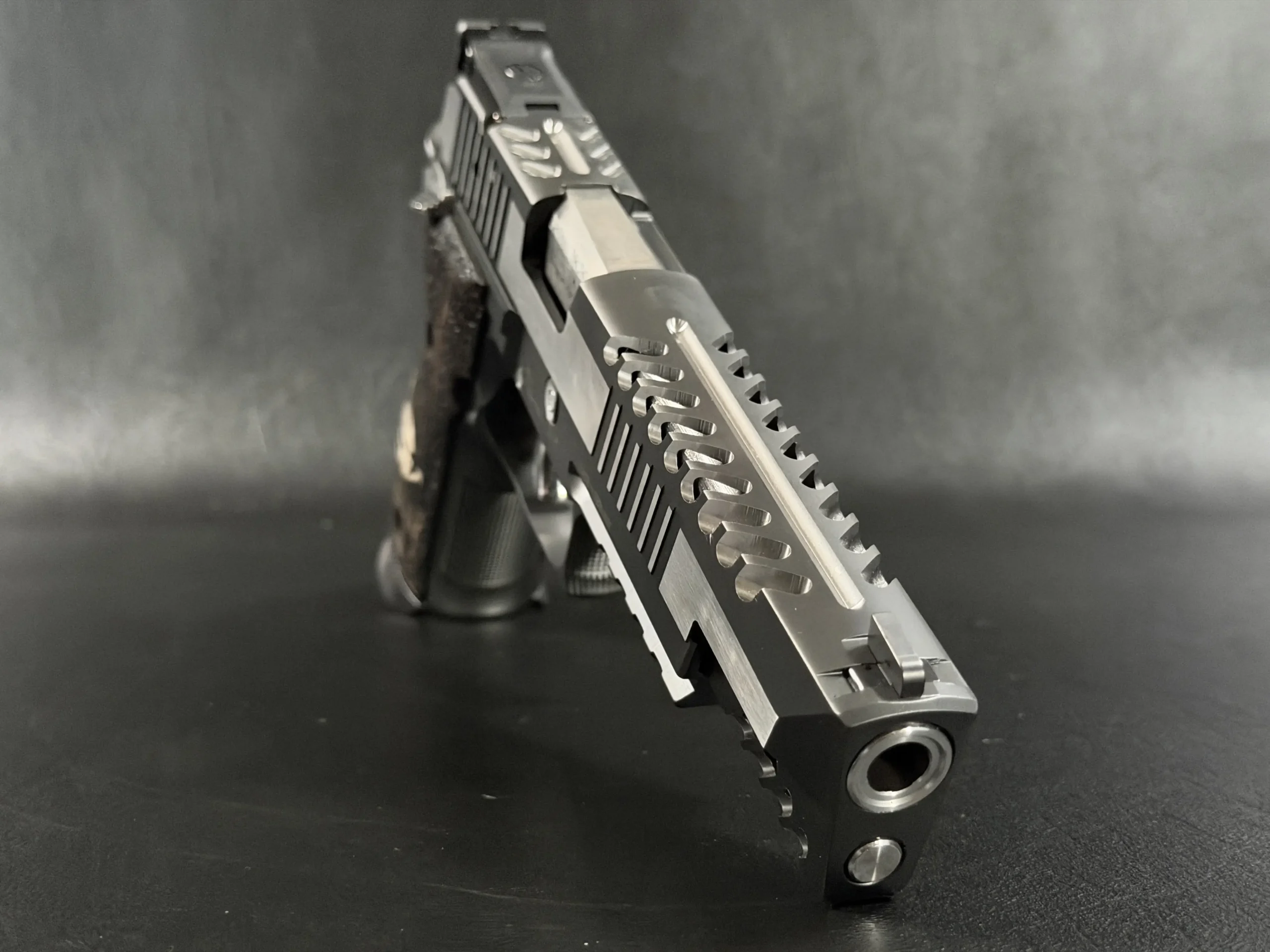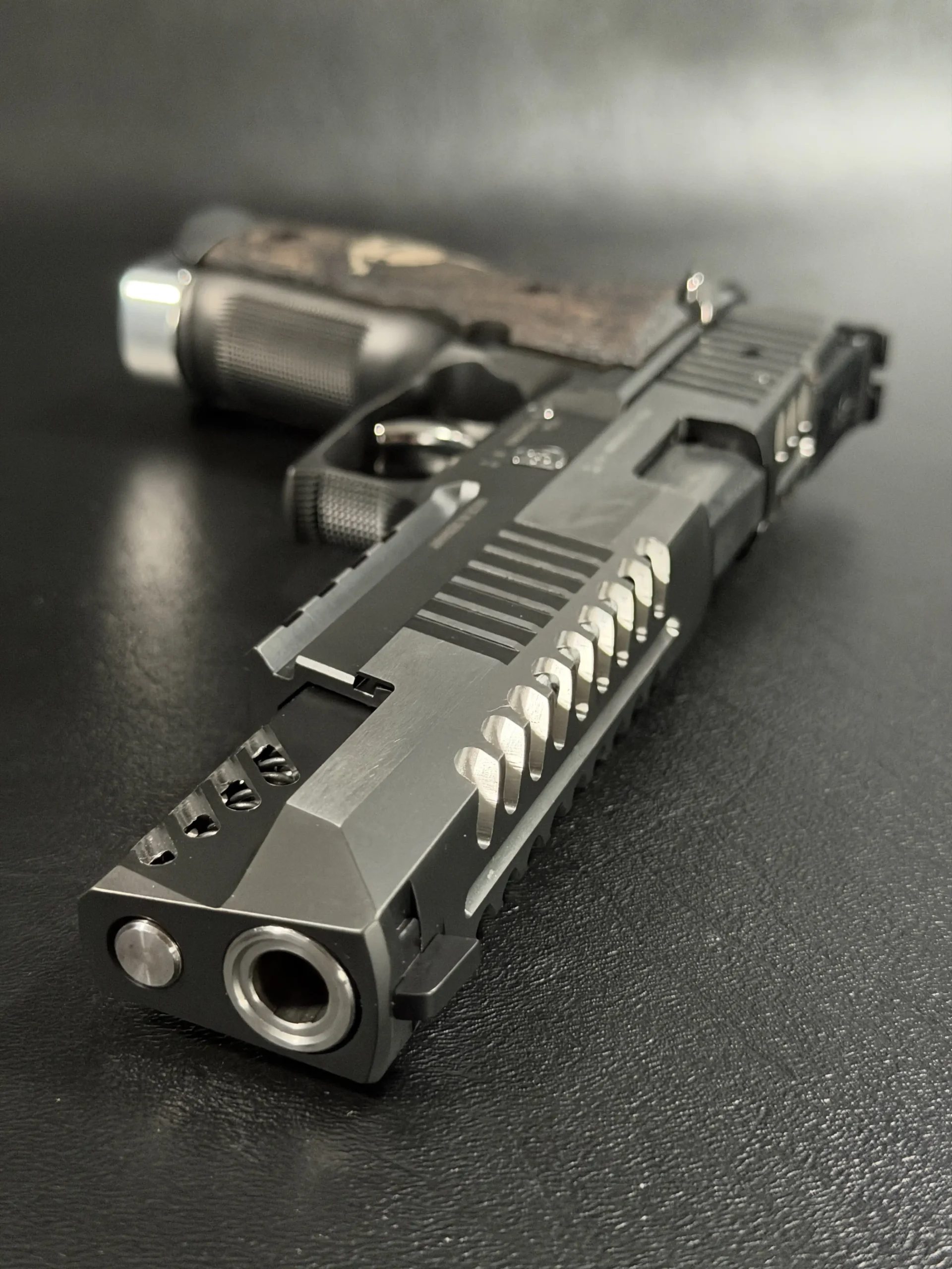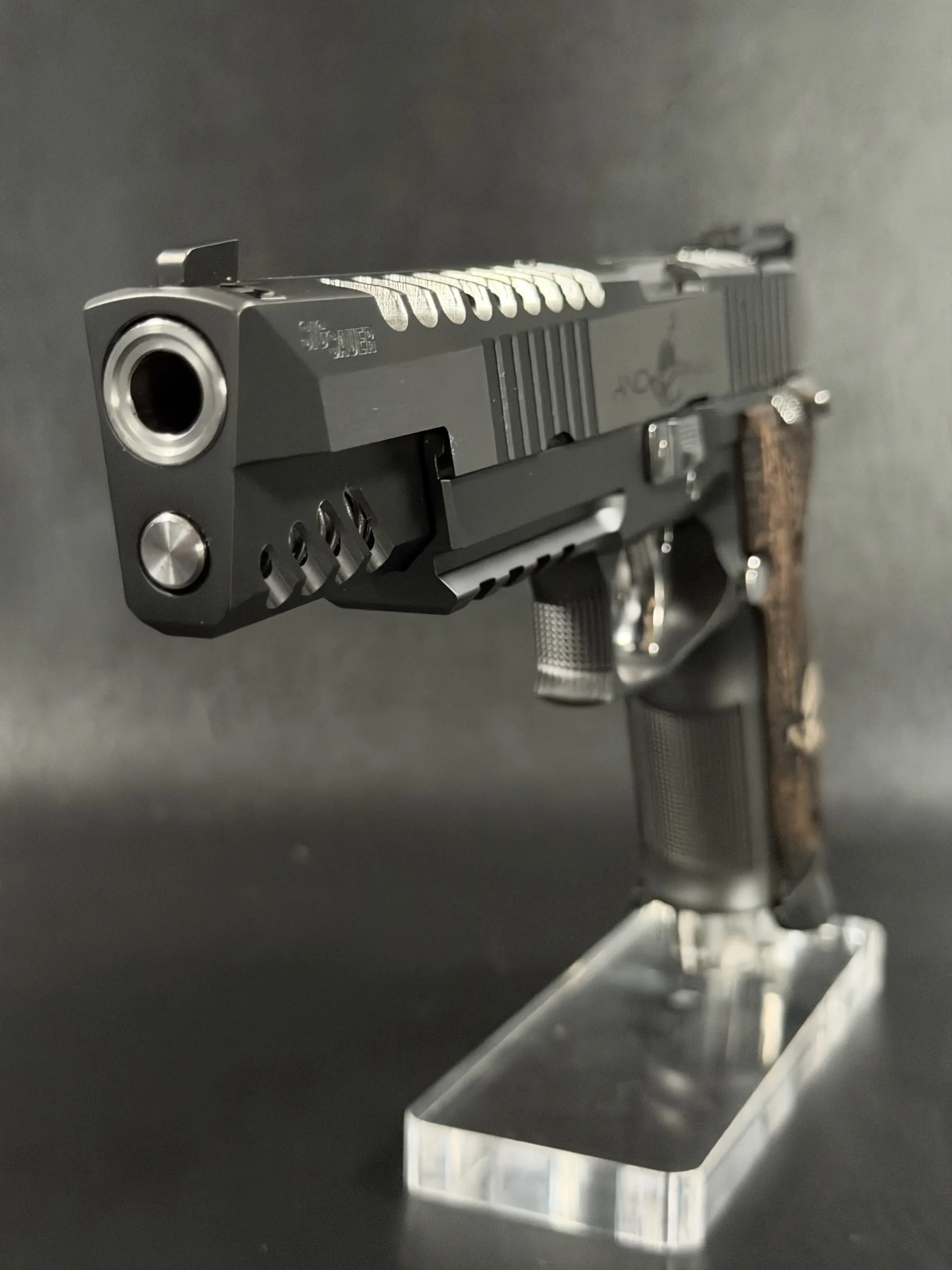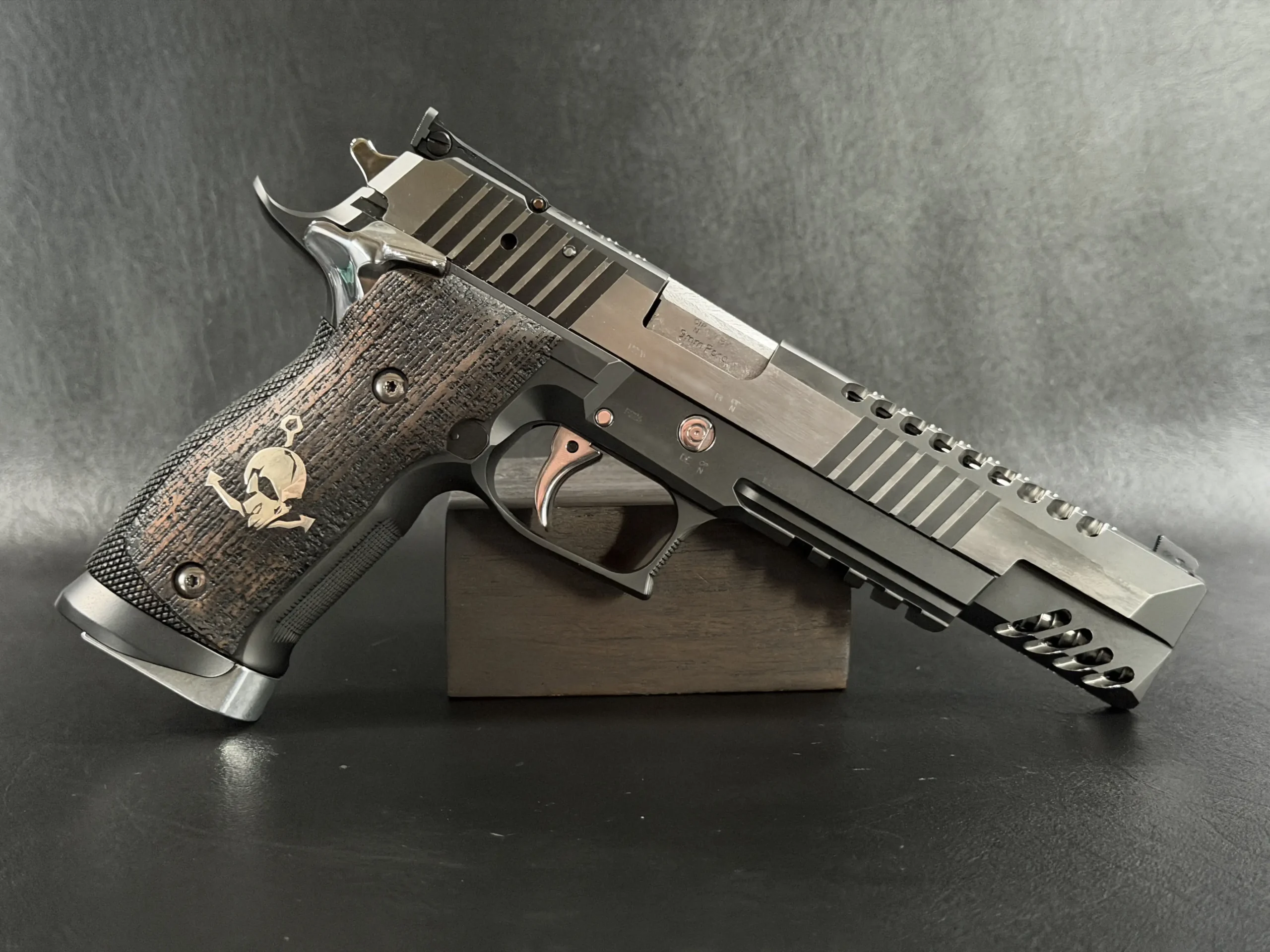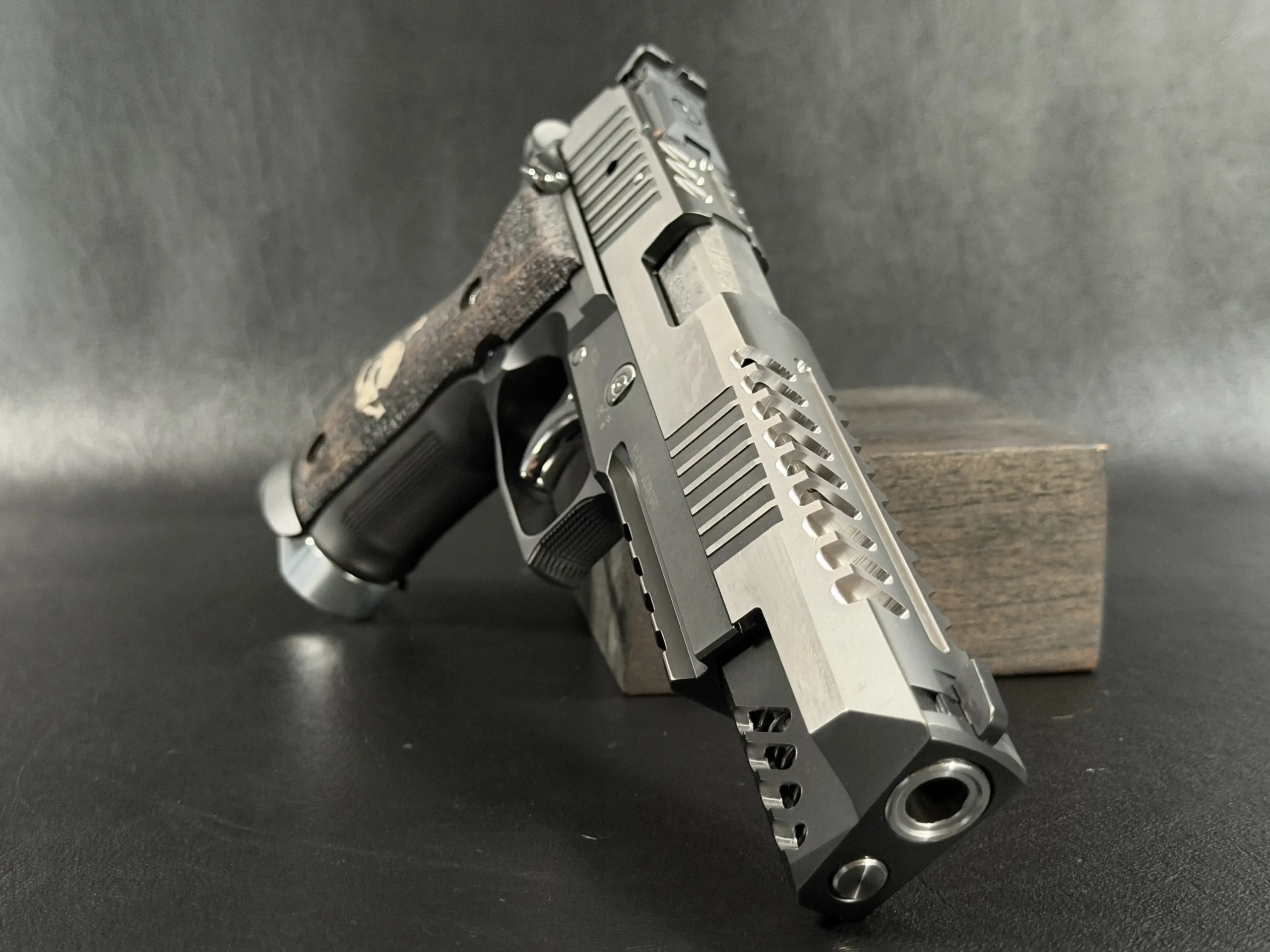 It features a sculpted two-tone slide with porting, precision-cut serrations, and Anchorman emblem engraving. The custom wood grips are inlaid with the Anchorman insignia, while polished accents on the trigger, hammer, controls, and magwell add to the presentation.