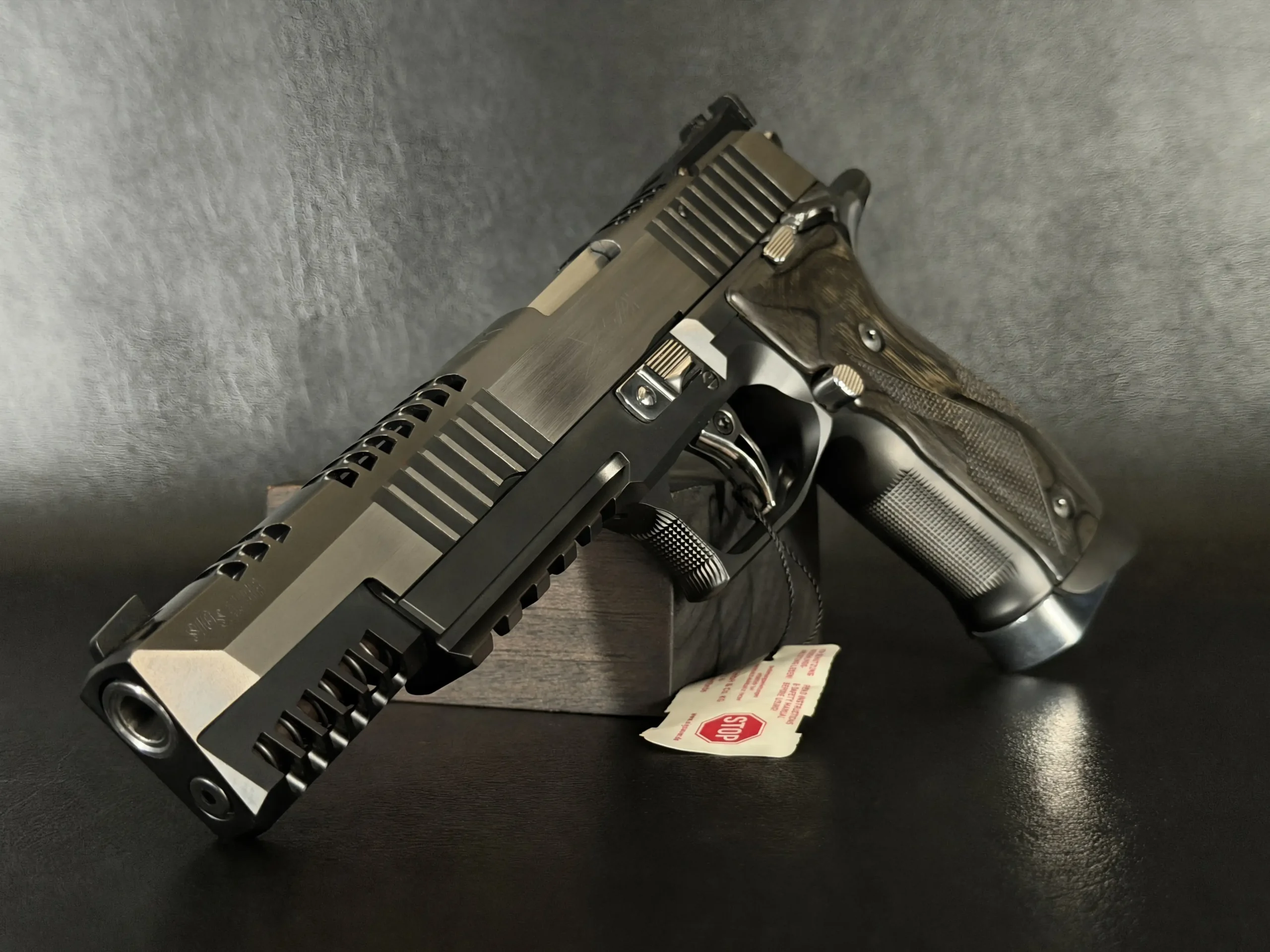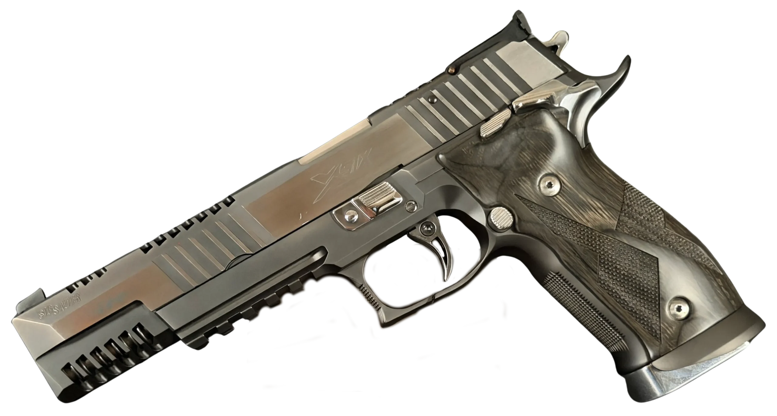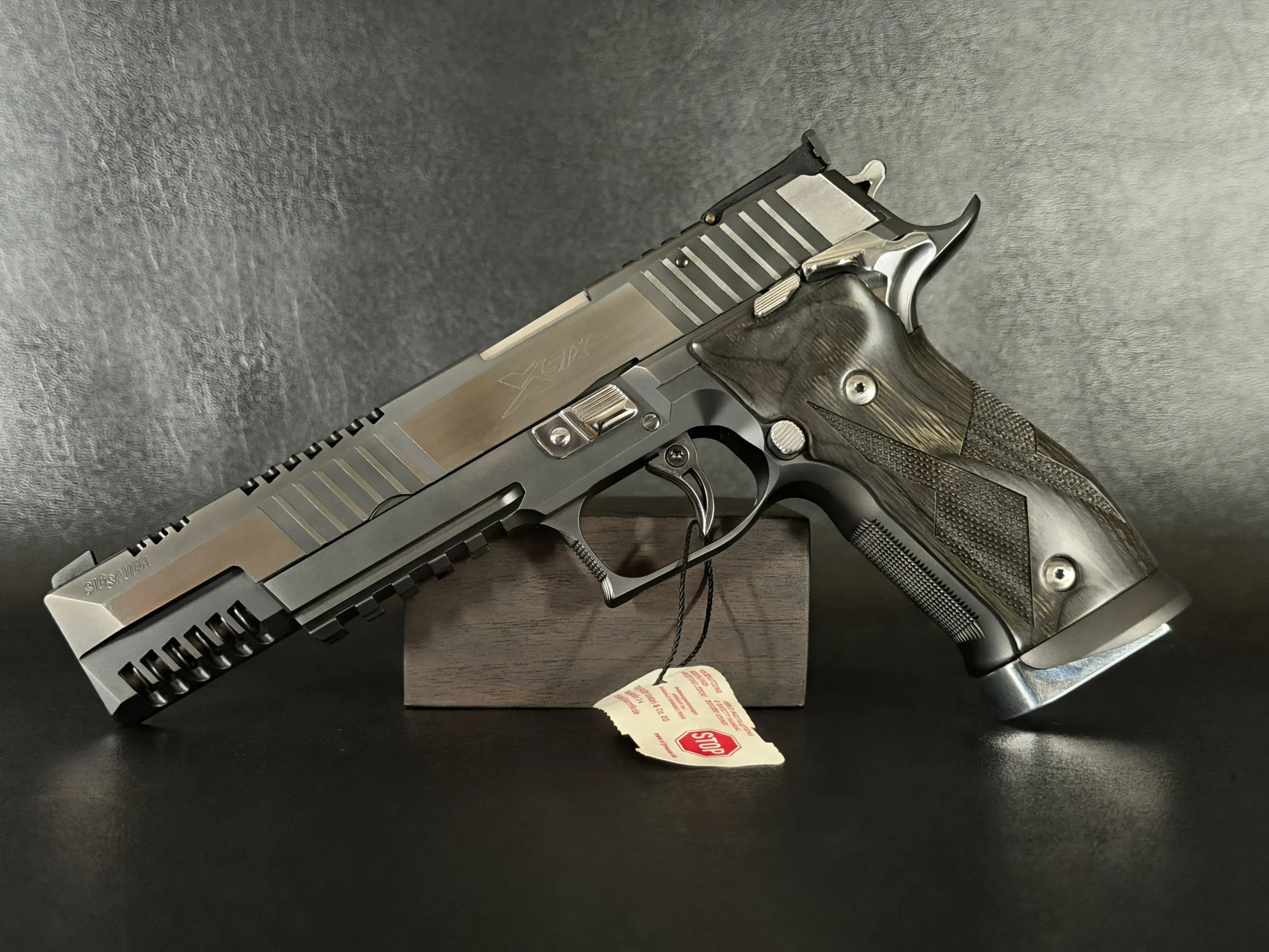SIG Sauer P226 X-Six Black & White Skeleton chambered in 9mm, built in the Mastershop tradition. This long-slide variant features a black-and-white two-tone finish, skeletonized slide cuts, porting, ergonomic controls, and a polished trigger.