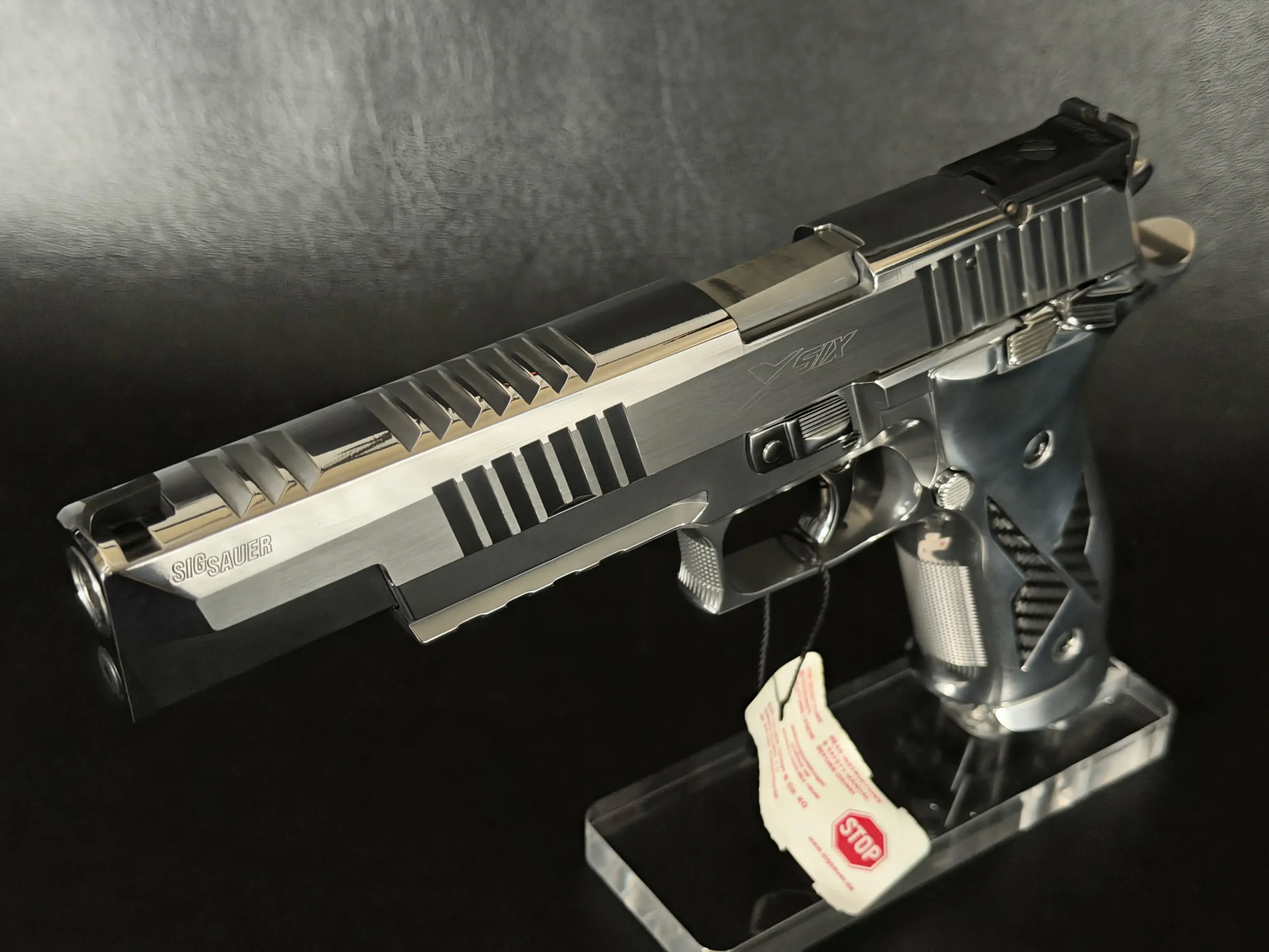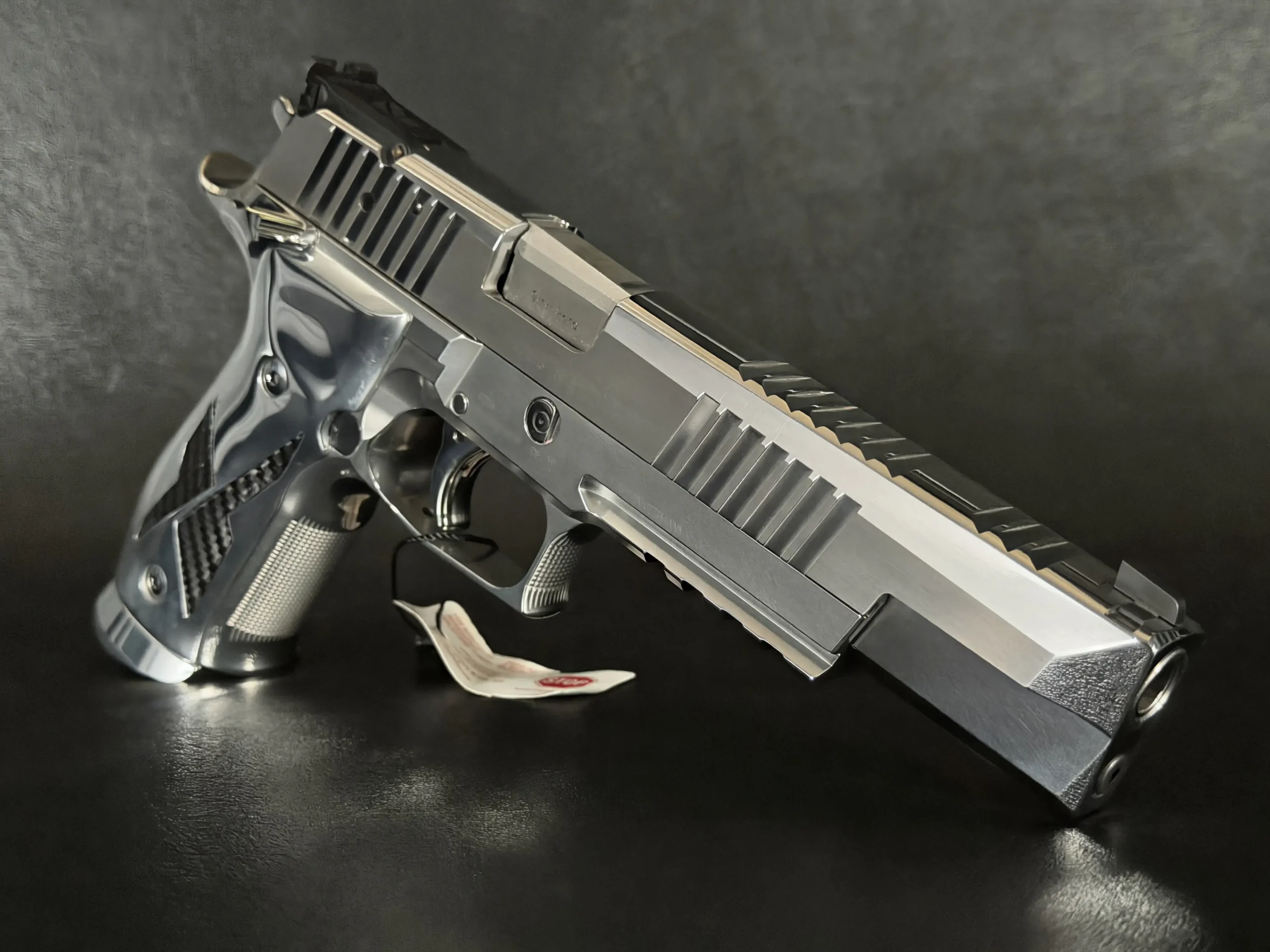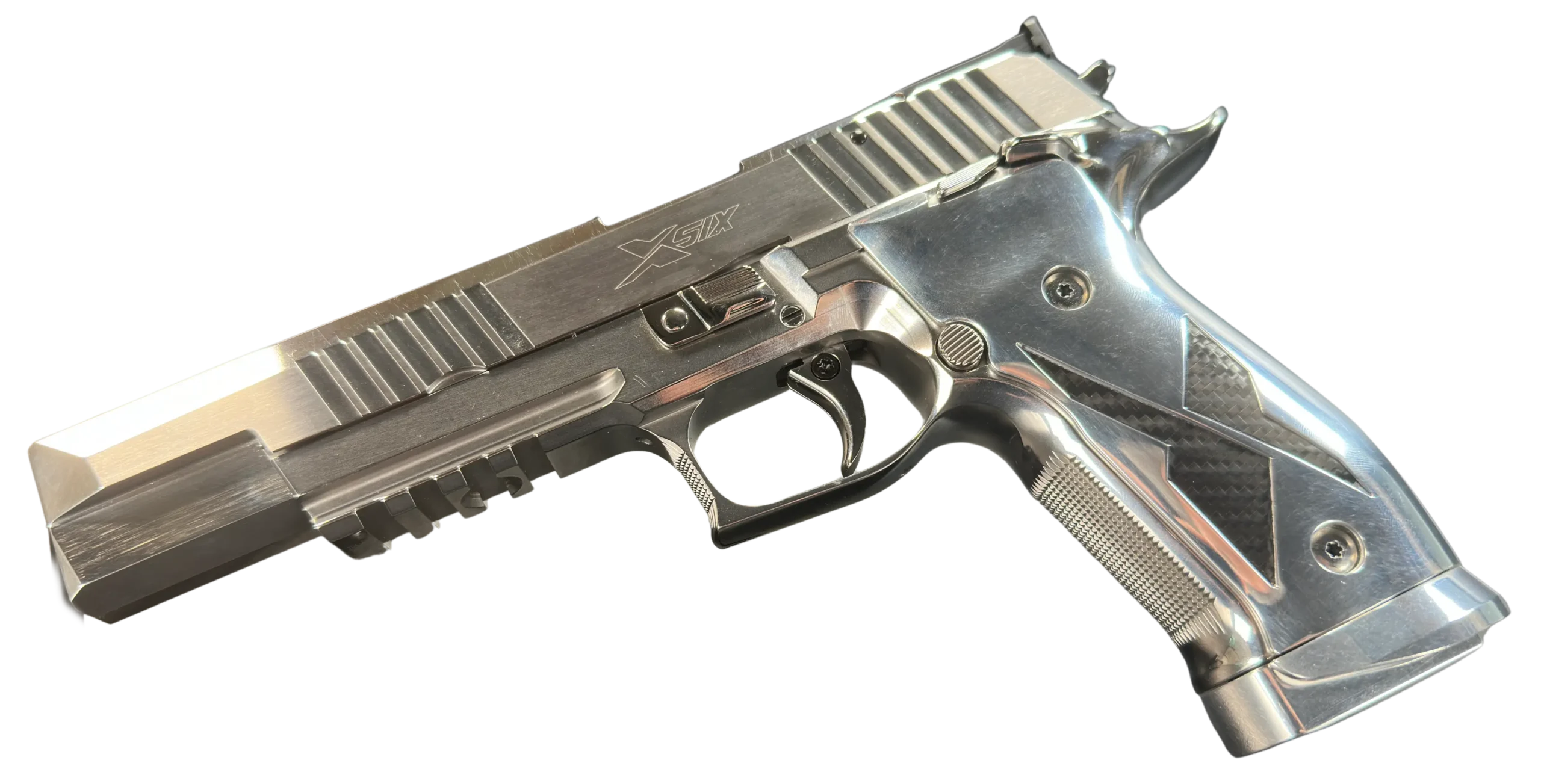 Carbon-fiber grip panels add a modern visual counterpoint to the chrome metalwork and complement the pistol’s ergonomic design. A single-action trigger, extended controls, and a competition-style sighting setup reflect the X-Six platform’s target-shooting orientation.